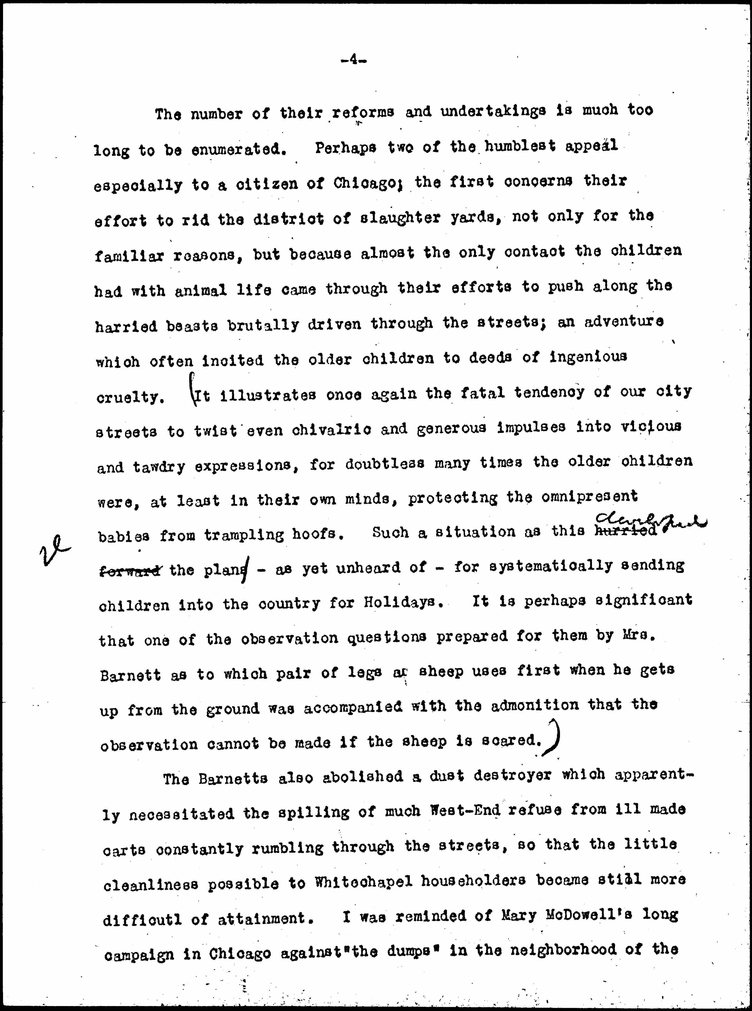 The number of their reforms and undertakings is much too long to be enumerated. Perhaps two of the humblest appeal especially to a citizen of Chicago; the first concerns their effort to rid the district of slaughter yards, not only for the familiar reasons, but because almost the only contact the children had with animal life came through their efforts to push along the harried beasts brutally driven through the streets; an adventure which often incited the older children to deeds of ingenious cruelty. ↑(↓It illustrates once again the fatal tendency of our city streets to twist even chivalric and generous impulses into vicious and tawdry expressions, for doubtless many times the older children were, at least in their own minds, protecting the omnipresent babies from trampling hoofs. Such a situation as this hurried forward ↑developed↓ the plan -- as yet unheard of -- for systematically sending children into the country for Holidays. It is perhaps significant that one of the observation questions prepared for them by Mrs. Barnett as to which pair of legs a sheep uses first when he gets up from the ground was accompanied with the admonition that the observation cannot be made if the sheep is scared.↑)↓