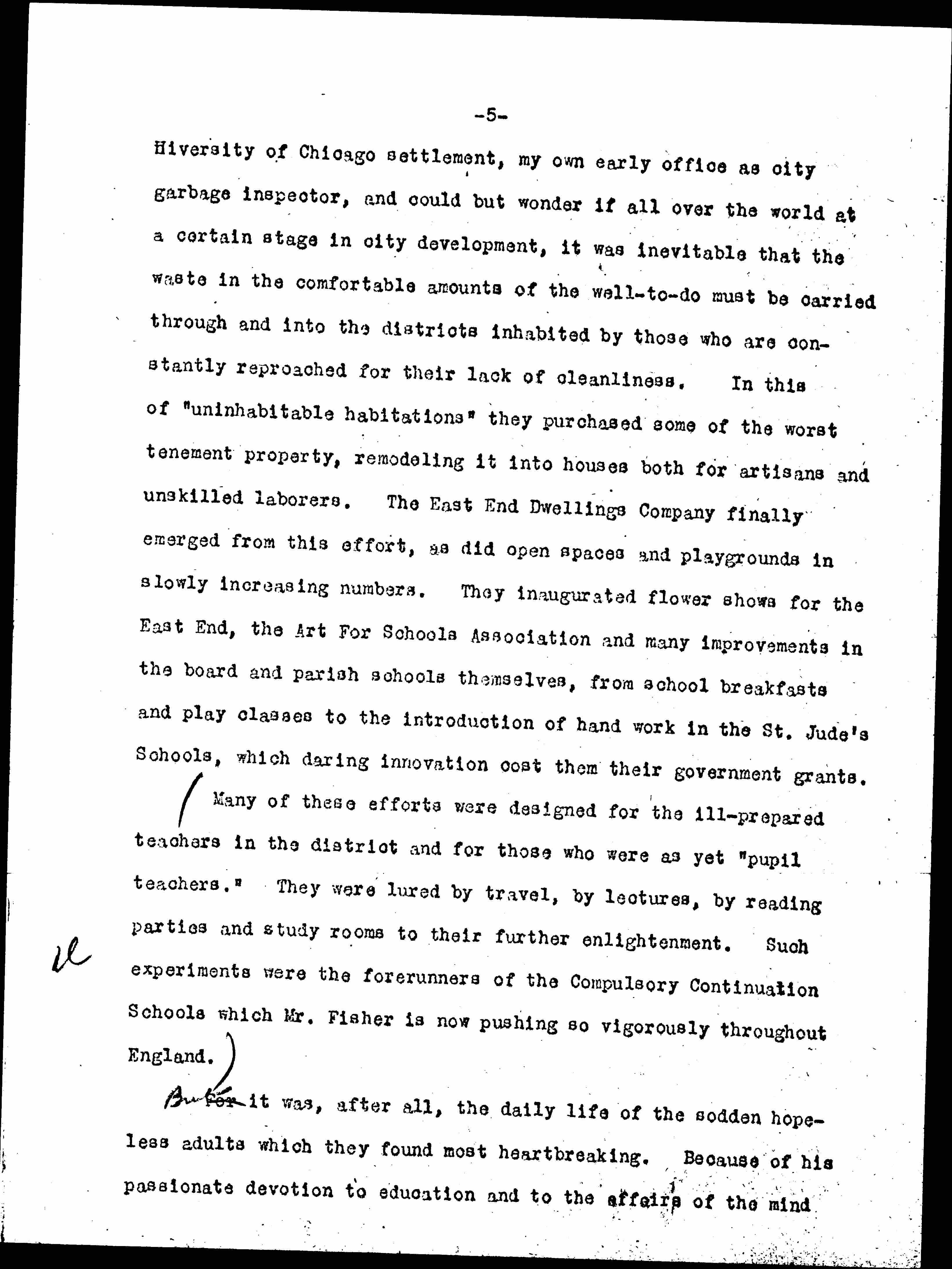 The Barnetts also abolished a dust destroyer which apparently necessitated the spilling of much West-End refuse from ill made carts constantly rumbling through the streets, so that the little cleanliness possible to Whitechapel householders became still more difficult of attainment. I was reminded of Mary McDowell's long campaign in Chicago against "the dumps" in the neighborhood of the [page 5] University of Chicago settlement, my own early office as city garbage inspector, and could but wonder if all over the world at a certain stage in city development, it was inevitable that the waste in the comfortable amounts of the well-to-do must be carried through and into the districts inhabited by those who are constantly reproached for their lack of cleanliness. In this of "uninhabitable habitations" they purchased some of the worst tenement property, remodeling it into houses for both artisans and unskilled laborers. The East End Dwellings Company finally emerged from this effort, as did open spaces and playgrounds in slowly increasing numbers. They inaugurated flower shows for the East End, the Art for Schools Association and many improvements in the board and parish schools themselves, from school breakfasts and play classes to the introduction of hand work in the St. Jude's Schools, which daring innovation cost them their government grants.