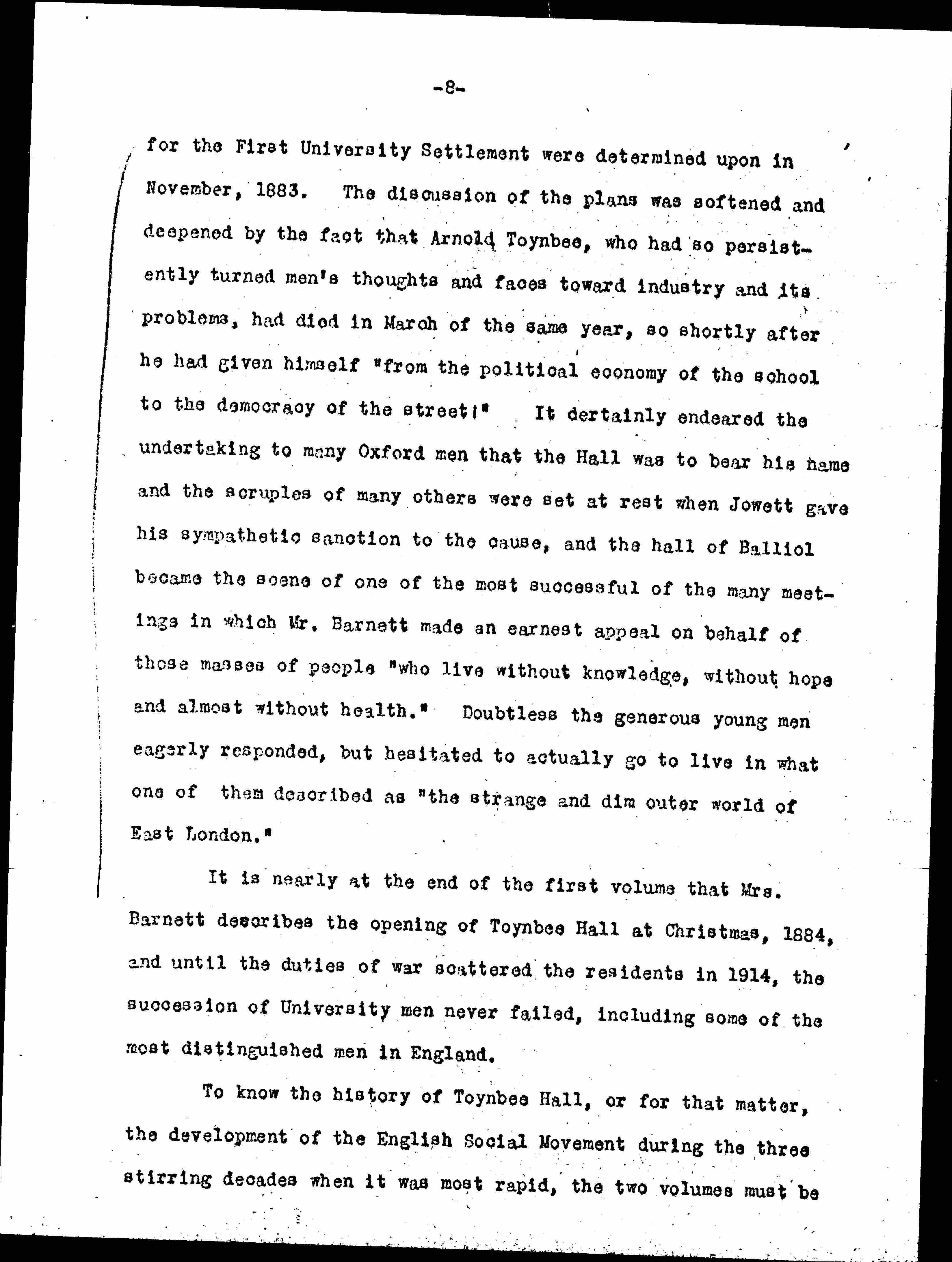 ↑)↓Sidney Ball, in his own rooms in Wadhams which had belonged to Arnold Toynbee and still constituted a center for much spirited, philosophic and economic talk, once told me of those stirring days in Oxford when he and his friends "swam on the crest of a sanguine adventure." It was in these rooms that the plans [page 8] for the First University Settlement were determined upon in November, 1883. The discussion of the plans was softened and deepened by the fact that Arnold Toynbee, who had so persistently turned men's thoughts and faces toward industry and its problems, had died in March of the same year, so shortly after he had given himself "from the political economy of the school to the democracy of the street." It certainly endeared the undertaking to many Oxford men that the Hall was to bear his name and the scruples of many others were set at rest when Jowett gave his sympathetic sanction to the cause, and the hall of Balliol became the scene of one of the most successful of the many meetings in which Mr. Barnett made an earnest appeal on behalf of those masses of people "who live without knowledge, without hope and almost without health." Doubtless the generous young men eagerly responded, but hesitated to actually go to live in what one of them described as "the strange and dim outer world of East London."↑)↓