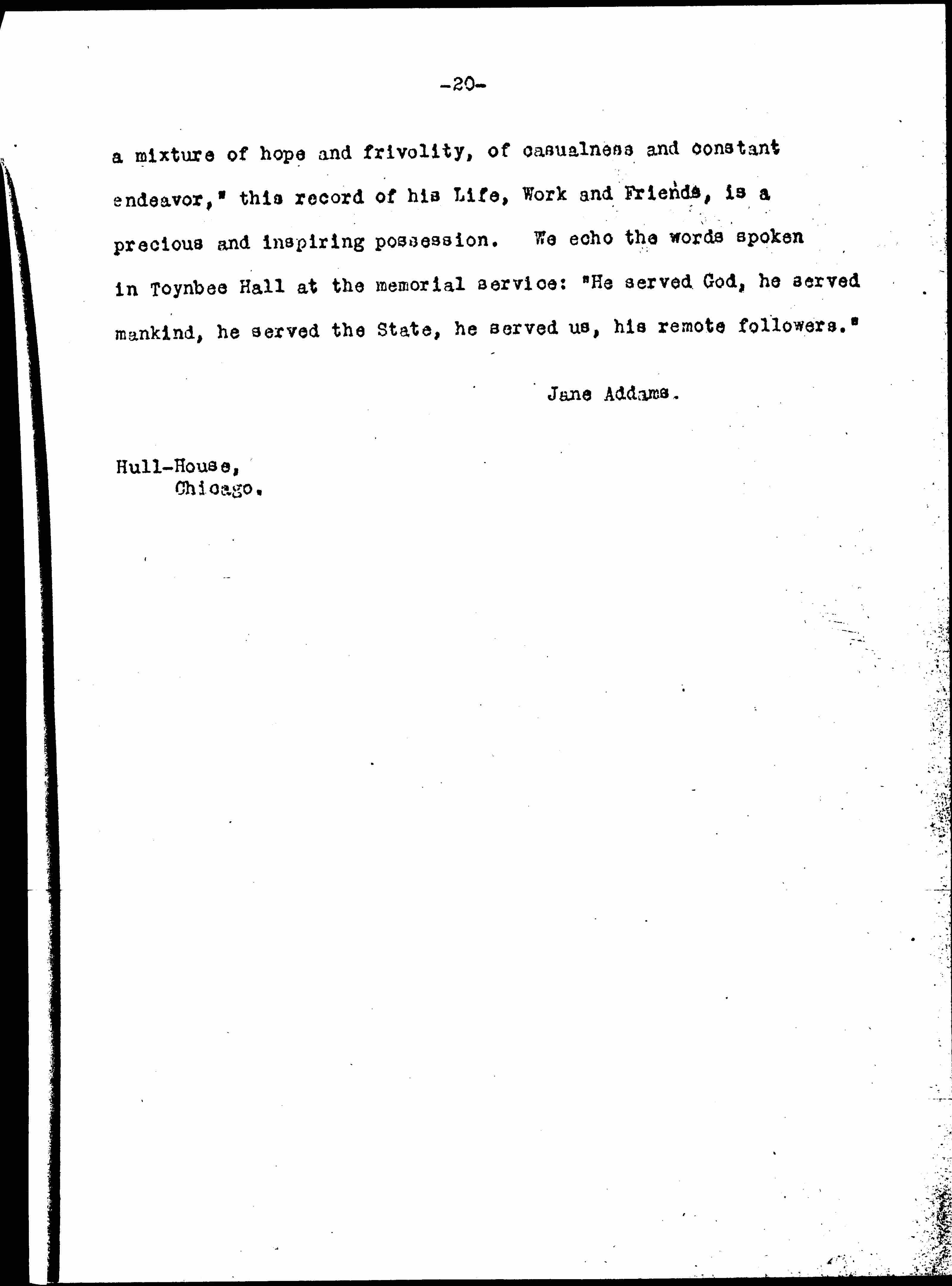 To those of us in America to whom he was once the background and strong support of "Settlement life which is so curious [page 20] a mixture of hope and frivolity, of casualness and constant endeavor," this record of his Life, Work and Friends, is a precious and inspiring possession. We echo the words spoken in Toynbee Hall at the memorial service: "He served God, he served mankind, he served the State, he served us, his remote followers."