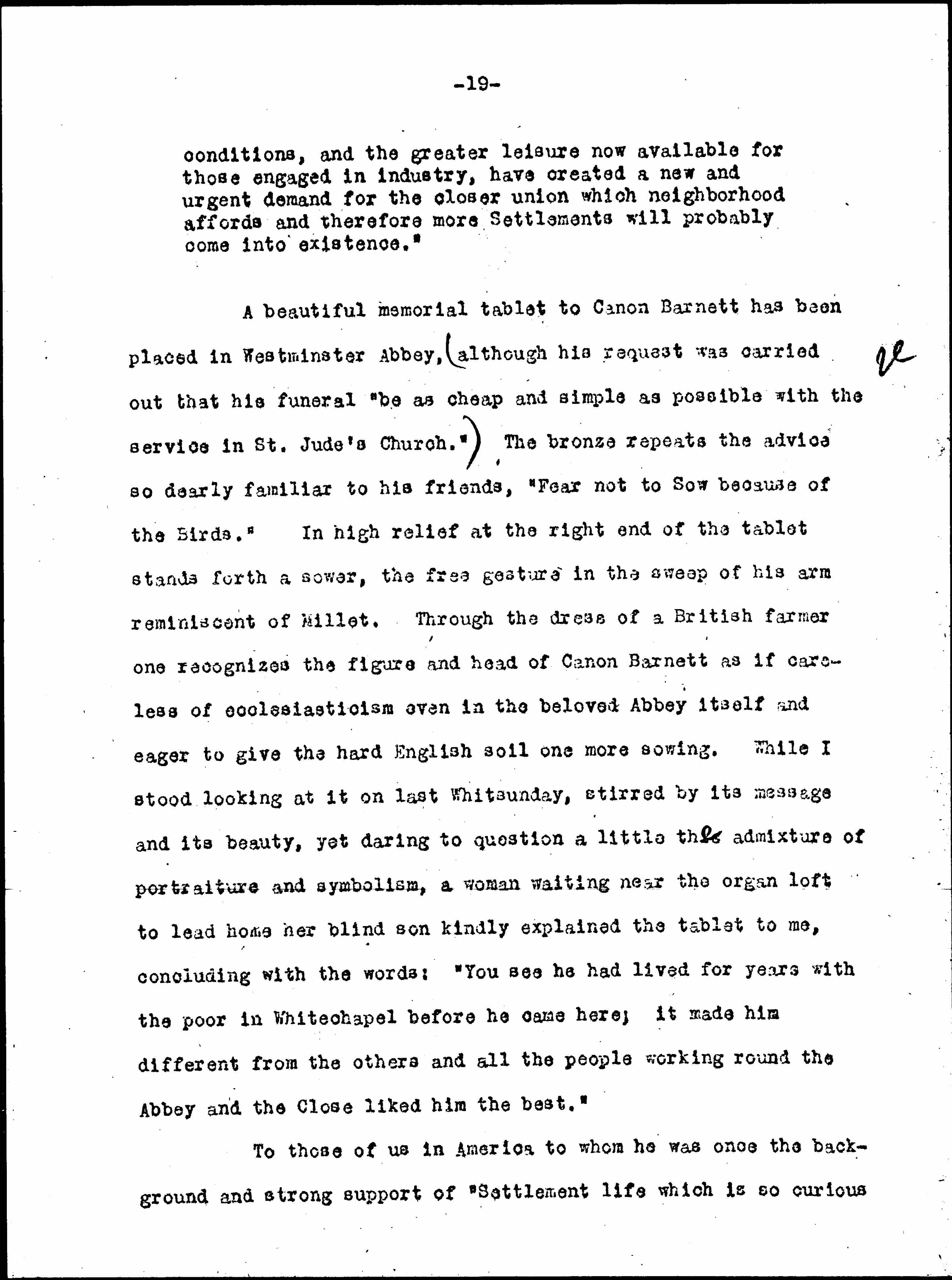 [written in the margin left of this paragraph] ↑3↓ Something of this characteristic of his is embodied in Barnett House, the memorial erected to his memory in the midst of the old established colleges at Oxford ↑2↓. There is a great vitality about it. ↑This is↓ expressed through the large groups of working men who come to utilize its library and its tutorial classes, through the vigorous Workers Educational Association whose Oxford headquarters for the groups scattered throughout the British Isles are housed there. It is all vaguely reminiscent, as the cap and gown dimly suggests the monk's habit, of the demand for knowledge, the breaking into sacred precincts by another class which years ago created the University itself. Is the present generation of Oxford men a little uneasy at times as their medieval predecessors had been in the presence of those minds "who find their [page 18] happiest exercise not along the beaten track but in self-guided speculation and inquiry"? ↑[illegible]↓ One finds no trace of such uneasiness in Barnett House, only a readiness to help forward every inquiring mind self-trained though it be, as if Canon Barnett's belief that "the revelation of God to our time comes by knowledge" was the orthodox creed of the House bearing his name, or was at least accepted as the dictum of a pious founder.