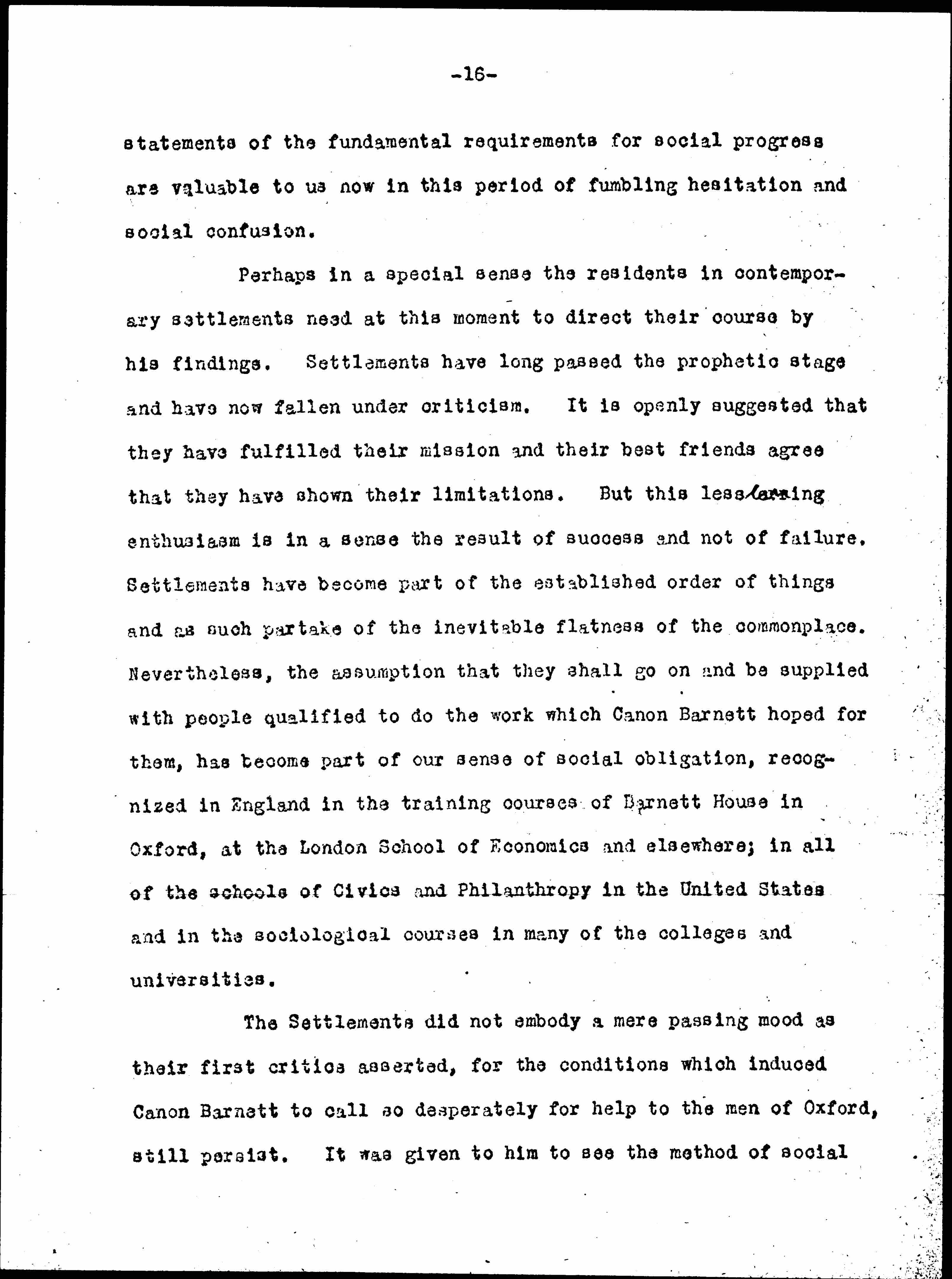 Perhaps in a special sense the residents in contemporary settlements need at this moment to direct their course by his findings. Settlements have long passed the prophetic stage and have now fallen under criticism. It is openly suggested that they have fulfilled their mission and their best friends agree that they have shown their limitations. But this less [caring] enthusiasm is in a sense the result of success and not of failure. Settlements have become part of the established order of things and as such partake of the inevitable flatness of the commonplace. Nevertheless, the assumption that they shall go on and be supplied with people qualified to do the work which Canon Barnett hoped for them, has become part of our sense of social obligation, recognized in England in the training courses at Barnett House in Oxford, the London School of Economics and elsewhere; in all of the schools of Civics and Philanthropy in the United States and in the sociological courses in many of the colleges and universities.