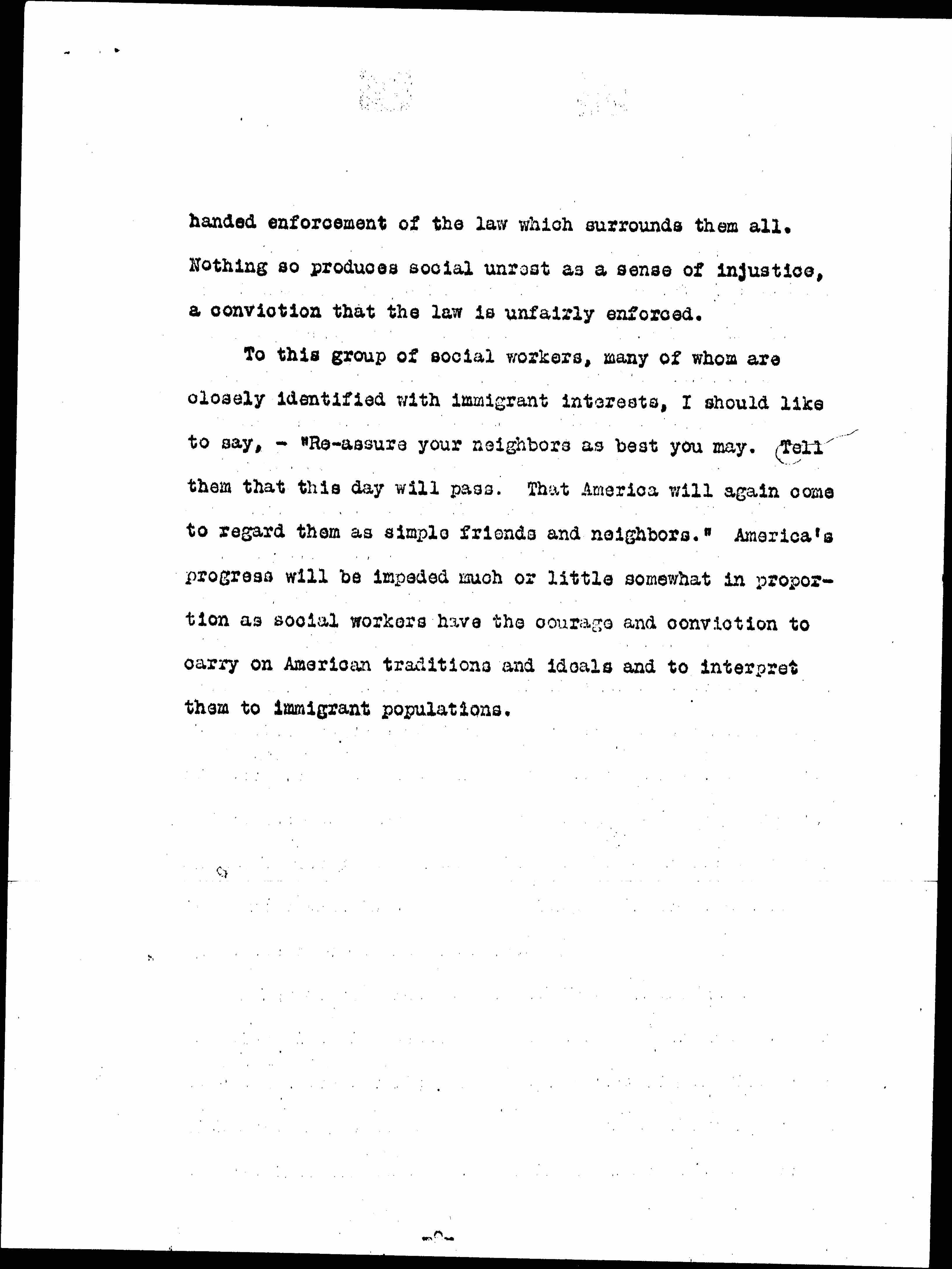 To this group of social workers, many of whom are closely identified with immigrant interests, I should like to say, "[Reassure] your neighbors as best you may. Tell them that this day will pass. That America will again come to regard them as simple friends and neighbors." America's progress will be impeded much or little somewhat in proportion as social workers have the courage and conviction to carry on American traditions and ideals and to interpret them to immigrant populations.
