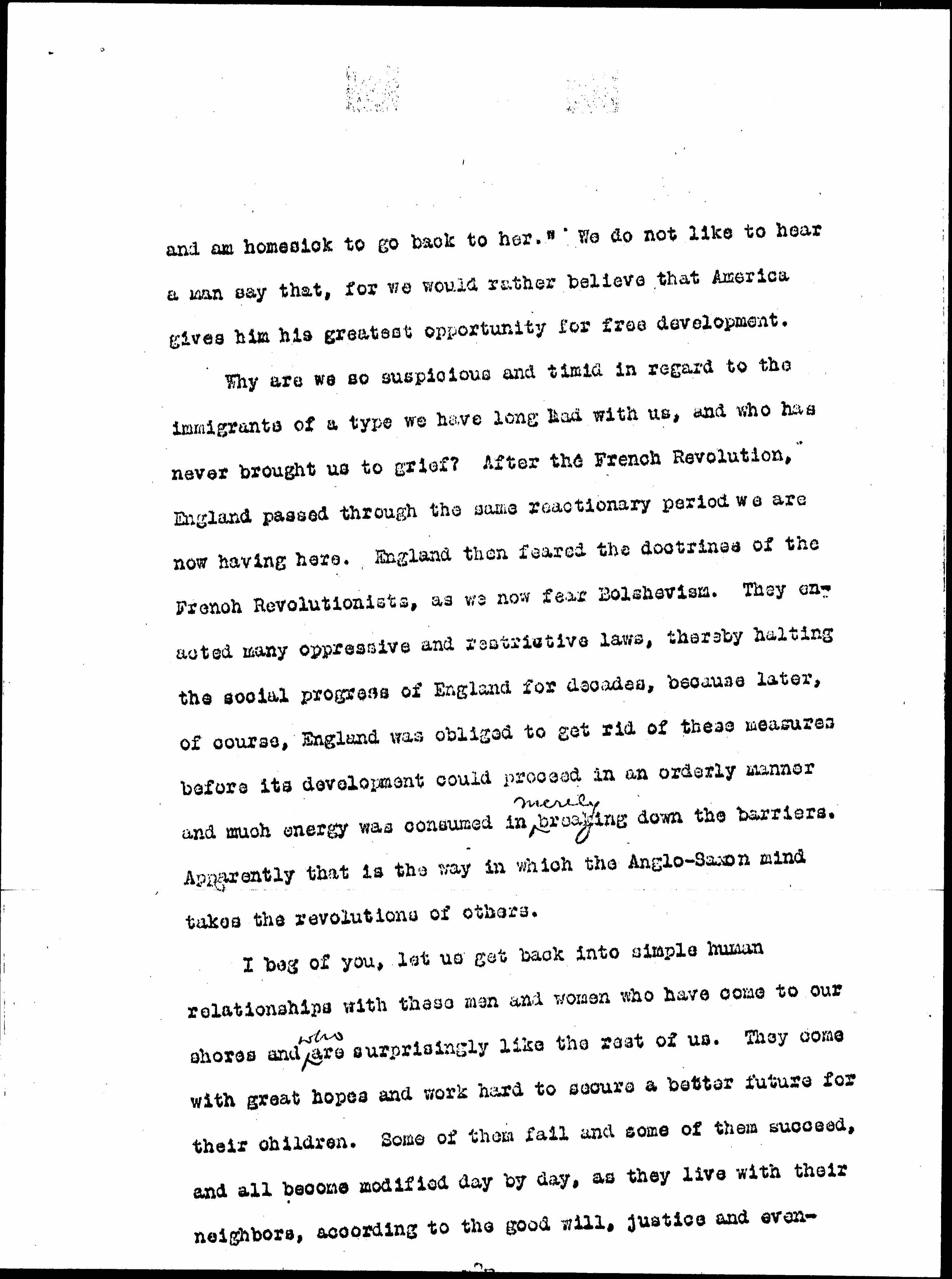 Why are we so suspicious and timid in regard to the immigrants of a type we have long had with us, and who has never brought us to grief? After the French Revolution, the English passed through the same reactionary period we are now having here. England then feared the doctrines of the French Revolutionists, as we now fear the Bolshevism. They enacted many oppressive and restrictive laws, thereby halting the social progress of England for decades, because later, of course, England was obliged to get rid of these measures before its development could proceed in an orderly manner and much energy was consumed in ↑merely↓ breaking down the barriers. Apparently that is the way in which the Anglo-Saxon mind takes the revolutions of others.