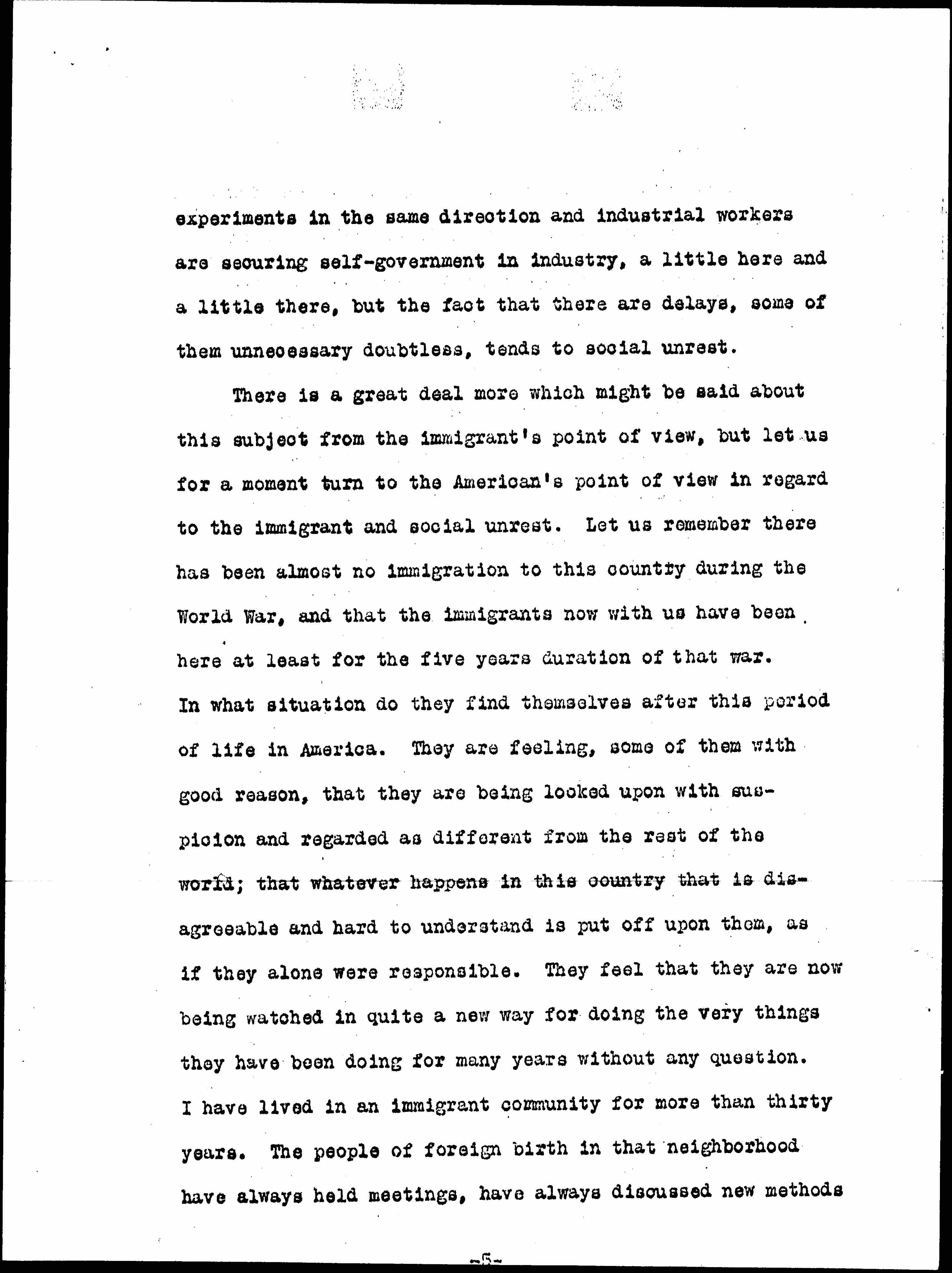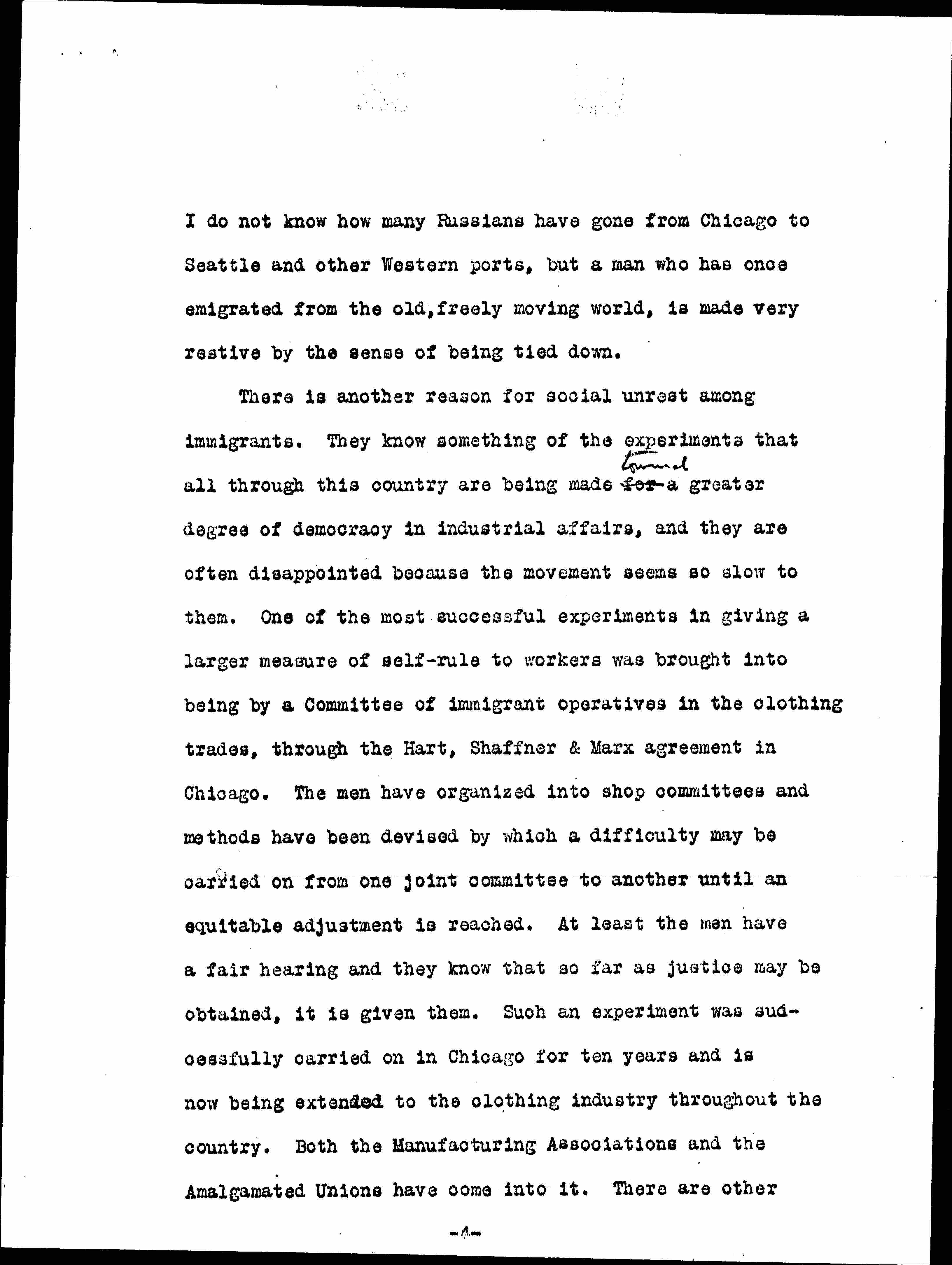 There is another reason for social unrest among immigrants. They know something of the experiments that all though this country are being made for ↑toward↓ a greater degree of democracy in industrial affairs, and they are often disappointed because the movement seems so slow to them. One of the most successful experiments in giving a larger measure of self-rule to workers was brought into being by a Committee of immigrant operatives in the clothing trades, through the Hart, [Schaffner] & Marx agreement in Chicago. The men have organized into shop committees and methods have been devised by which a difficulty may be carried on from one joint committee to another until an equitable adjustment is reached. At least the men have a fair hearing and they know that so far as justice may be obtained, it is given them. Such an experiment was successfully carried on in Chicago for ten years and is now being extended to the clothing industry throughout the country. Both the Manufacturing Associations and the Amalgamated Unions have come into it. There are other [page 5] experiments in the same direction and industrial workers are securing self-government in industry, a little here and a little there, but the fact that there are delays, some of them unnecessary doubtless, tends to social unrest.