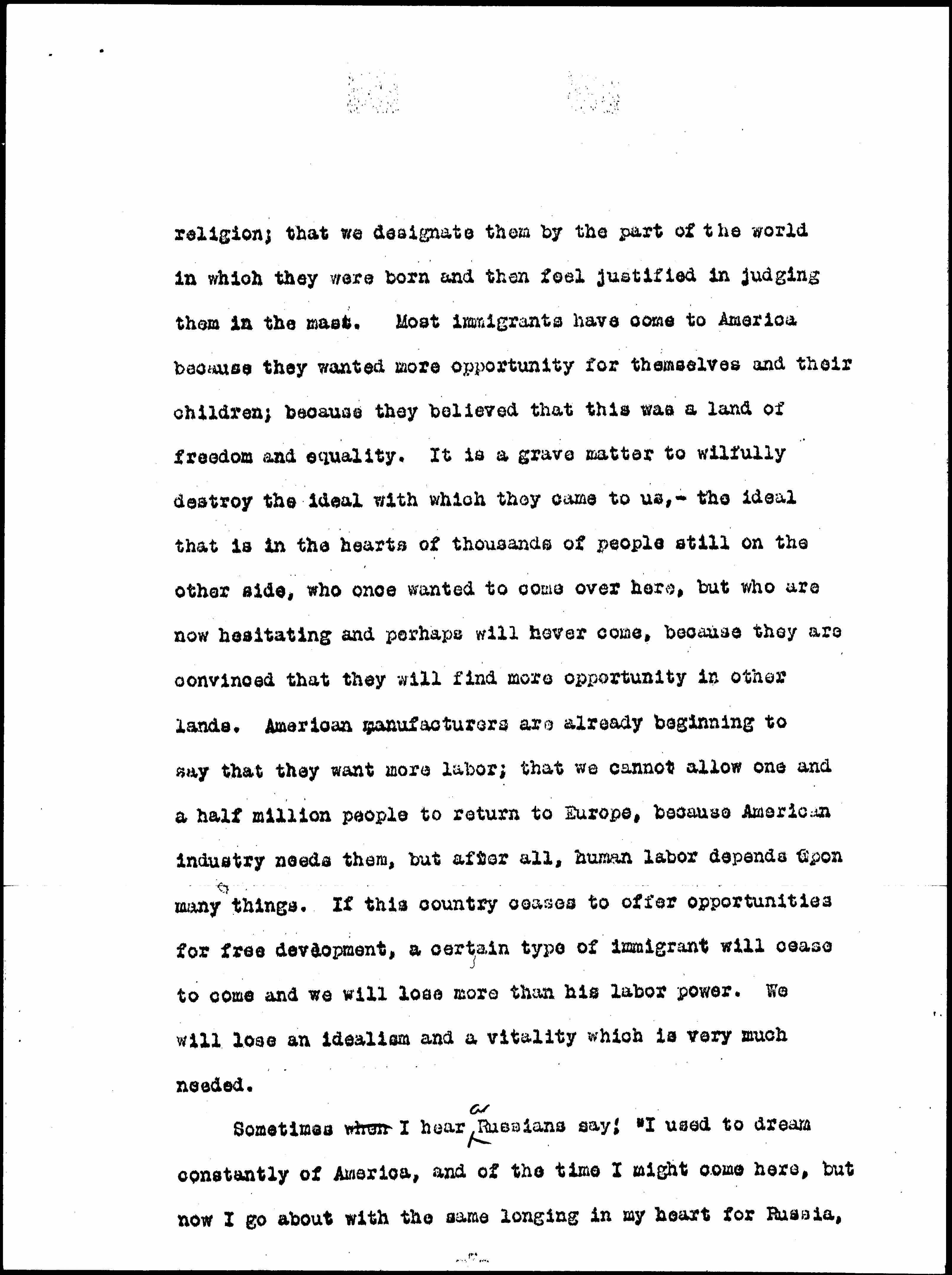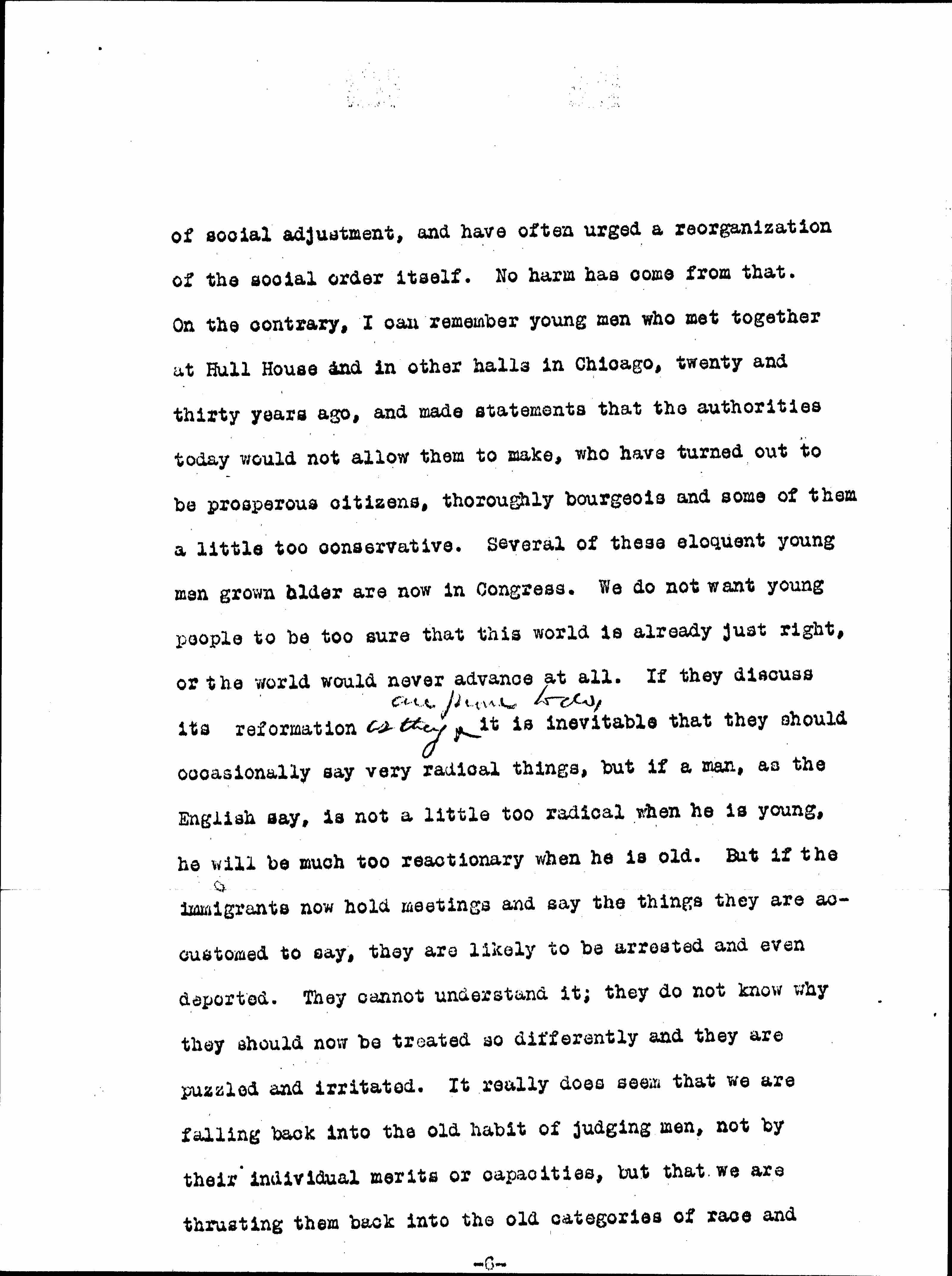 There is a great deal more which might be said about this subject from the immigrant's point of view, but let us for a moment turn to the American's point of view in regard to the immigrant and social unrest. Let us remember there has been almost no immigration to this country during the World War, and that the immigrants now with us have been here at least for the five years duration of that war. In what situation do they find themselves after this period of life in America. They are feeling, some of them with good reason, that they are being looked upon with suspicion and regarded as different from the rest of the world; that whatever happens in this country that is disagreeable and hard to understand is put off upon them, as if they alone were responsible. They feel that they are now being watched in quite a new way for doing the very things they have been doing for many years without any question. I have lived in an immigrant community for more than thirty years. The people of foreign birth in that neighborhood have always held meetings, have always discussed new methods [page 6] of social adjustment, and have often urged a reorganization of the social order itself. No harm has come from that. On the contrary, I can remember young men who met together at Hull House and in other halls in Chicago, twenty and thirty years ago, and made statements that the authorities today would not allow them to make, who have turned out to be prosperous citizens, thoroughly bourgeois and some of them a little too conservative. Several of these eloquent young men grown older are now in Congress. We do not want young people to be too sure that this world is already just right, or the world would never advance at all. If they discuss its reformation ↑as they are prone to do,↓ it is inevitable that they should occasionally say very radical things, but if a man, as the English say, is not a little too radical when he is young, he will be much too reactionary when he is old. But if the immigrants now hold meetings and say the things they are accustomed to say, they are likely to be arrested and even deported. They cannot understand it; they do not know why they should now be treated so differently and they are puzzled and irritated. It really does seem that we are falling back into the old habit of judging men, not by their individual merits or capacities, but that we are thrusting them back into the old categories of race and [page 7] religion; that we designate them by the part of the world in which they were born and then feel justified in judging them in the mass. Most immigrants have come to America because they wanted more opportunity for themselves and their children; because they believed that this was a land of freedom and equality. It is a grave matter to [willfully] destroy the ideal with which they came to us, -- the ideal that is in the hearts of thousands of people still on the other side, who once wanted to come over here, but who are now hesitating and perhaps will never come, because they are convinced that they will find more opportunity in other lands. American manufacturers are already beginning to say that they want more labor; that we cannot allow one and a half million people to return to Europe, because American industry needs them, but after all, human labor depends upon many things. If this country ceases to offer opportunities for free development, a certain type of immigrant will cease to come and we will lose more than his labor power. We will lose an idealism and a vitality which is very much needed.