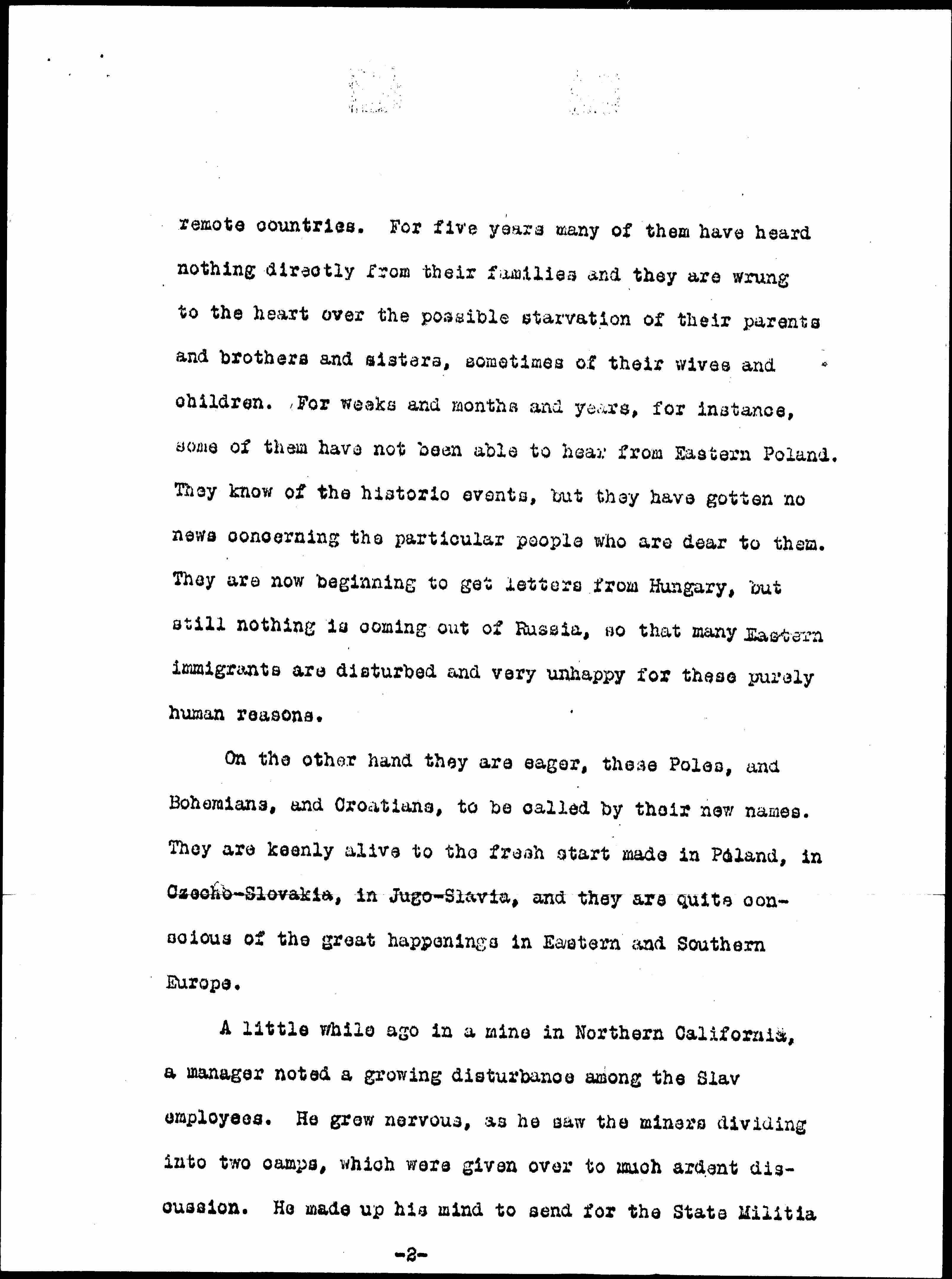 They are all also terribly worried about untoward experiences which may have befallen their kinsfolk in these [page 2] remote countries. For five years many of them have heard nothing directly from their families and they are wrung to the heart over the possible starvation of their parents and brothers and sisters, sometimes of their wives and children. For weeks and months and years, for instance, some of them have not been able to hear from Eastern Poland. They know of the historic events, but they have gotten no news concerning the particular people who are dear to them. They are now beginning to get letters from Hungary, but still nothing is coming out of Russia, so that many Eastern immigrants are disturbed and very unhappy for these purely human reasons.