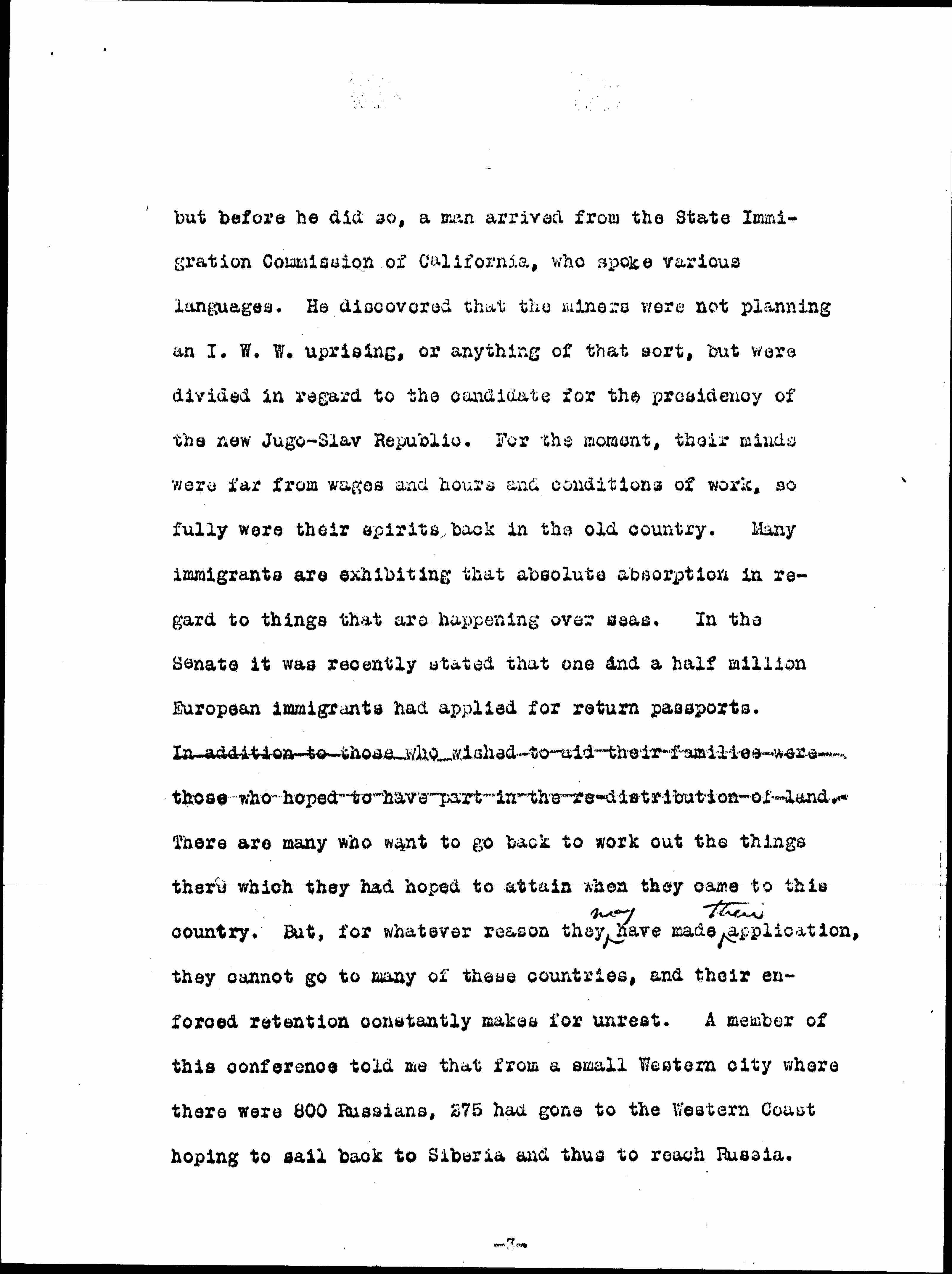 A little while ago in a mine in Northern California, a manager noted a growing disturbance among the Slav employees. He grew nervous, as he saw the miners dividing into two camps, which were given over to much ardent discussion. He made up his mind to send for the State Militia. [page 3] but before he did so, a man arrived from the State Immigration Commission of California, who spoke various languages. He discovered that the miners were not planning an I.W.W. uprising, or anything of that sort, but were divided in regard to the candidate for the presidency of the new [Yugoslav] Republic. For the moment, their minds were far from wages and hours and conditions of work, so fully were their spirits back in the old country. Many immigrants are exhibiting that absolute absorption in regard to things that are happening over seas. In the Senate it was recently stated that one and a half million European immigrants had applied for return passports. In addition to those who wished to aid their families were those who hoped to have part in the [redistribution] of land. There are many who want to go back to work out the things there which they had hoped to attain when they came to this country. But, for whatever reason they ↑may↓ have made ↑their↓ application, they cannot go to many of these countries, and their enforced retention constantly makes for unrest. A member of this conference told me that from a small Western city where there were 800 Russians, 275 had gone to the Western Coast hoping to sail back to Siberia and thus to reach Russia. [page 4] I do not know how many Russians have gone from Chicago to Seattle and other Western ports, but a man who has once emigrated from the old, freely moving world, is made very restive by the sense of being tied down.