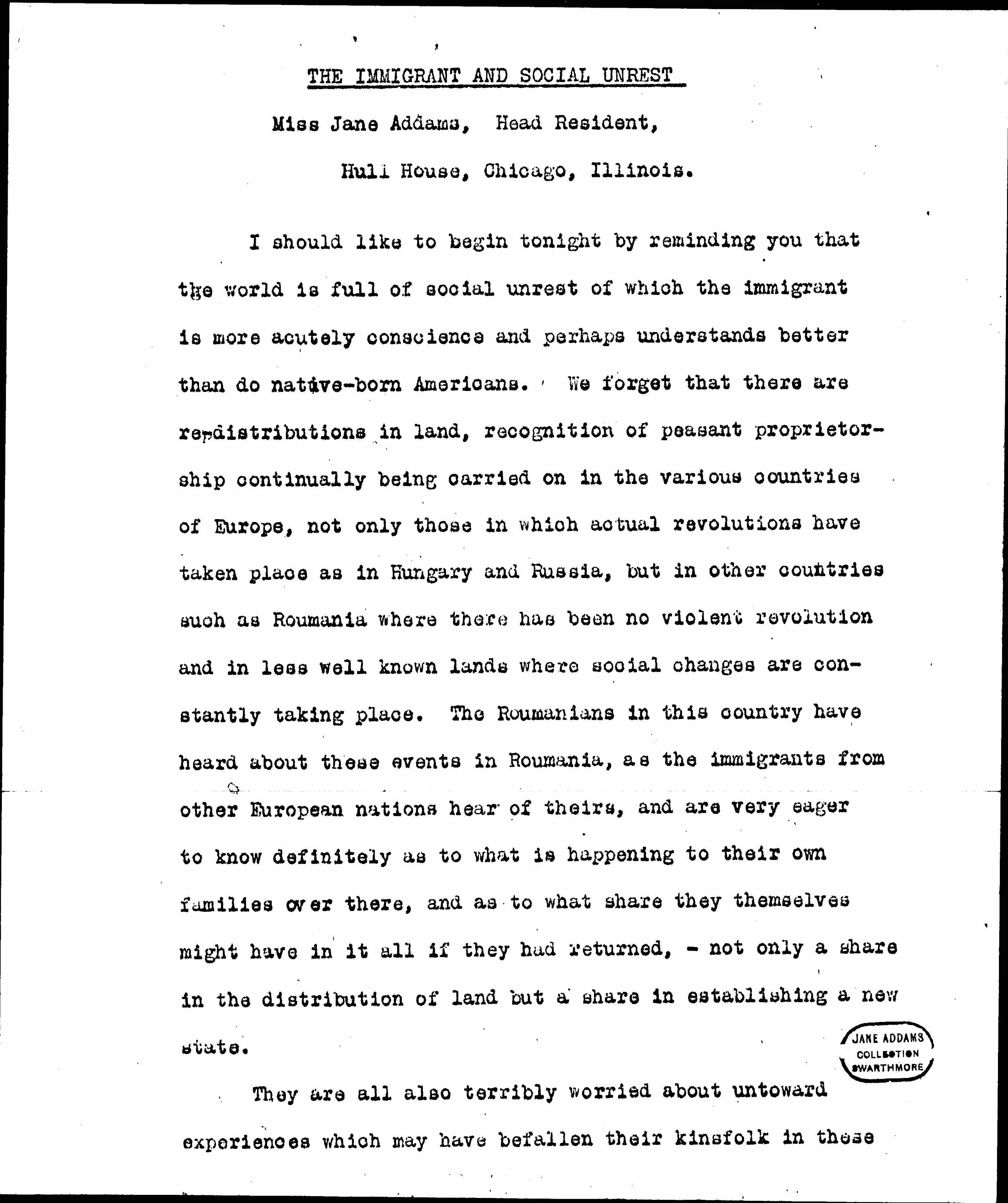 I should like to begin tonight by reminding you that the world is full of social unrest of which the immigrant is more acutely conscience and perhaps understands better than do native-born Americans. We forget that there are [redistributions] in land, recognition of peasant proprietorship continually being carried on in the various countries of Europe, not only those in which actual revolutions have taken place as in Hungary and Russia, but in other countries such as [Romania] where there has been no violent revolution and in less well known lands where social changes are constantly taking place. The [Romanians] in this country have heard about these events in [Romania], as the immigrants from other European nations hear of theirs, and are very eager to know definitely as to what is happening to their own families over there, and as to what share they themselves might have in it all if they had returned, -- not only a share in the distribution of land but a share in establishing a new state.