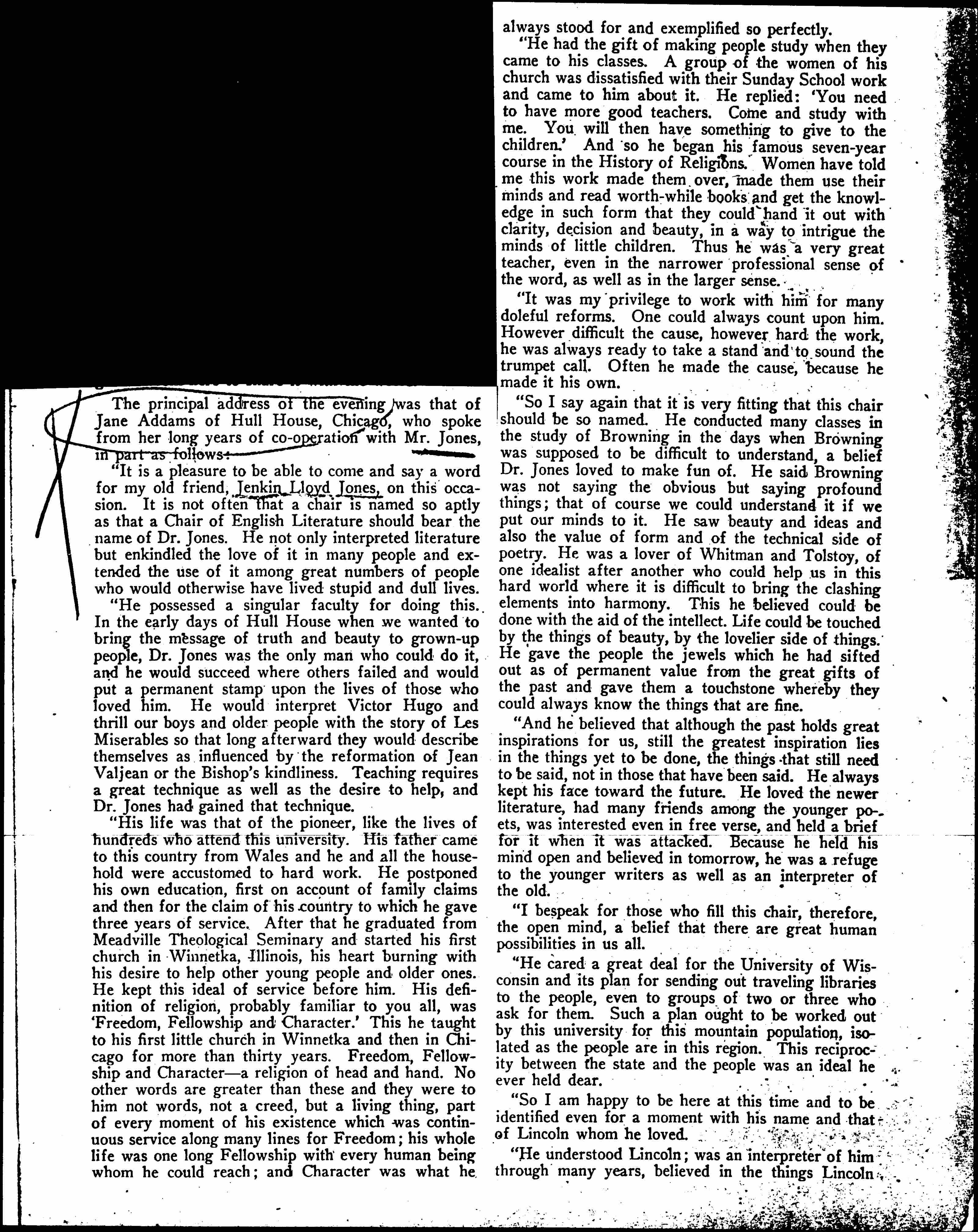 The principal address of the evening was that of Jane Addams of Hull House, Chicago, who spoke from her long years of [cooperation] with Mr. Jones, in part as follows: