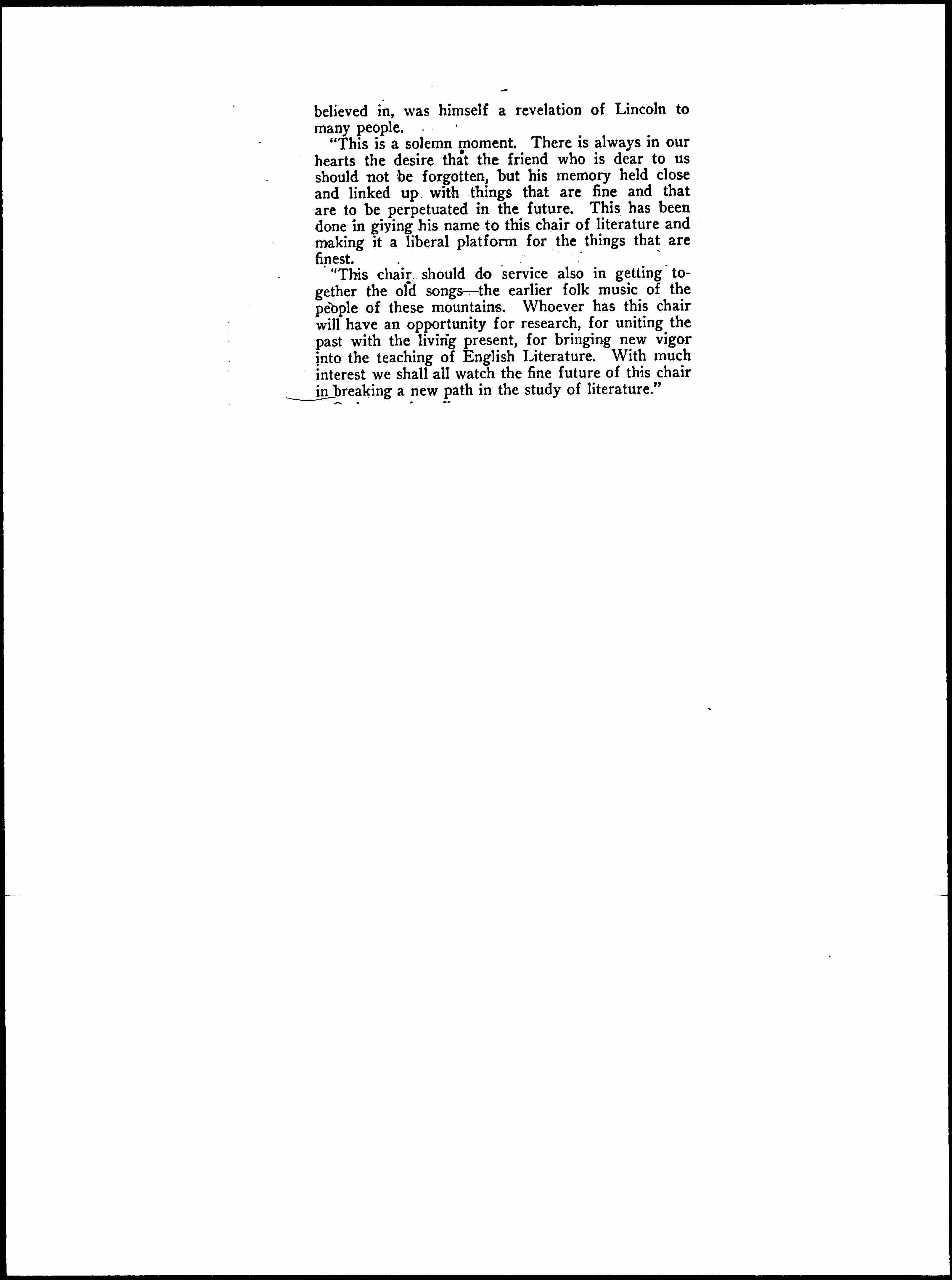 "This chair should do service also in getting together the old songs -- the earlier folk music of the people of these mountains. Whoever has this chair will have an opportunity for research, for uniting the past with the living present, for bringing new vigor into the teaching of English Literature. With much interest we shall all watch the fine future of this chair in breaking a new path in the study of literature."