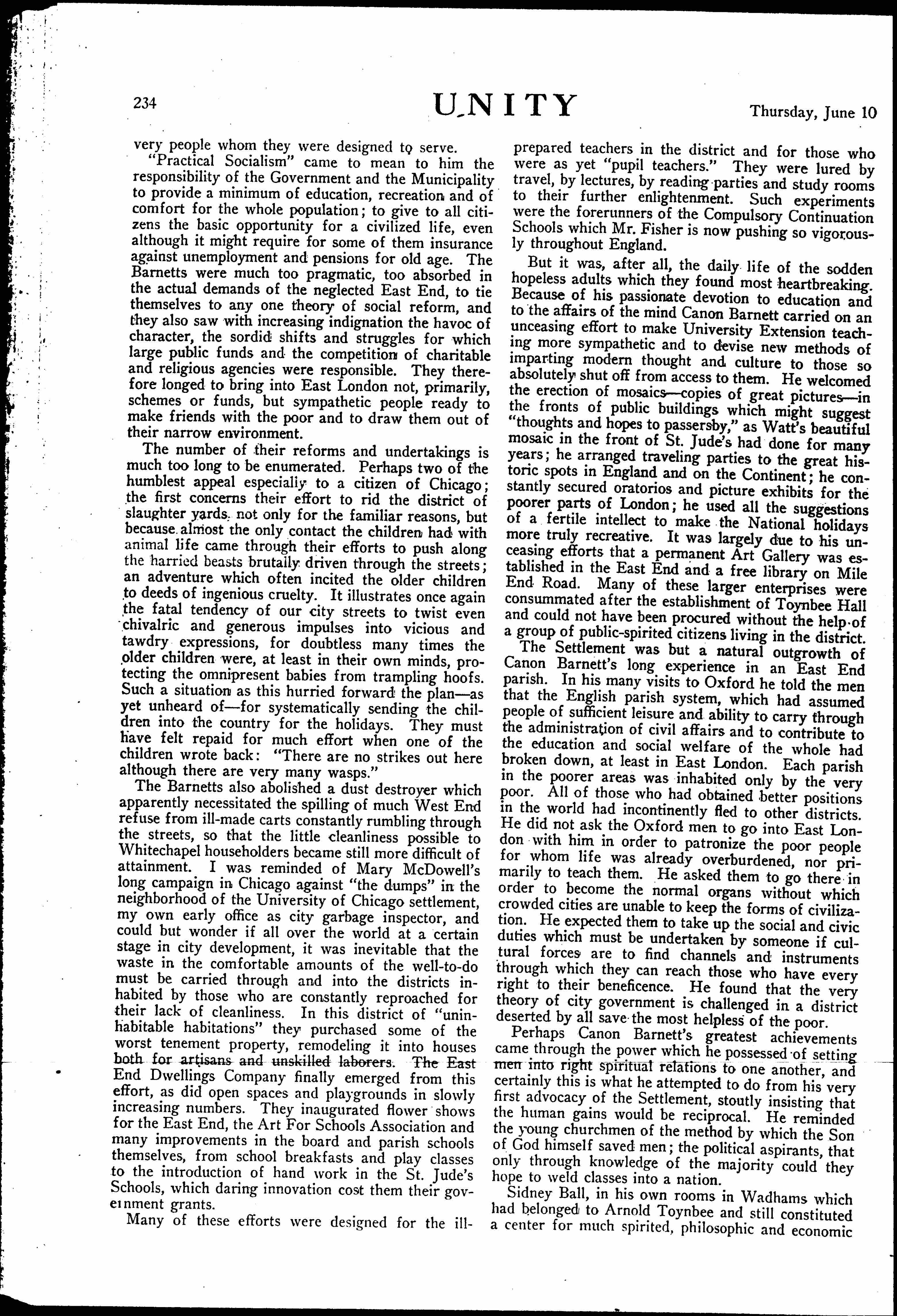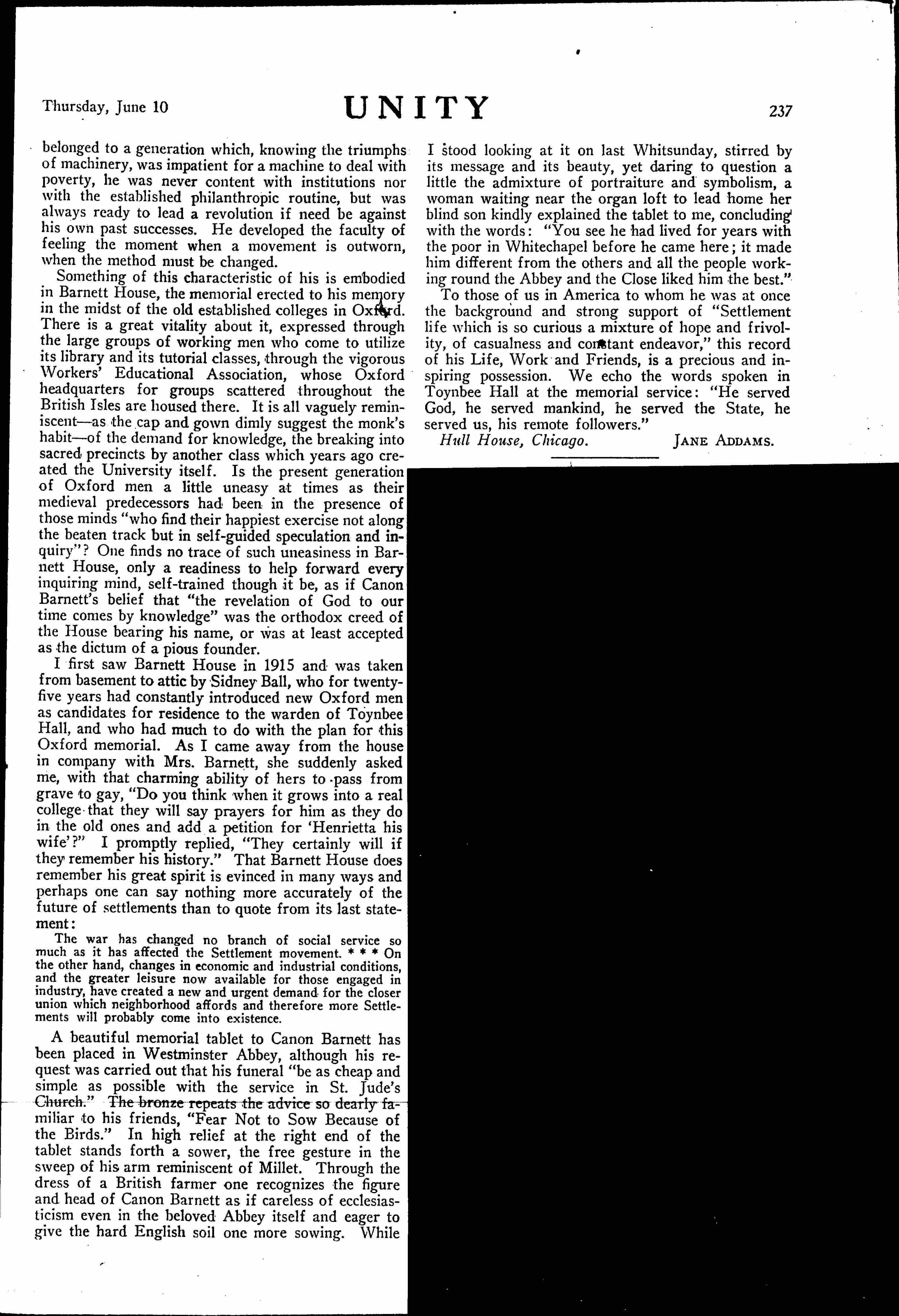 As we emerged from the ravine into the hard streets of Bristol, Canon Barnett pointed to a large house outside the city looming distantly through the night and told me that the man who lived there spent all his time hunting, ranging from birds in Scotland to big game in Africa, that he cared nothing for the cottages on his estate which had so shocked me that morning. Canon Barnett then added, "from my point of view, his [page 4] lack of social responsibility is as much of a disgrace to me, a servant of the Church, as are the wretched homeless men who sleep in the Commercial street doorways; or the long hours of grinding toil that result in absolute destruction of the human mind; or the stupidity and hardness of heart that proclaim a willingness to settle the problem of capital and labor by bullets."