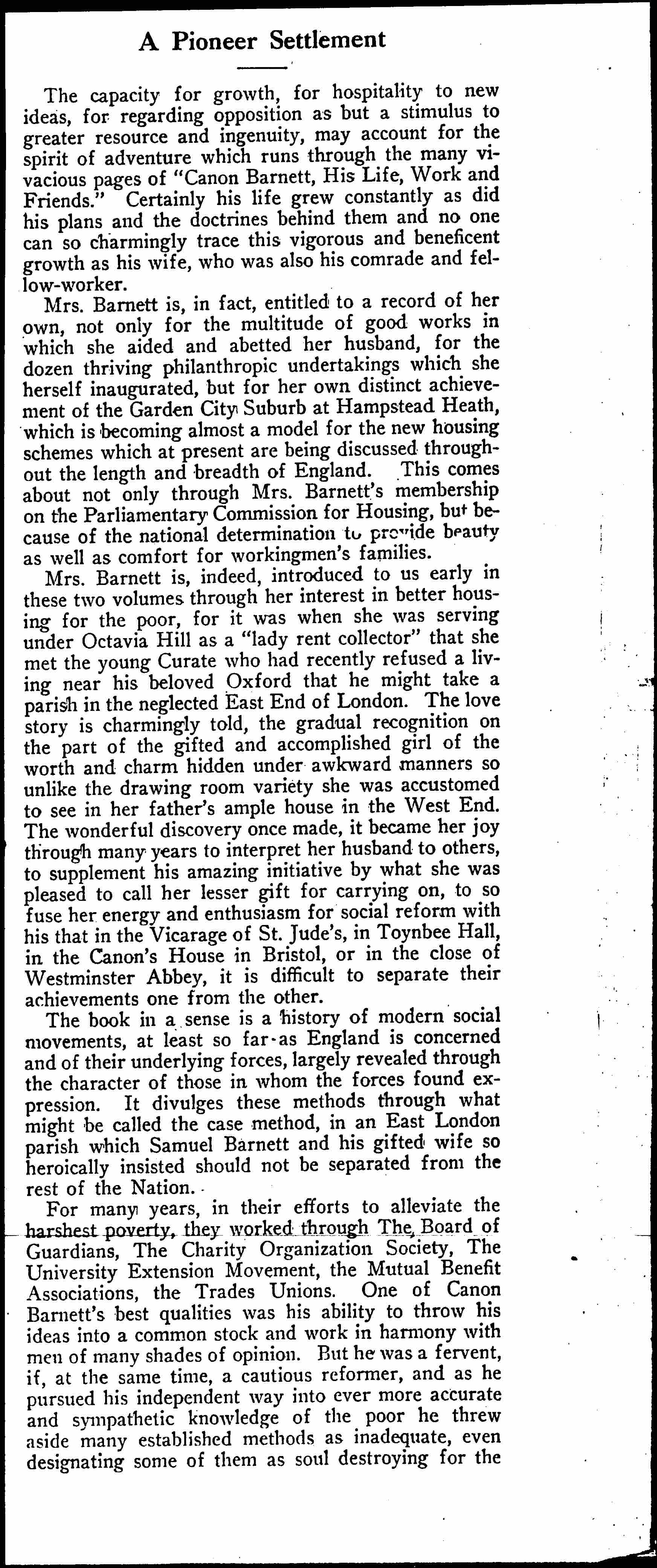 The book in a sense is a history of modern social movements, at least so far as England is concerned and of their underlying forces, largely revealed through the character of those in whom the forces found expression. It divulges these methods through what might be called the case method, in an East London Parish which Samuel Barnett and his gifted wife so heroically insisted should not be separated from the rest of the Nation.