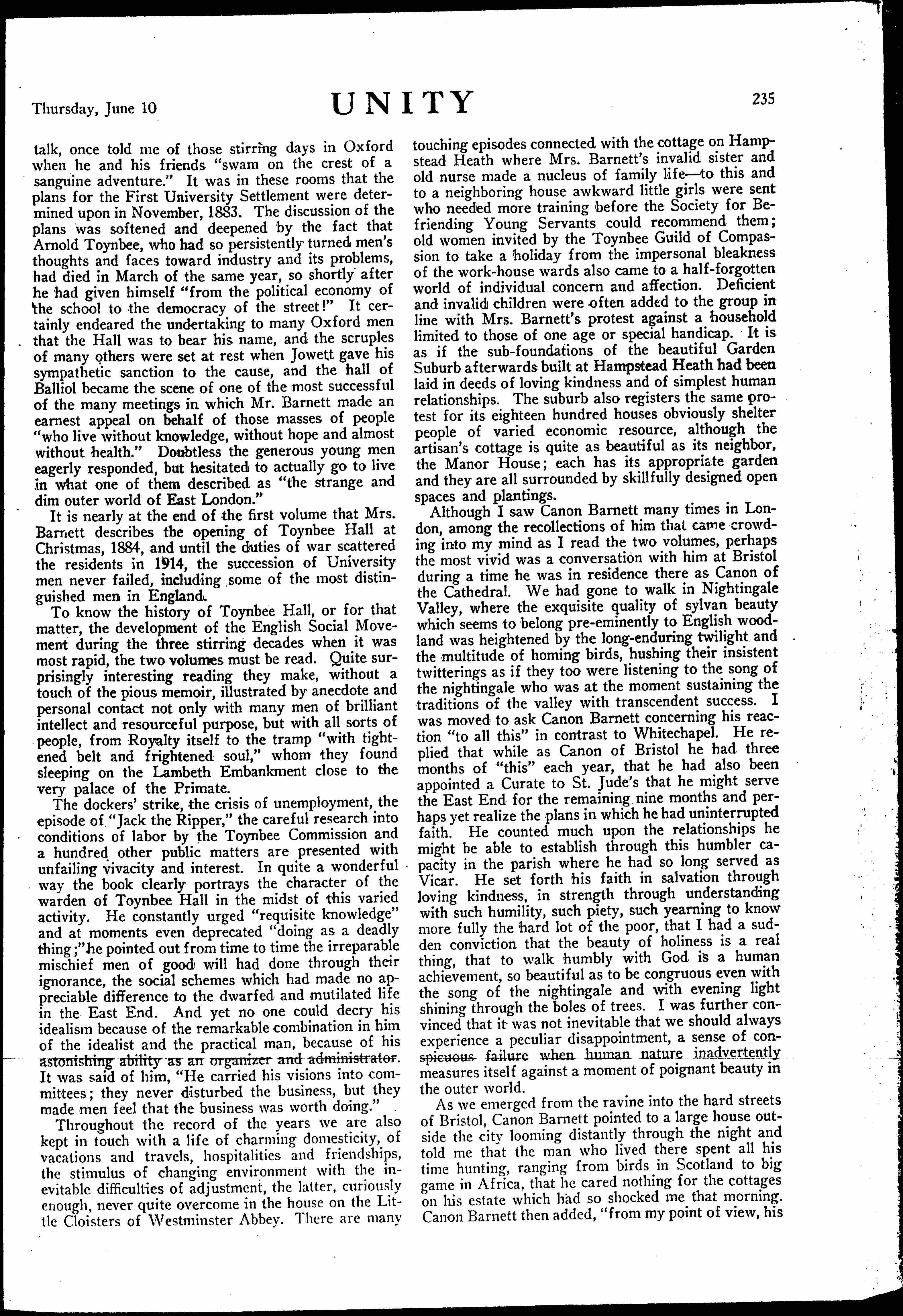Although I saw Canon Barnett many times in London, among the recollections of him that came crowding into my mind as I read the two volumes, perhaps the most vivid was a conversation with him at Bristol during a time he was in residence there as Canon of the Cathedral. We had gone to walk in Nightingale Valley, where the exquisite quality of sylvan beauty which seems to belong [preeminently] to English woodland was heightened by the long-enduring twilight and the multitude of homing birds, hushing their insistent twitterings as if they too were listening to the song of the nightingale who was at the moment sustaining the traditions of the valley with transcendent success. I was moved to ask Canon Barnett concerning his reaction "to all this" in contrast to Whitechapel. He replied that while as Canon of Bristol he had three months of "this" each year, that he has also been appointed a Curate to St. Jude's that he might serve the East End for the remaining nine months and perhaps yet realize the plans in which he had uninterrupted faith. He counted much upon the relationship he might be able to establish through this humbler capacity in the parish where he had so long served as Vicar. He set forth his faith in salvation through loving kindness, in strength through understanding with such humility, such piety, such yearning to know more fully the hard lot of the poor, that I had a sudden conviction that the beauty of holiness is a real thing, that to walk humbly with God is a human achievement, so beautiful as to be congruous even with the song of the nightingale and with evening light shining through the boles of trees. I was further convinced that it was not inevitable that we should always experience a peculiar disappointment, a sense of conspicuous failure when human nature inadvertently measures itself against a moment of poignant beauty in the outer world.