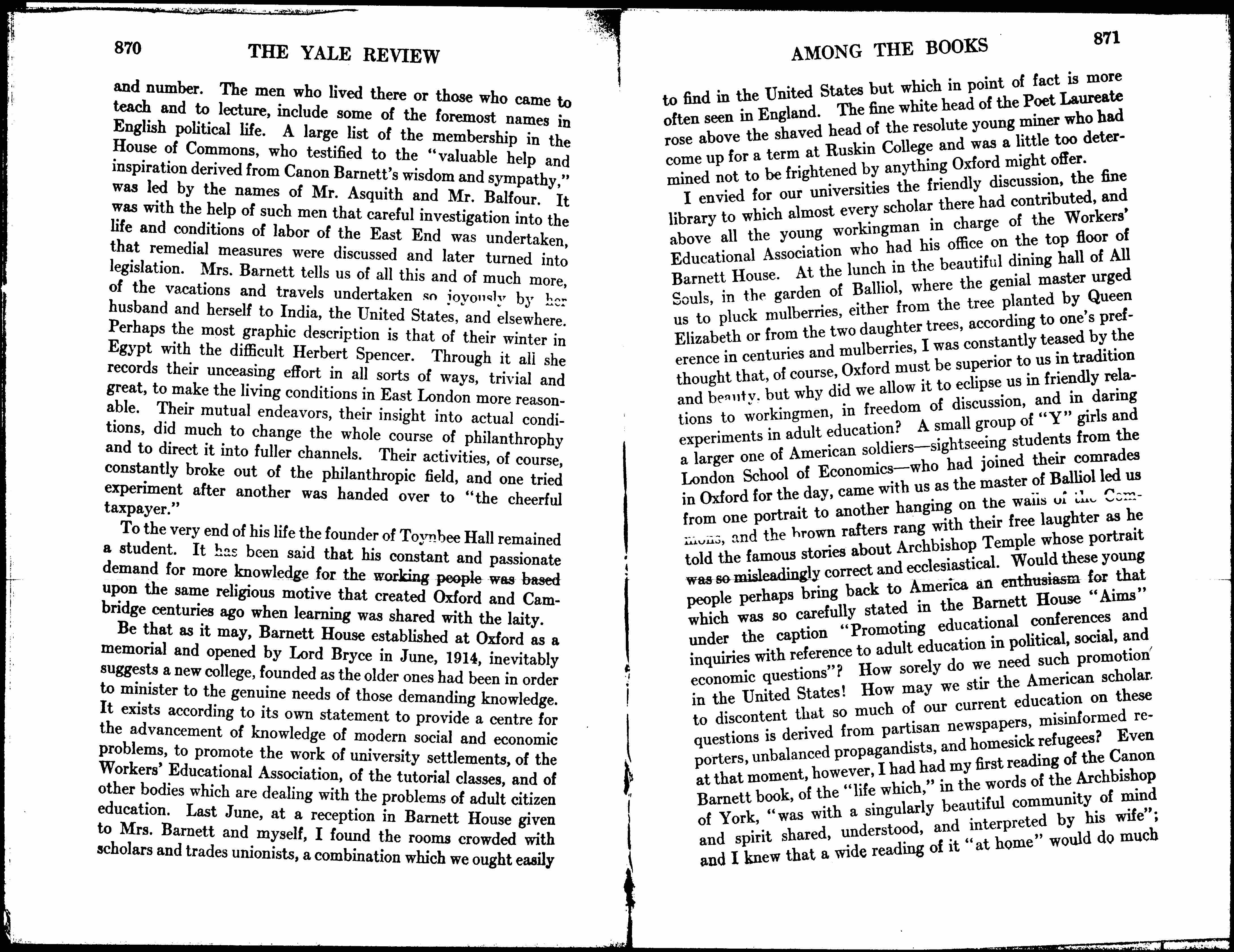 Be that as it may, Barnett House established at Oxford as a memorial and opened by Lord Bryce in June, 1914, inevitably suggests a new college, founded as the older ones had been in order to minister to the genuine needs of those demanding knowledge. It exists according to its own statement to provide a [center] for the advancement of knowledge of modern social and economic problems, to promote the work of university settlements, of the Workers’ Educational Association, of the tutorial classes, and of other bodies which are dealing with the problems of adult citizen education. Last June, at a reception in Barnett House given to Mrs. Barnett and myself, I found the rooms crowded with scholars and trades unionists, a combination which we ought easily [page 5] to find in the United States but which in point of fact is more often seen in England. The fine white head of the Poet Laureate rose above the shaved head of the resolute young miner who had come up for a term at Ruskin College and was a little too determined not to be frightened by anything Oxford might offer.