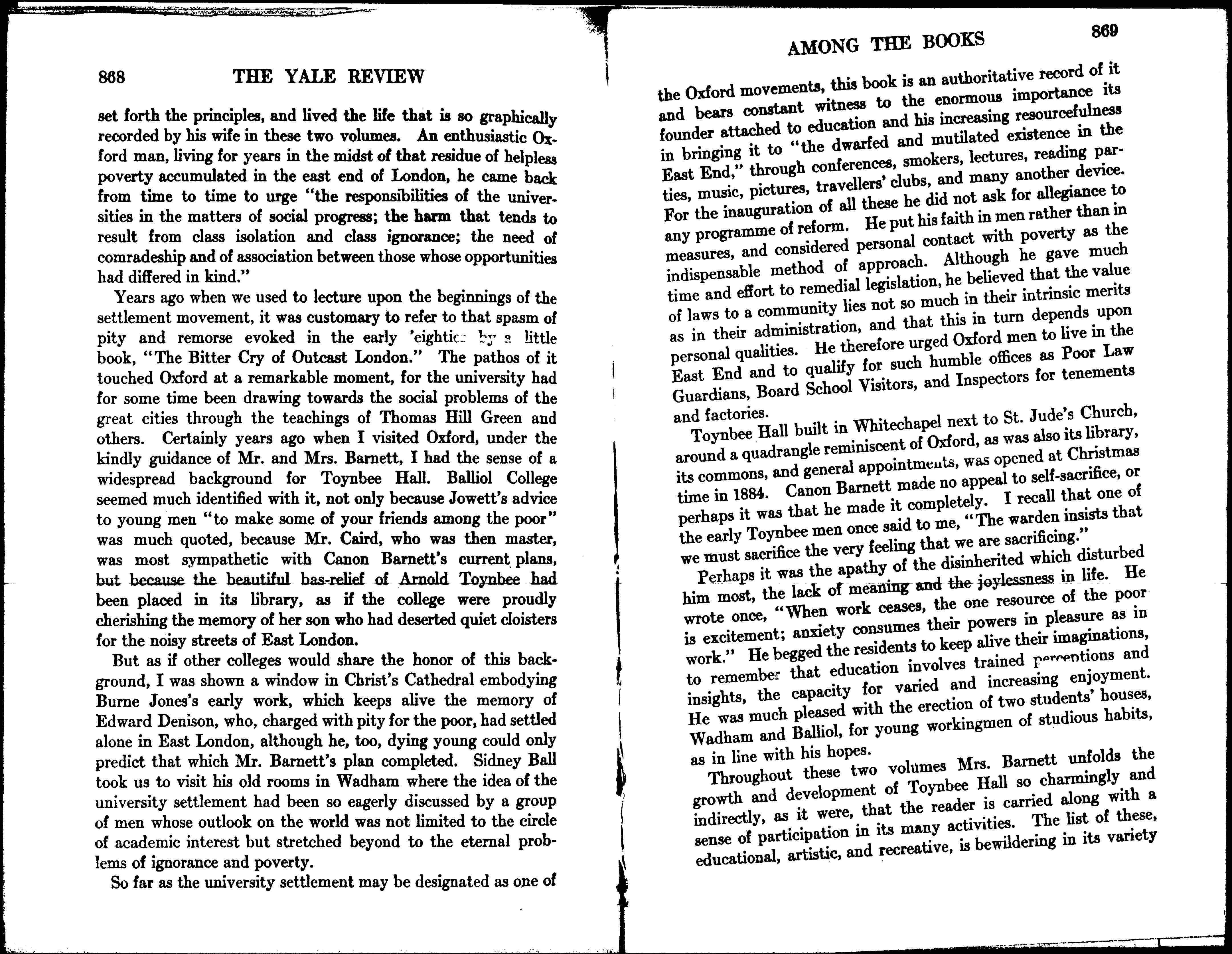 Years ago when we used to lecture upon the beginnings of the settlement movement, it was customary to refer to that spasm of pity and remorse evoked in the early 'eighties by a little book called "The Bitter Cry of Outcast London." The pathos of it touched Oxford at a remarkable moment, for the university had for some time been driving towards the social problems of the great cities through the teachings of Thomas Hill Green and others. Certainly years ago when I visited Oxford, under the kindly guidance of Mr. and Mrs. Barnett, I had the sense of a widespread background for Toynbee Hall. Balliol College seemed much identified with it, not only because Jowett’s advice to young men “to make some of your friends among the poor” was much quoted, because Mr. Caird, who was then master, was most sympathetic with Canon Barnett’s current plans, but because the beautiful bas-relief of Arnold Toynbee had been placed in its library, as if the college were proudly cherishing the memory of her son who had deserted quiet cloisters for the noisy streets of London.