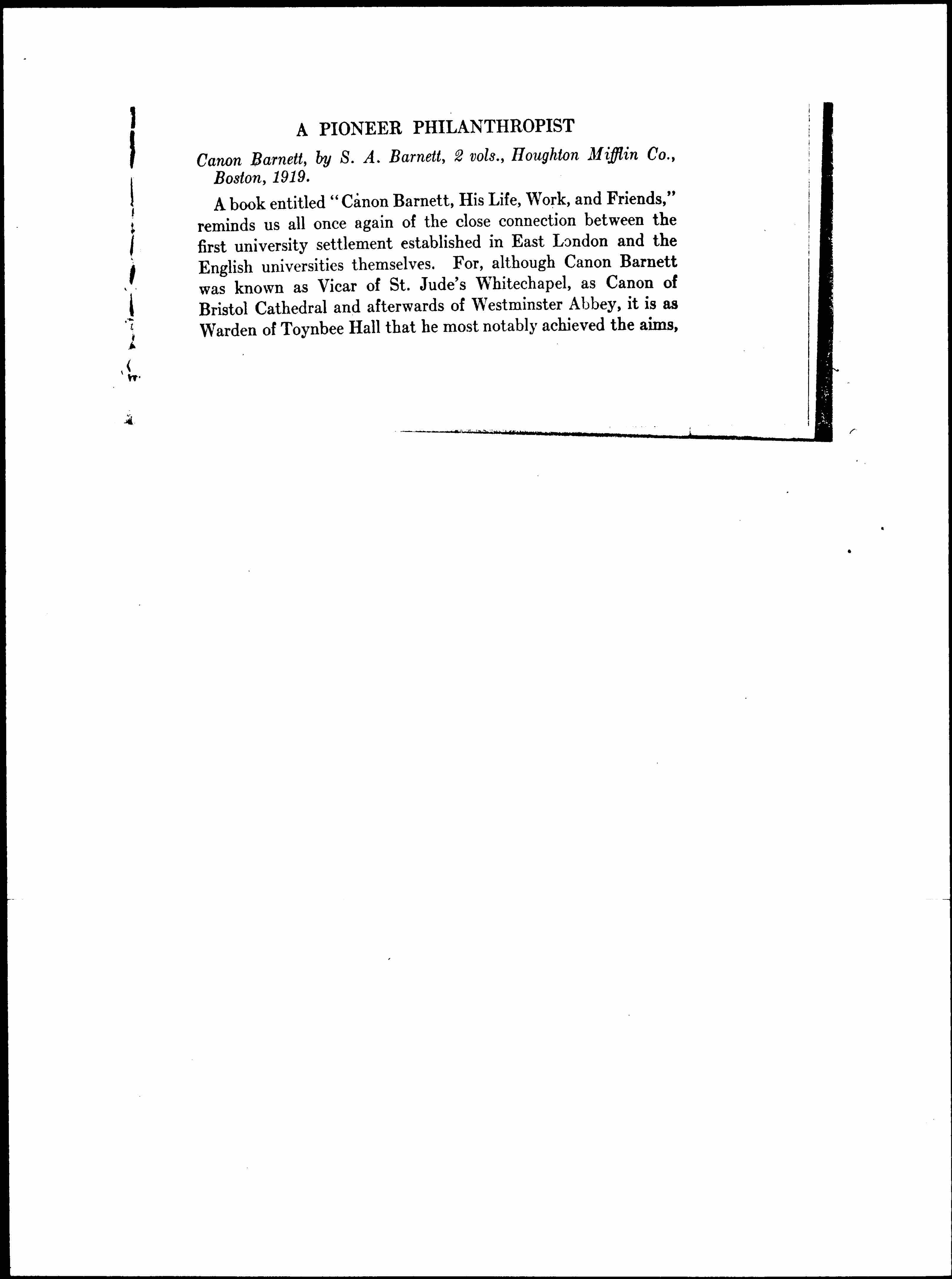 A book entitled "Canon Barnett, His Life, Work, and Friends," reminds us all once again of the close connection between the first university settlement established in East London and the English universities themselves. For, although Canon Barnett was known as Vicar of St. Jude’s Whitechapel, as Canon of Bristol Cathedral and afterwards of Westminster Abbey, it is as Warden of Toynbee Hall that he most notably achieved the aims, [page 2] set forth the principles, and lived the life that is so graphically recorded by his wife in these two volumes. An enthusiastic Oxford man, living for years in the midst of that residue of helpless poverty accumulated in the east end of London, he came back from time to time to urge: “the responsibilities of the universities in the matters of social progress; the harm that tends to result from class isolation and class ignorance; the need of comradeship and of association between those whose opportunities had differed in kind.”