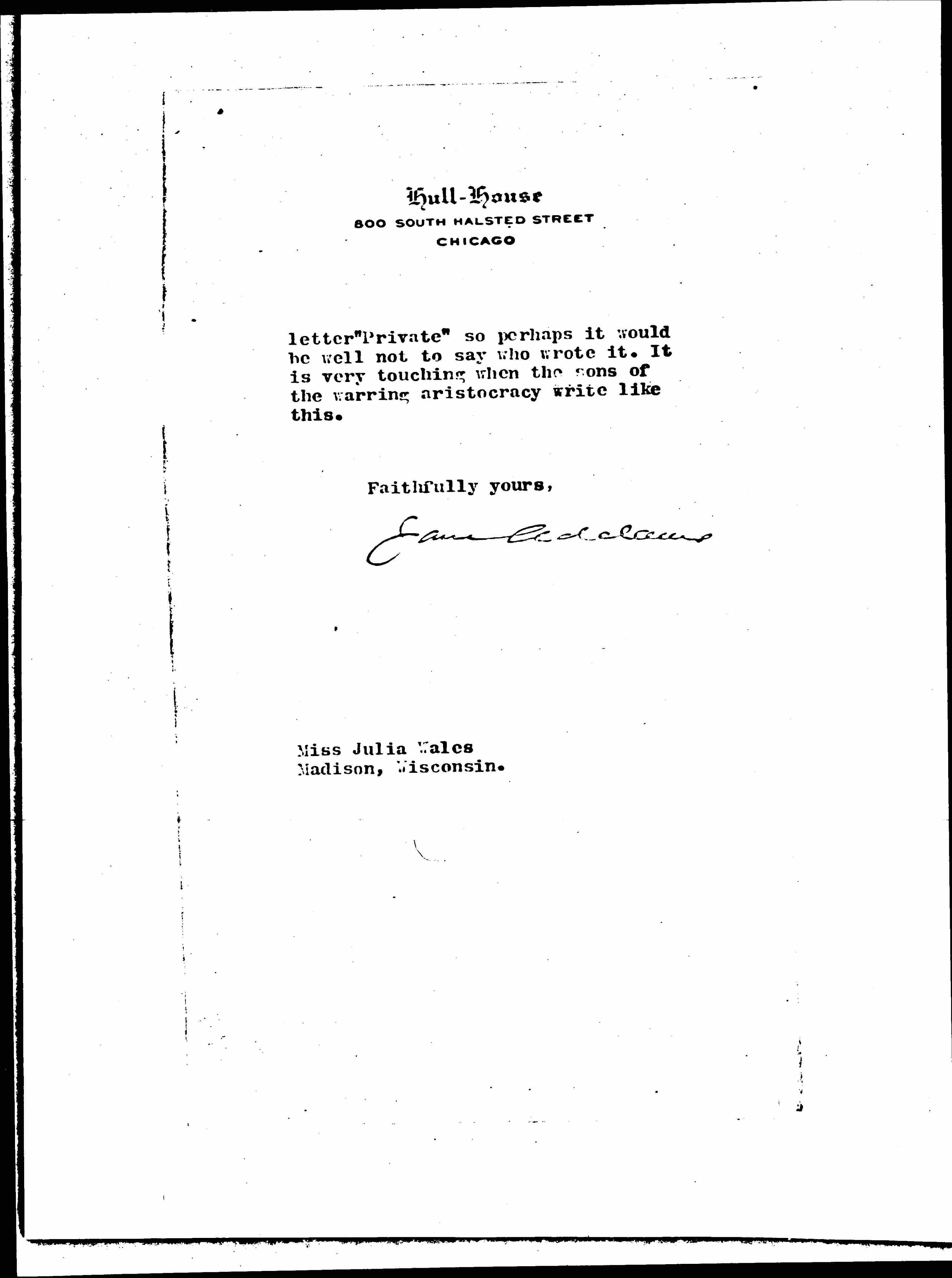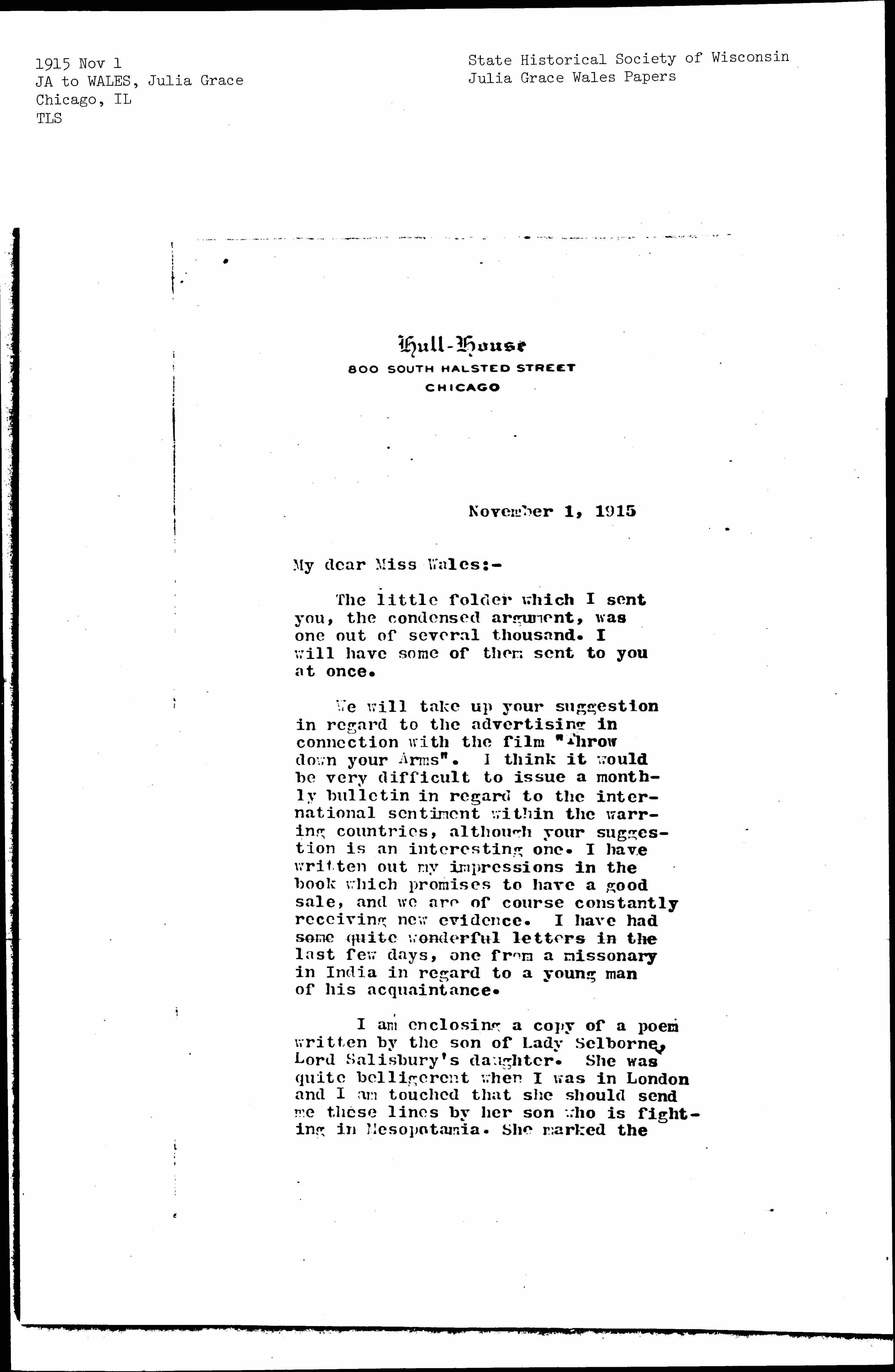 We will take up your suggestion in regard to the advertising in connection with the film "Throw down your Arms". I think it would be very difficult to issue a monthly bulletin in regard to the international sentiment within the warring countries, although your suggestion is an interesting one. I have written out my impressions in the book which promises to have a good sale, and we are of course constantly receiving new evidence. I have had some quite wonderful letters in the last few days, one from a missionary in India in regard to a young man of his acquaintance.