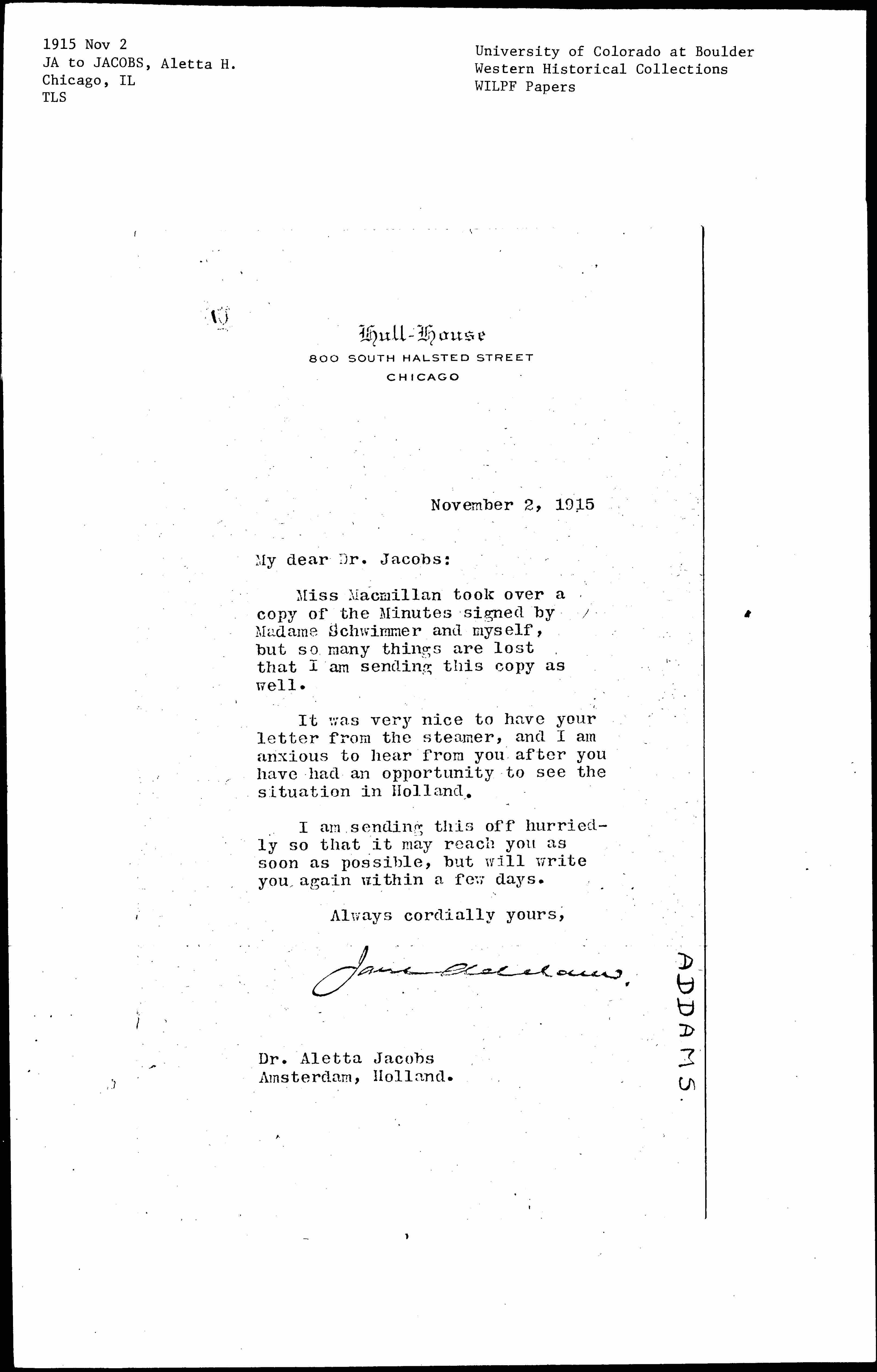Jane Addams. [signed]