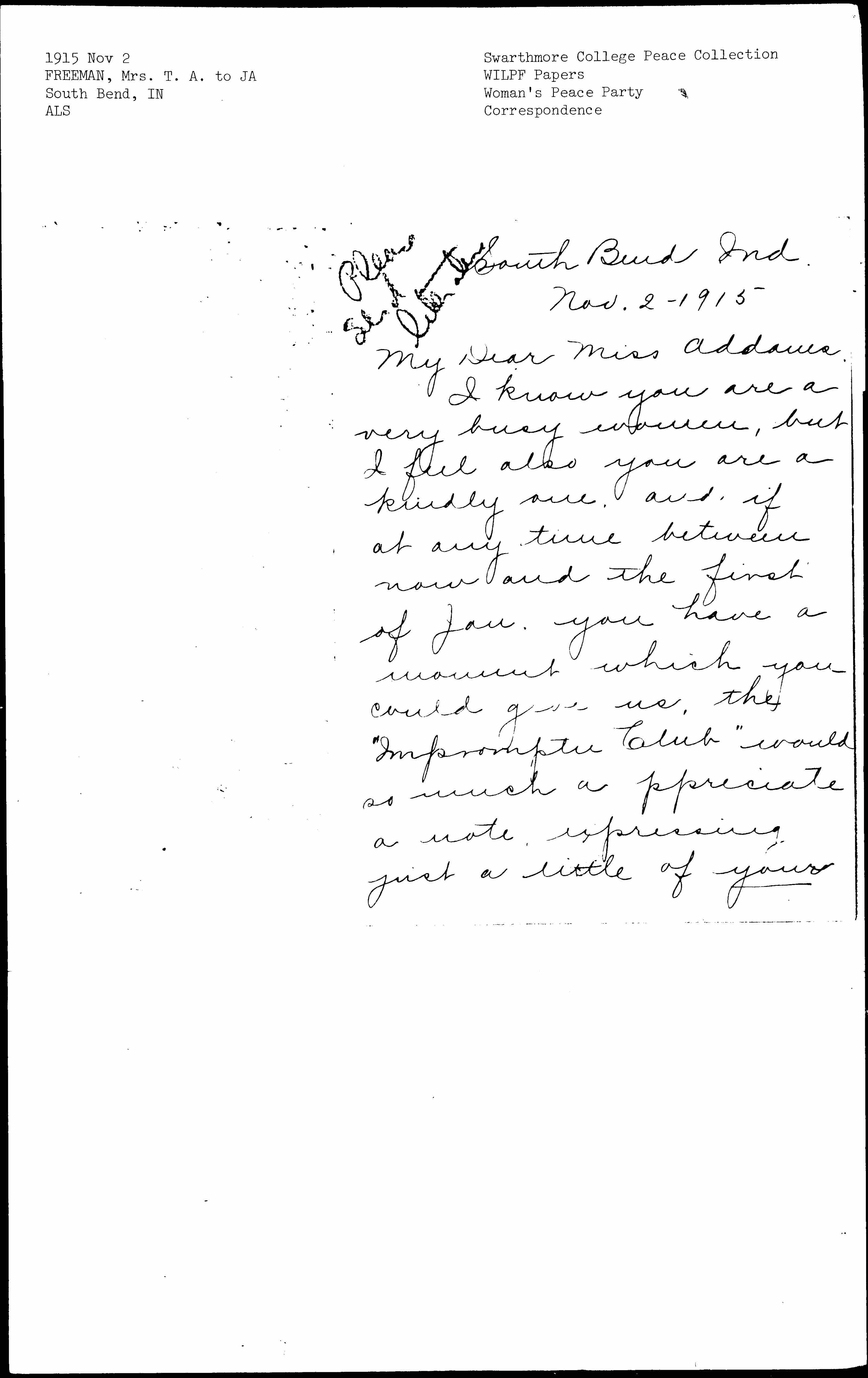 I know you are a very busy woman, but I feel also you are a kindly one, and, if at any time between now and the first of Jan. you have a moment which you could give us, the "Impromptu Club" would so much appreciate a note impressing just a little of your [page 2] ideas on "Universal Peace and its relation to woman."?