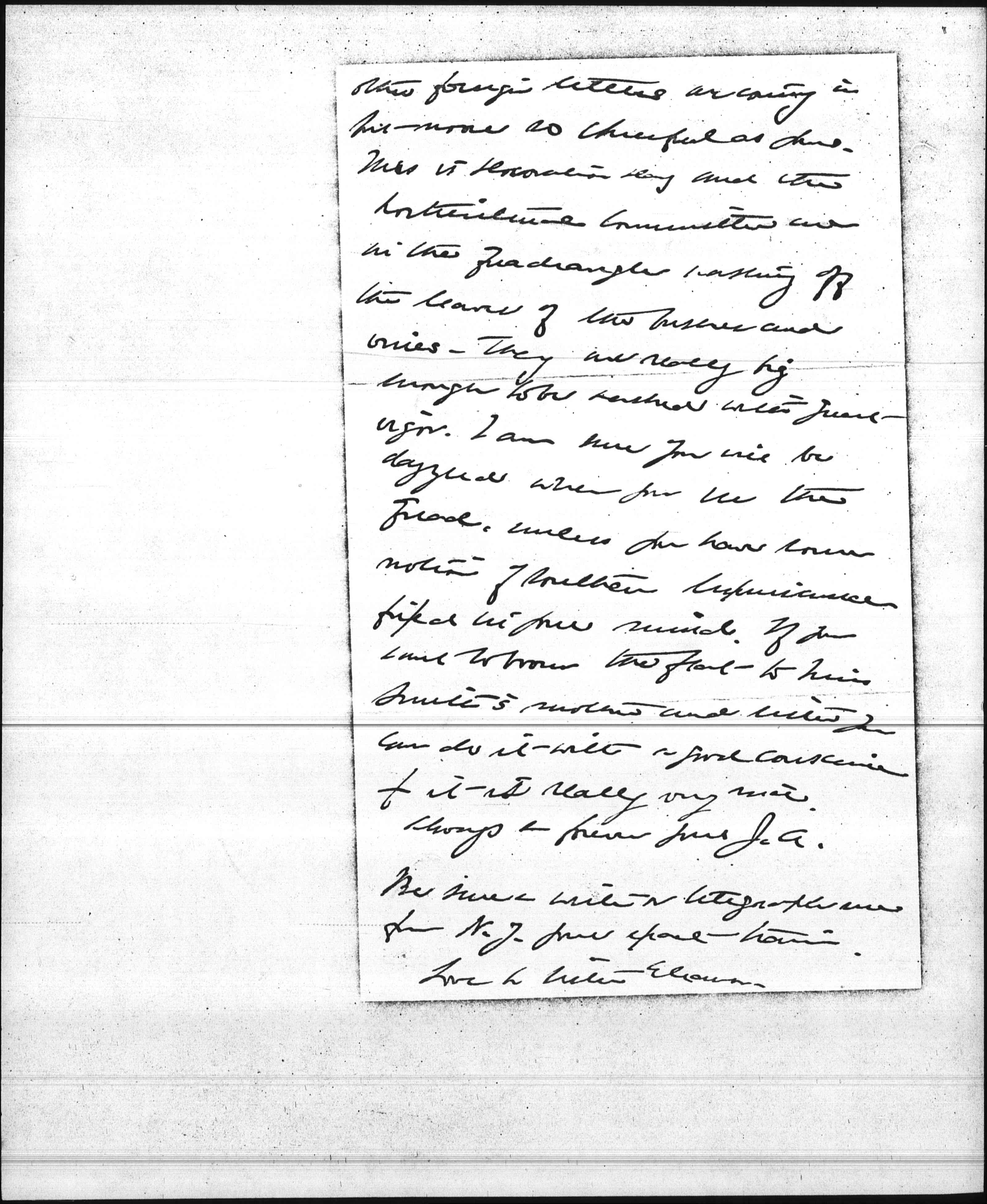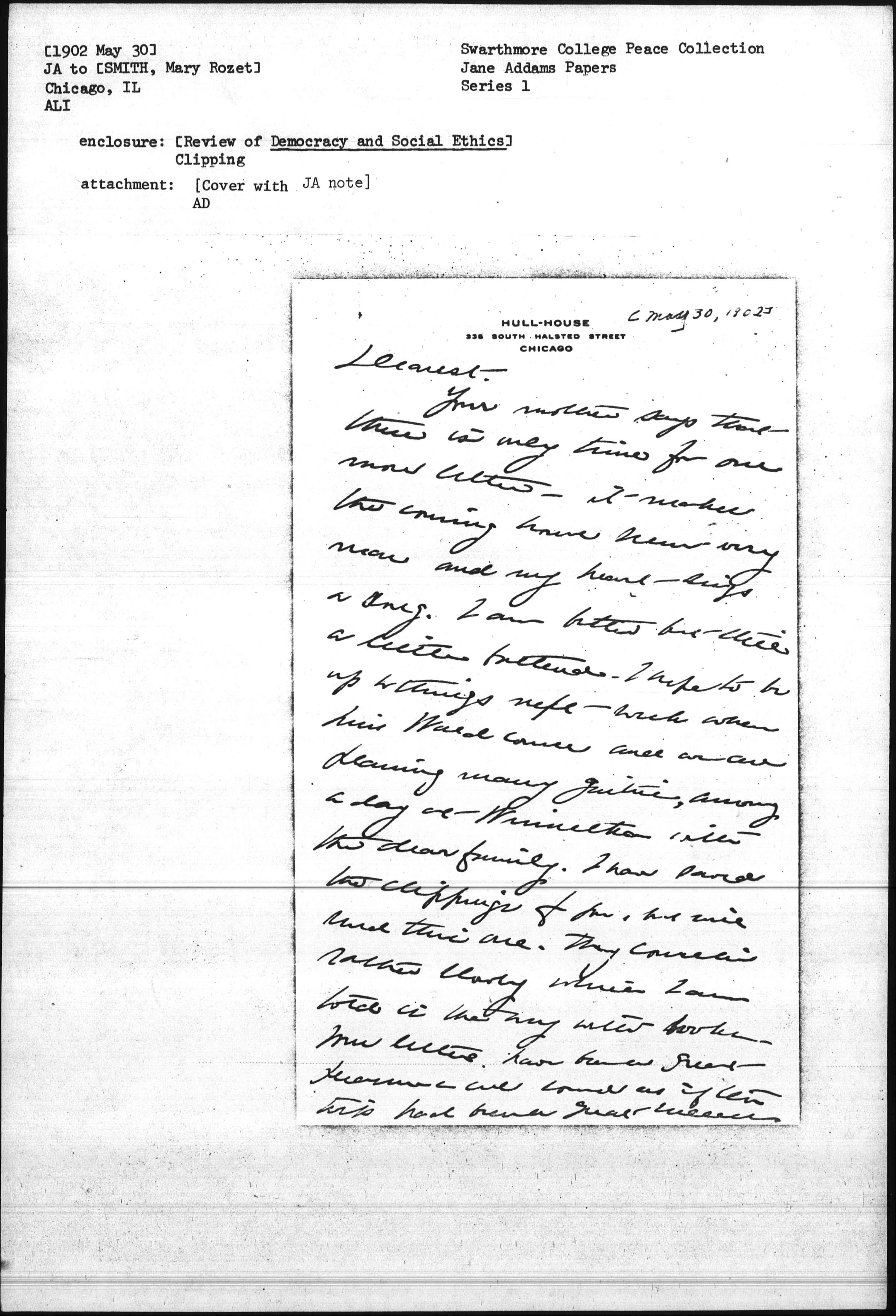 Your mother says that there is only time for one more letter - It makes the coming home seem very near and my heart sings a song. I am better but still a little battered. I hope to be up to things next week when Miss Wald comes and we are planning many gaities among a day at Winnetka with the dear family. I have saved the clippings for you, but will send this one. They [come in] rather slowly which I am told is the way with books. Your letters have been a great pleasure & [all sound] as if the trip had been a great success. [page 2] Other foreign letters are coming in but none so cheerful as yours. This is Decoration Day and the horticultural committee are in the quadrangle washing off the leaves of the bushes and vines. They are really big enough to be washed with great vigor. I am sure you will be dazzled when you see the quad. Unless you have some notion of Southern luxuriance fixed in your mind. If you [want] to [loan?] the [flat?] to Miss Smith's mother and sister you can do it with a good conscience for it is really very nice.