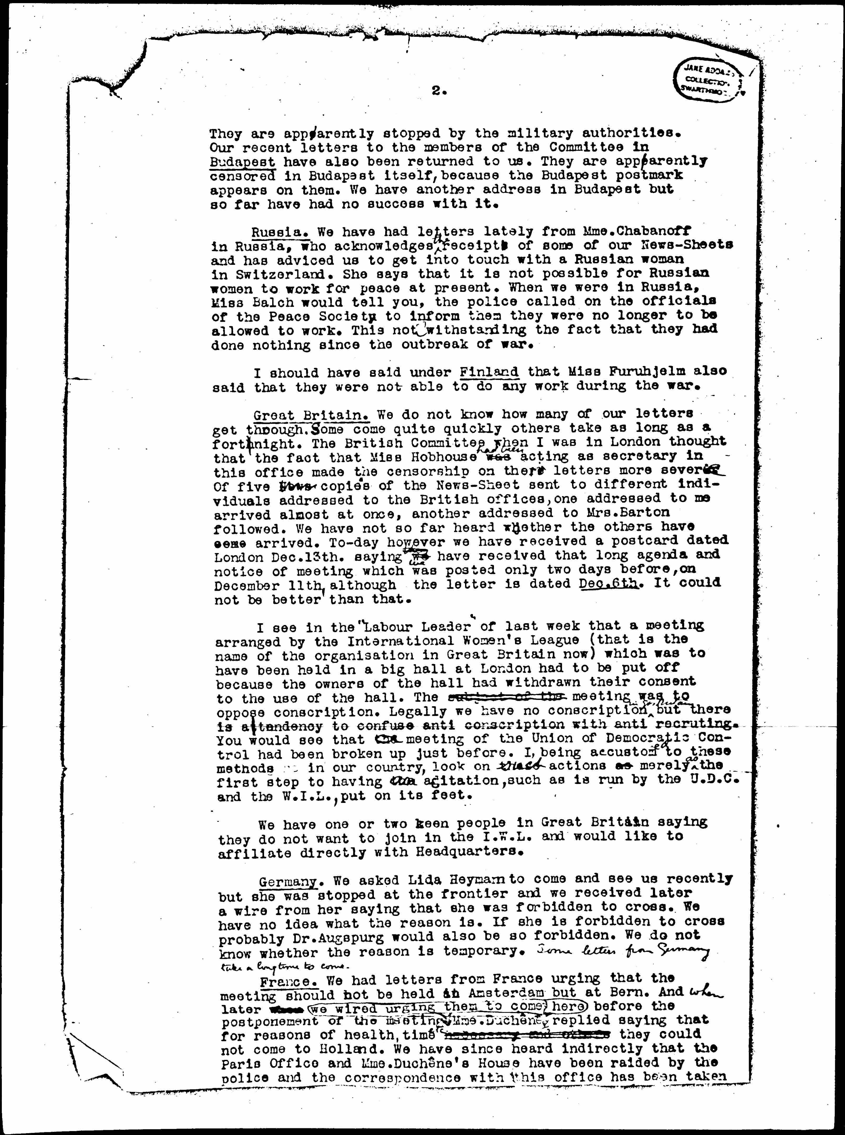 Great Britain. We do not know how many of our letters get through. Some come quite quickly others take as long as a fortnight. The British Committee when I was in London thought that the fact that Miss Hobhouse was <had been> acting as secretary in this office made the censorship on their letters more severe. Of five News copies of the News-Sheet sent to different individuals addressed to the British offices, one addressed to me arrived almost at once, another addressed to Mrs. Barton followed. We have not so far heard whether the others have come arrived. [Today] however we have received a postcard dated London Dec. 13th. saying we <they> <we> have received that long agenda and notice of meeting which was posted only two days before, on December 11th, although the letter is dated Dec. 6th. It could not be better than that.