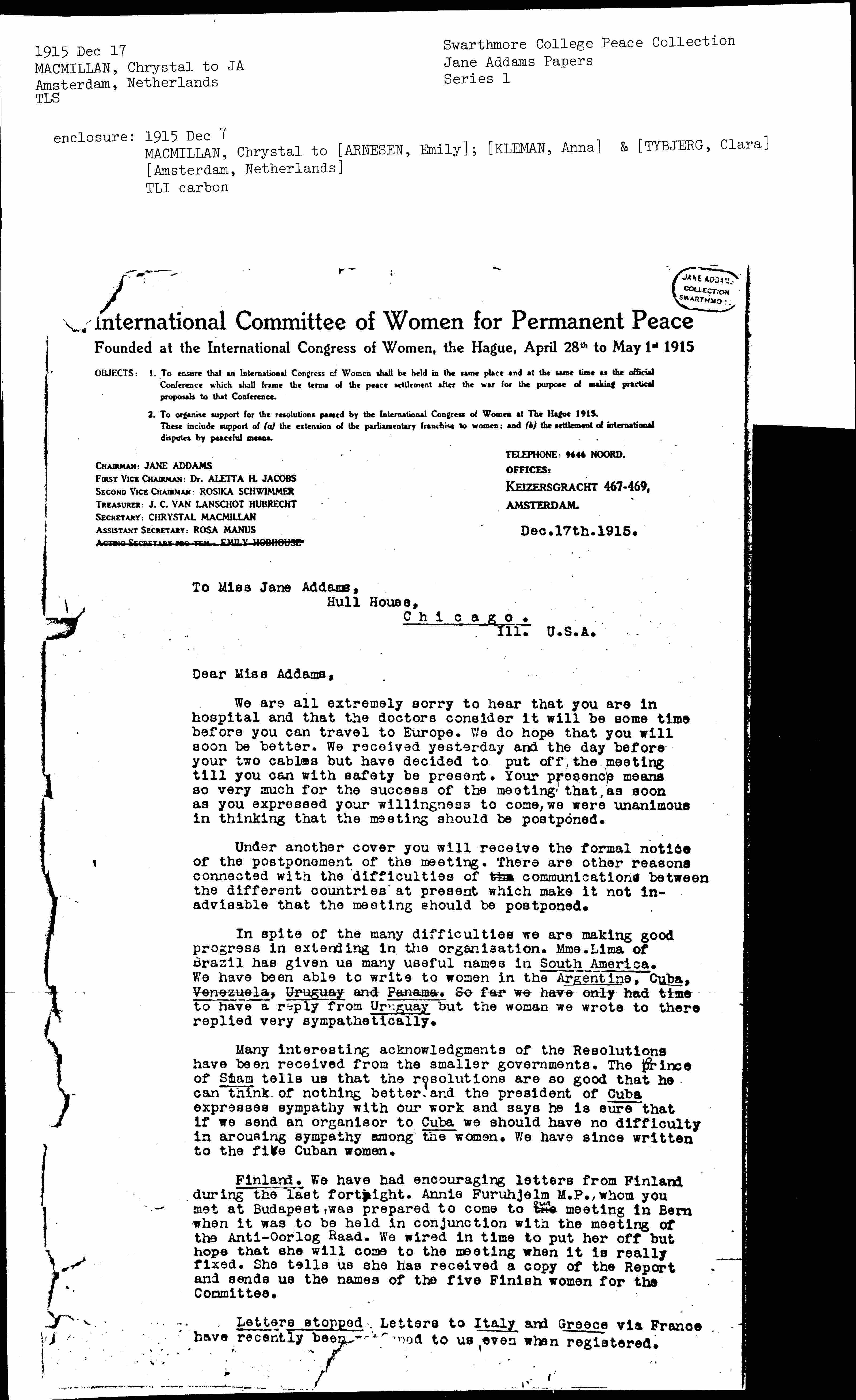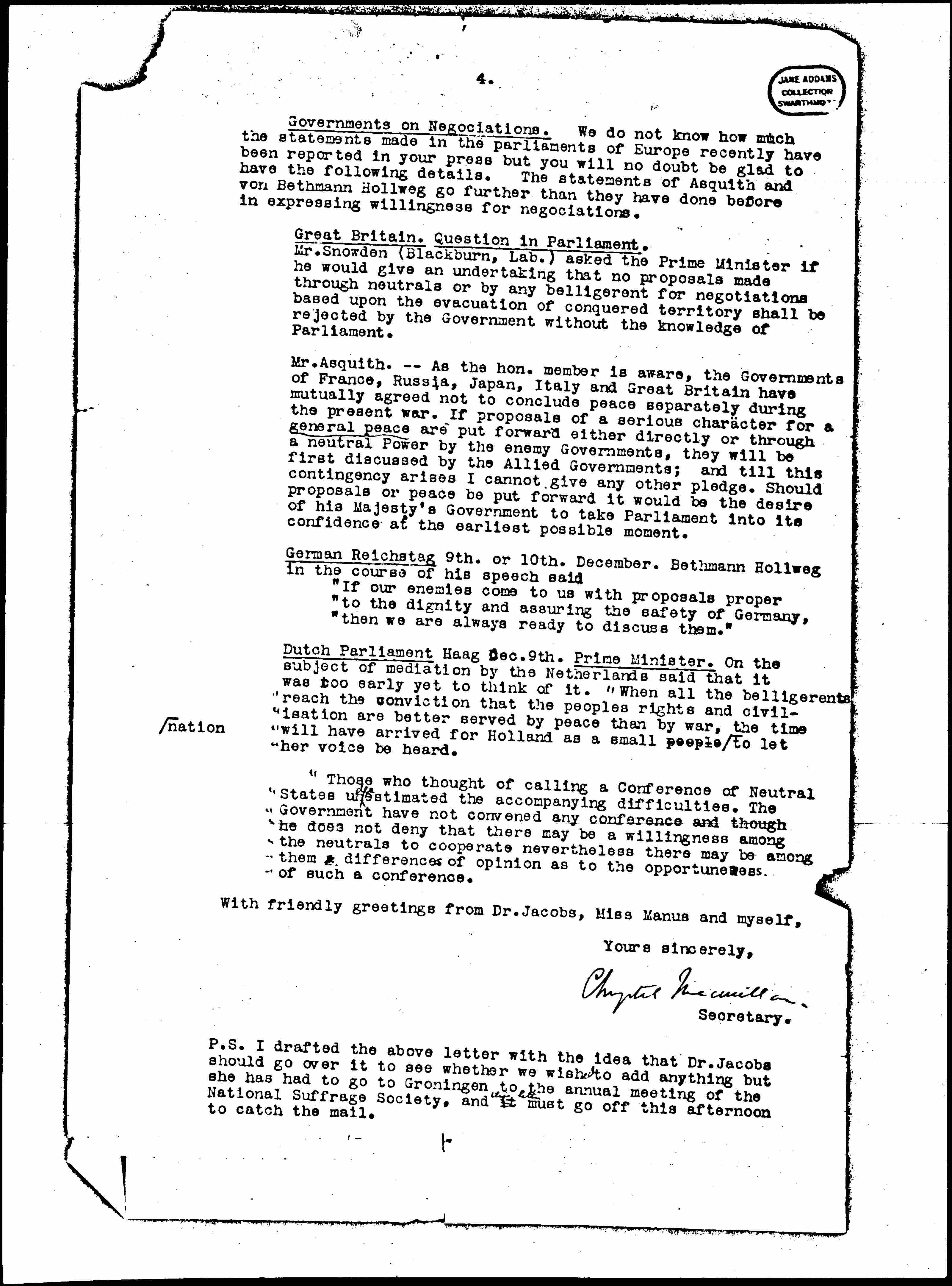 P.S. I drafted the above letter with the idea that Dr. Jacobs should go over it to see whether we wished to add anything but she has had to go to Groningen to the annual meeting of the National Suffrage Society, and it <this letter> must go off this afternoon to catch the mail.