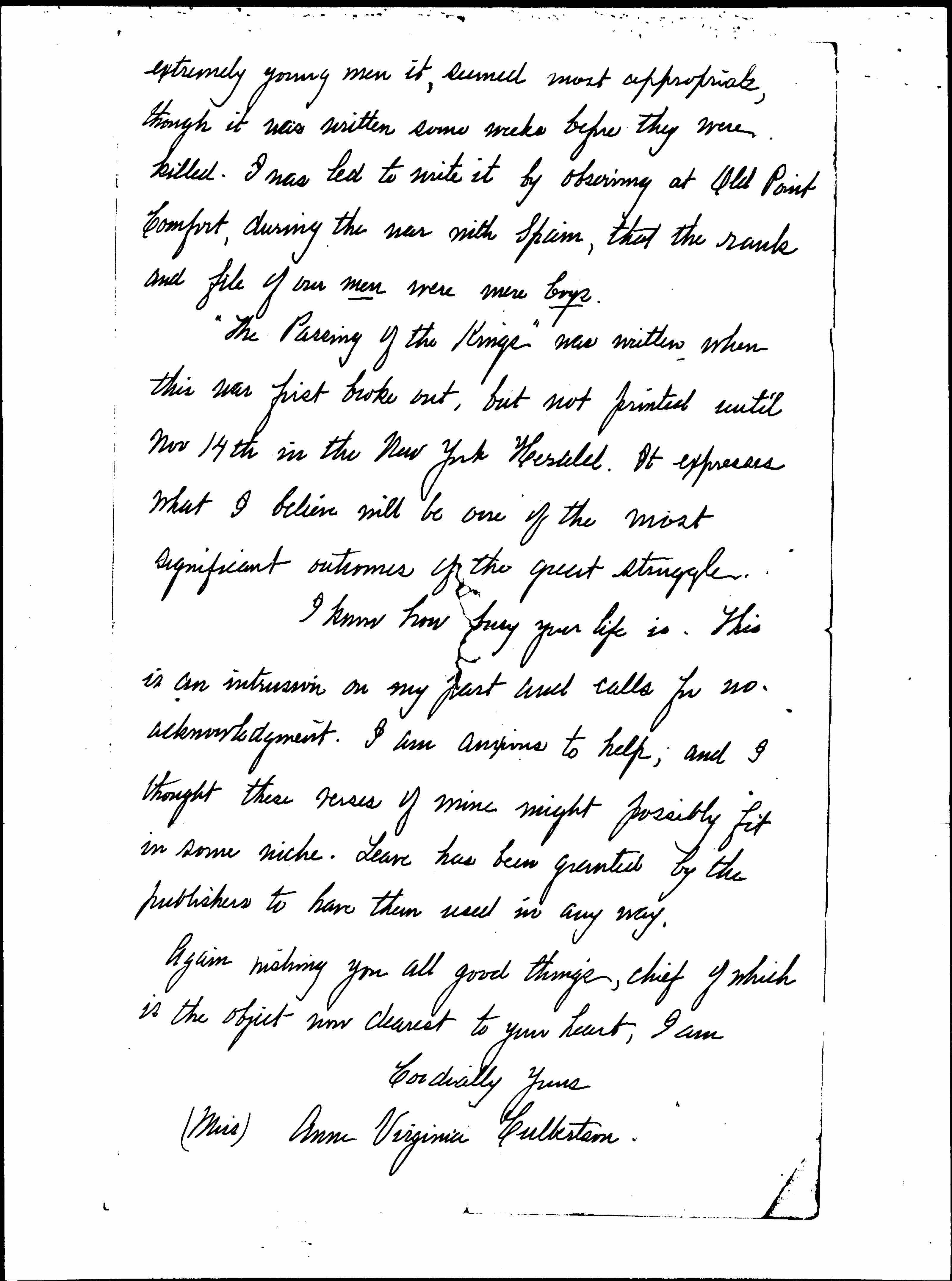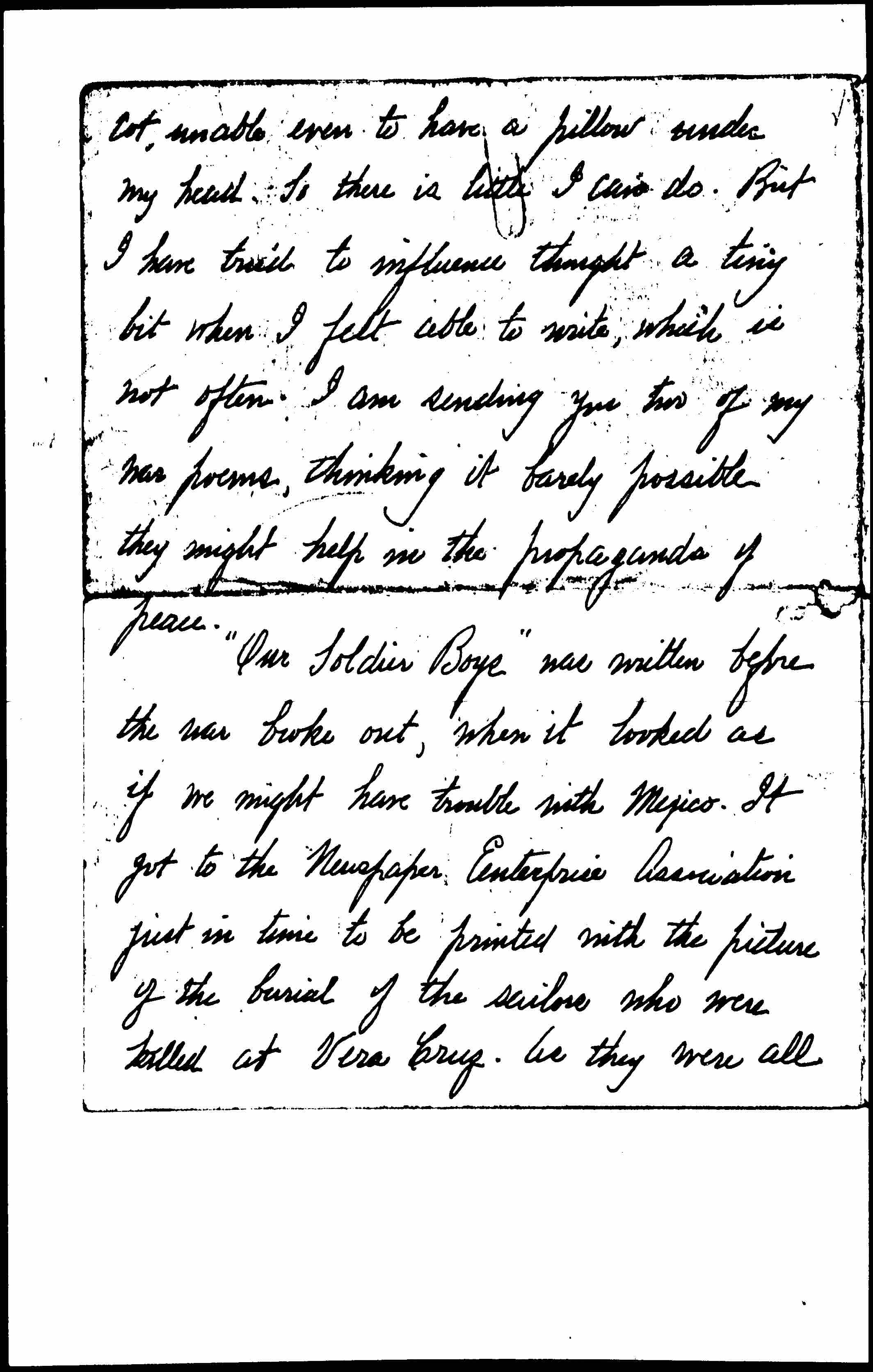 "Our Soldier Boys” was written before the war broke out, when it looked as if we might have trouble with Mexico. It got to the Newspaper Enterprise Association just in time to be printed with the picture of the burial of the sailors who were killed at Vera Cruz. As they were all [page 3] extremely young men it seemed most appropriate, though it was written some weeks before they were killed. I was led to write it by observing at Old Point Comfort, during the war with Spain, that the rank and file of our men were mere boys.