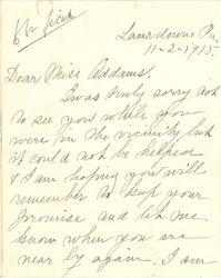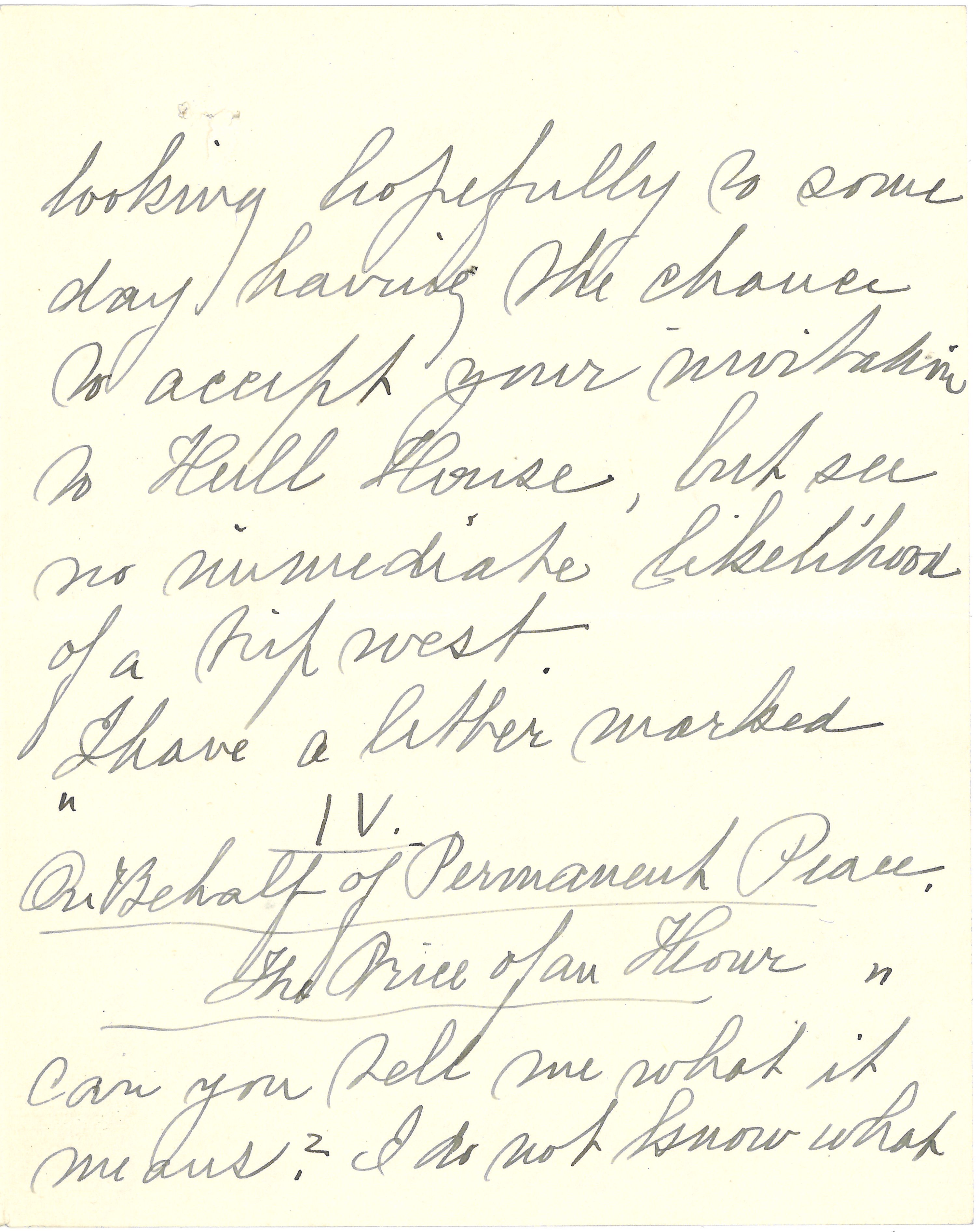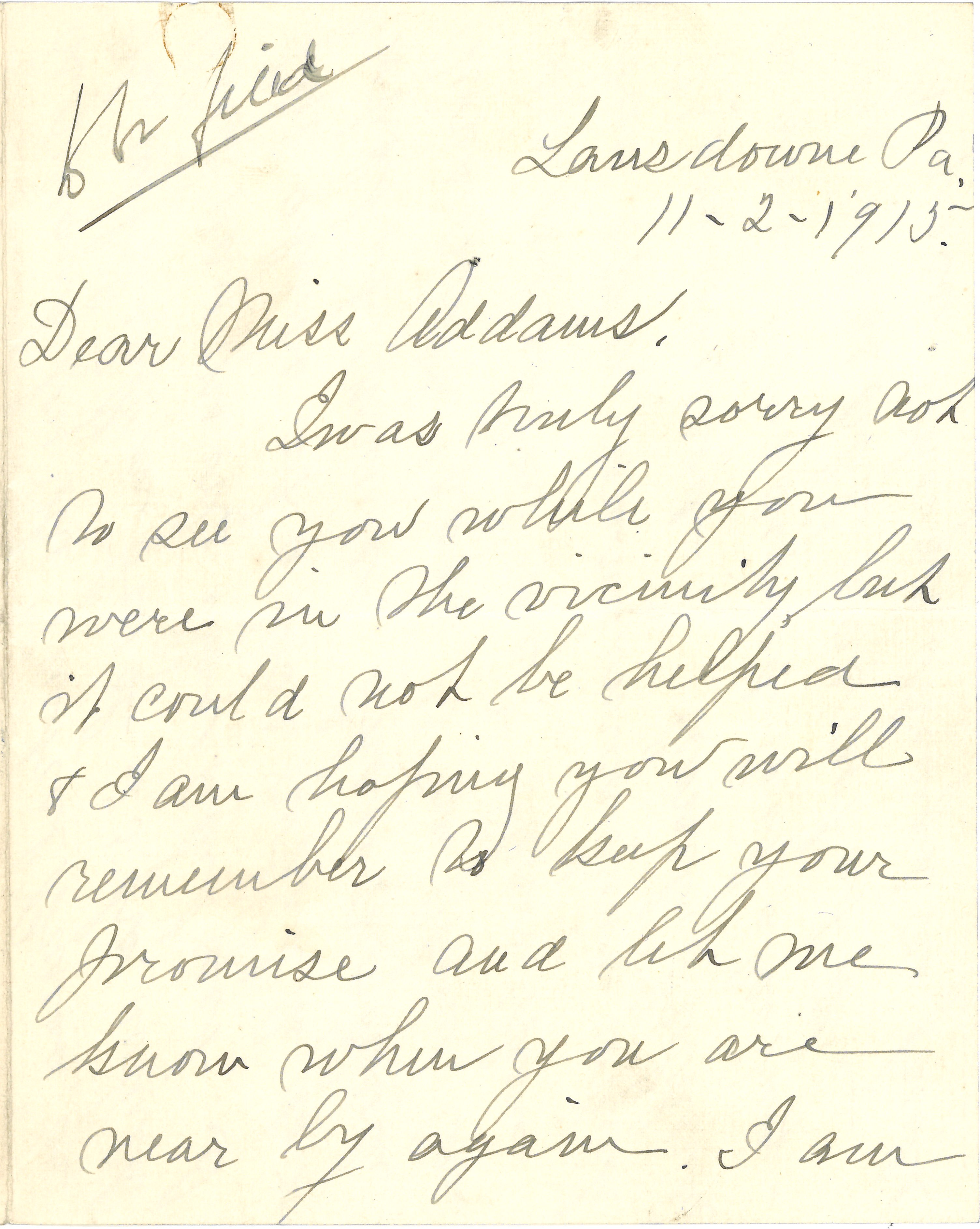 I was truly sorry not to see you while you were in the vicinity but it could not be helped & I am hoping you will remember to keep your promise and let me know when you are near by again. I am [page 2] looking hopefully to some day having the chance to accept your invitation to Hull House, but see no immediate likelihood of a trip west.