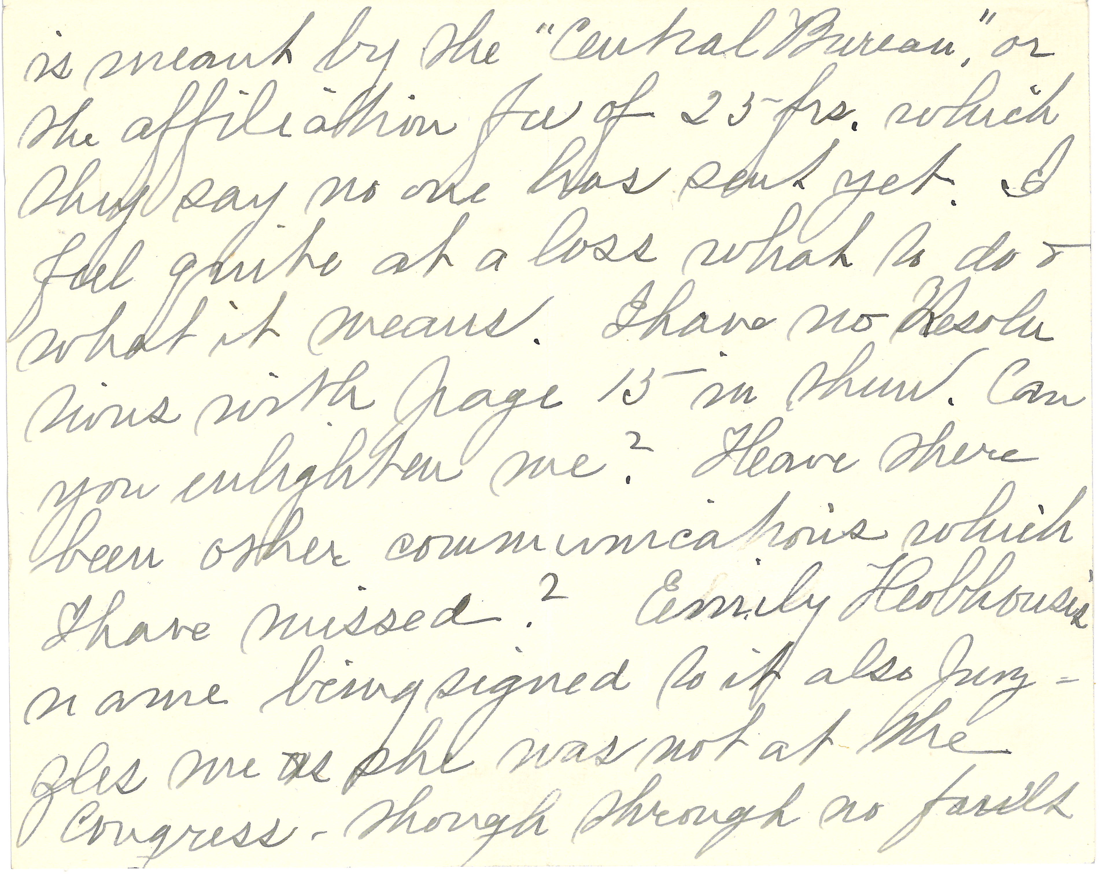Can you tell me what it means? I do not know what [page 3] is meant by the "Central Bureau," or the affiliation fee of 25 frs. which they say no one has sent yet. I feel quite at a loss what to do & what it means. I have no Resolutions with page 15 in [there]. Can you enlighten me? Have there been other communications which I have missed? Emily Hobhouse's name being signed to it also puzzles me as she was not at the Congress -- though through no fault [page 4] of hers.