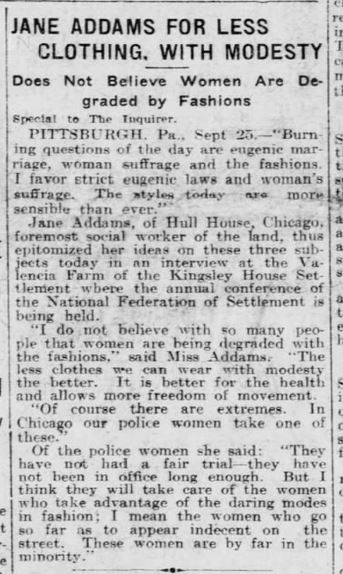 "I do not believe with so many people that women are being degraded with the fashions," said Miss Addams. "The less clothes we can wear with modesty the better. It is better for the health and allows more freedom of movement.