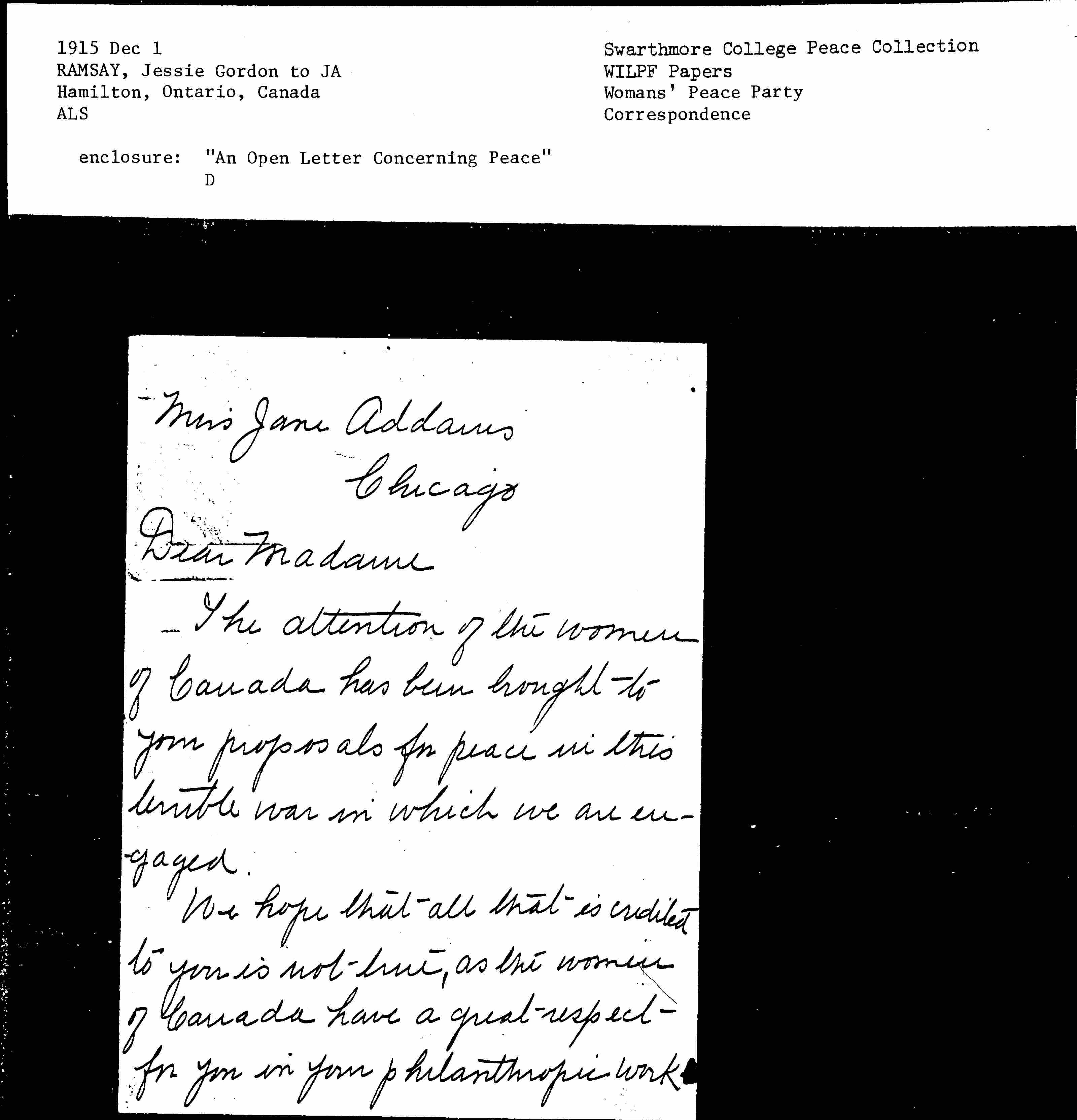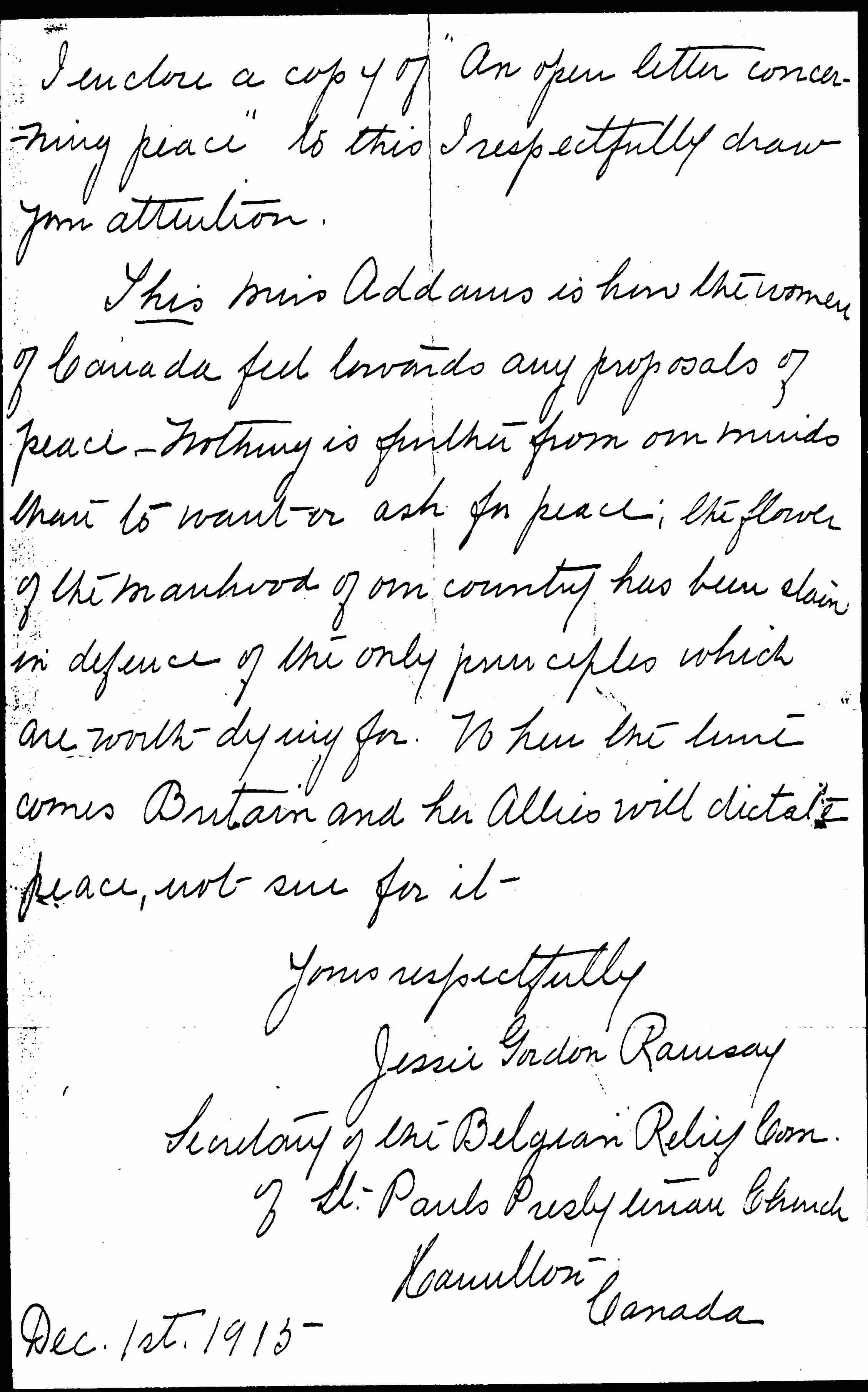This Miss Addams is how the women of Canada feel towards any proposals of peace -- Nothing is further from our minds than to want or ask for peace; the flower of the manhood of our country has been slain in [defense] of the only principles which are worth dying for. When the time comes Britain and her Allies will dictate peace, not sue for it.