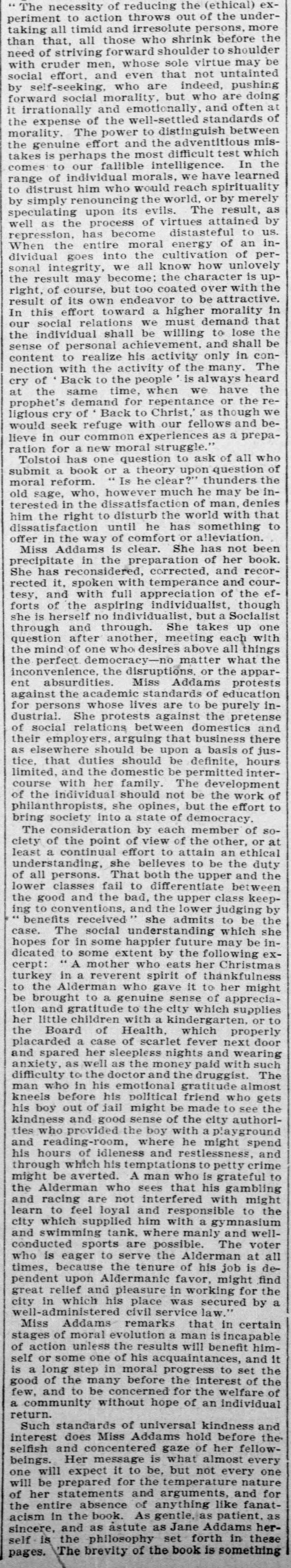 Miss Addams is clear. She has not been precipitate in the preparation of her book. She has reconsidered, corrected, and recorrected it, spoken with temperance and courtesy, and with full appreciation of the efforts of the aspiring individualist, though she is herself no individualist, but a Socialist through and through. She takes up one question after another, meeting each with the mind of one who desires above all things the perfect democracy -- no matter what the inconvenience, the disruptions, or the apparent absurdities Miss Addams protests against the academic standards of education for persons whose lives are to be purely industrial. She protests against the pretense of social relations between domestics and their employers, arguing that business there as elsewhere should be upon a basis of justice, that duties should be definite, hours limited, and the domestic be permitted intercourse with her family. The development of the individual should not be the work of philanthropists, she opines, but the effort to bring society into a state of democracy.