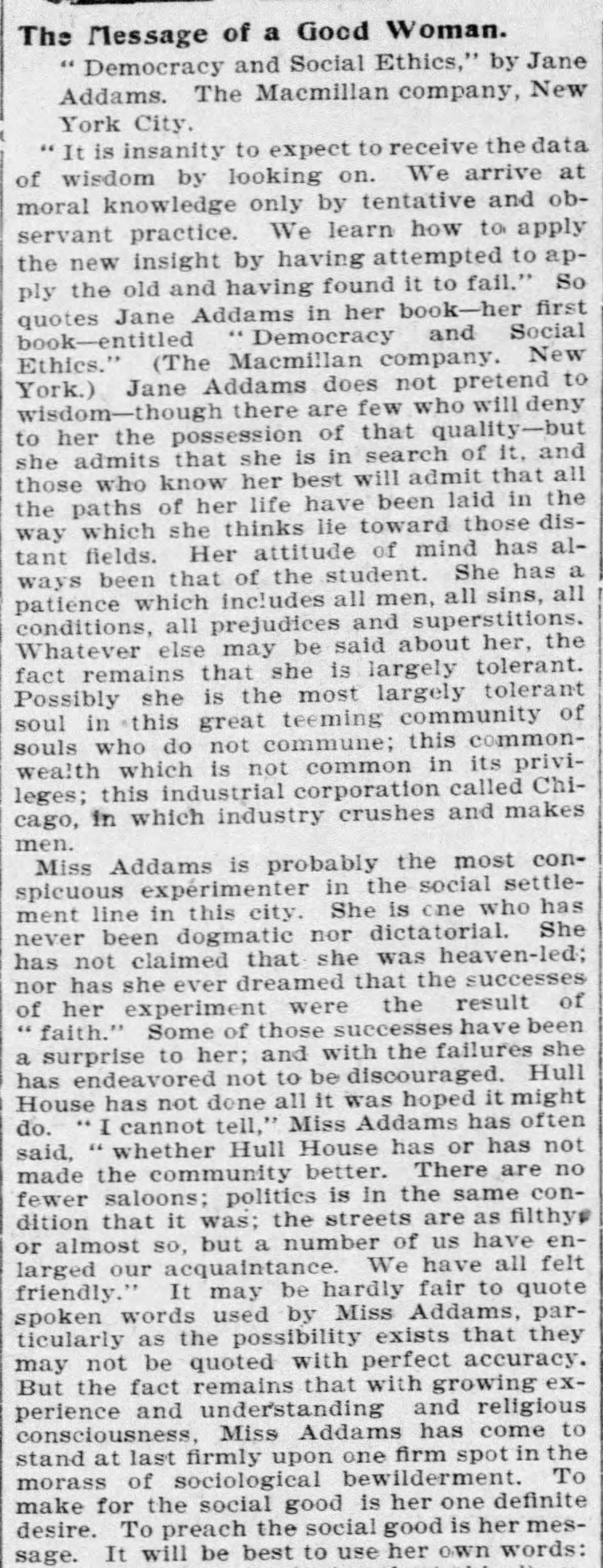 "It is insanity to expect to receive the data of wisdom by looking on. We arrive at moral knowledge only by tentative and observant practice. We learn how to apply the new insight by having attempted to apply the old and having found it to fail." So quotes Jane Addams in her book -- her first book -- entitled "Democracy and Social Ethics." (The Macmillan company. New York.) Jane Addams does not pretend to wisdom -- though there are few who will deny to her the possession of that quality -- but she admits that she is in search of it, and those who know her best will admit that all the paths of her life have been laid in the way which she thinks lie toward those distant fields. Her attitude of mind has always been that of the student. She has a patience which includes all men, all sins, all conditions, all prejudices and superstitions. Whatever else may be said about her, the fact remains that she is largely tolerant. Possibly she is the most tolerant soul in this great teeming community of souls who do not commune; this commonwealth which is not common in its privileges; this industrial corporation called Chicago, in which industry crushes and makes men.