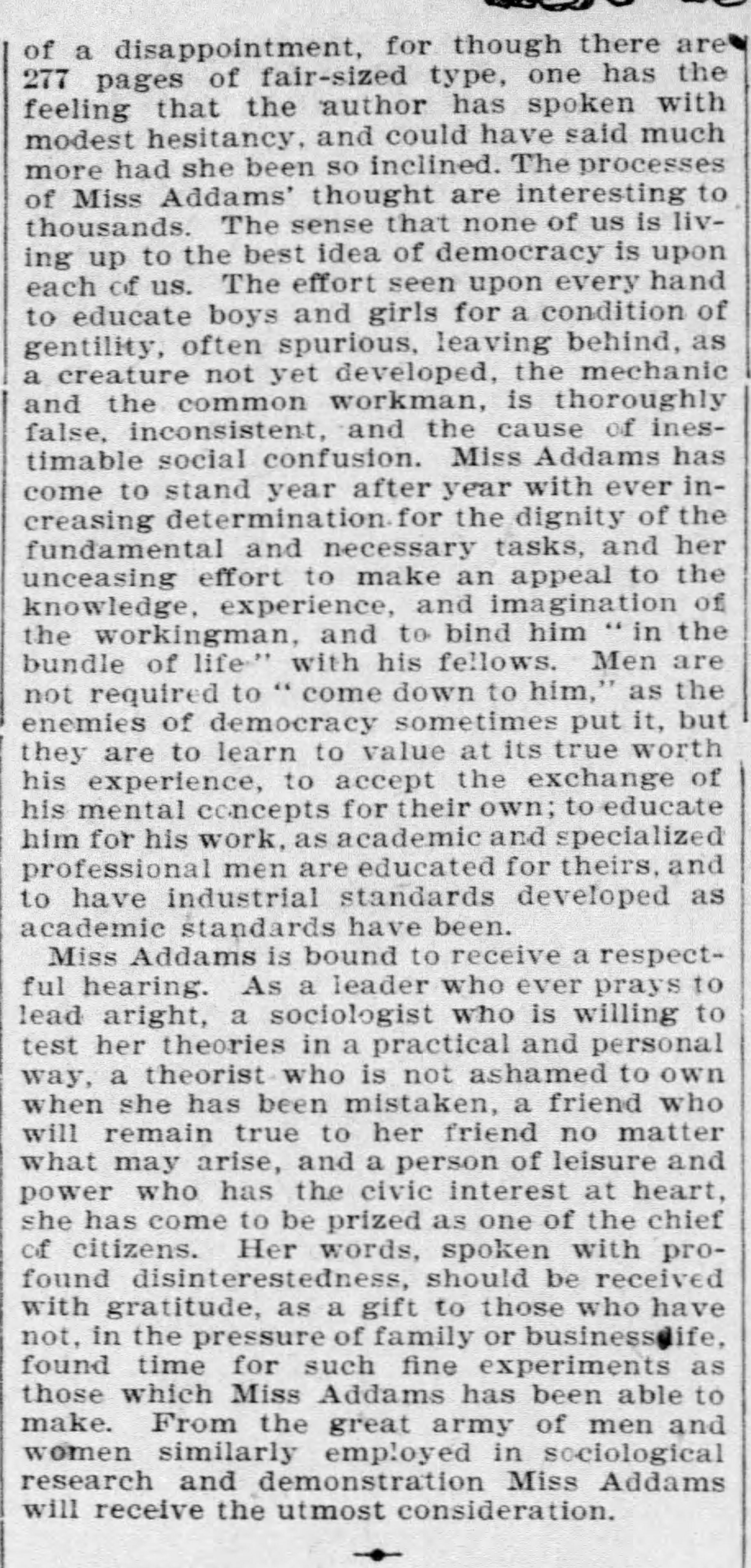 Miss Addams is bound to receive a respectful hearing. As a leader who ever prays to lead aright, a sociologist who is willing to test her theories in a practical and personal way, a theorist who is not ashamed to own when she has been mistaken, a friend who will remain true to her friend no matter what may arise, a person of leisure and power who has the civic interest at heart, she has come to be prized as one of the chief of citizens. Her words, spoken with profound disinterestedness, should be received with gratitude, as a gift to those who have not, in the pressure of family or business life, found time for such fine experiments as those which Miss Addams has been able to make. From the great army of men and women similarly employed in sociological research and demonstration Miss Addams will receive utmost consideration.