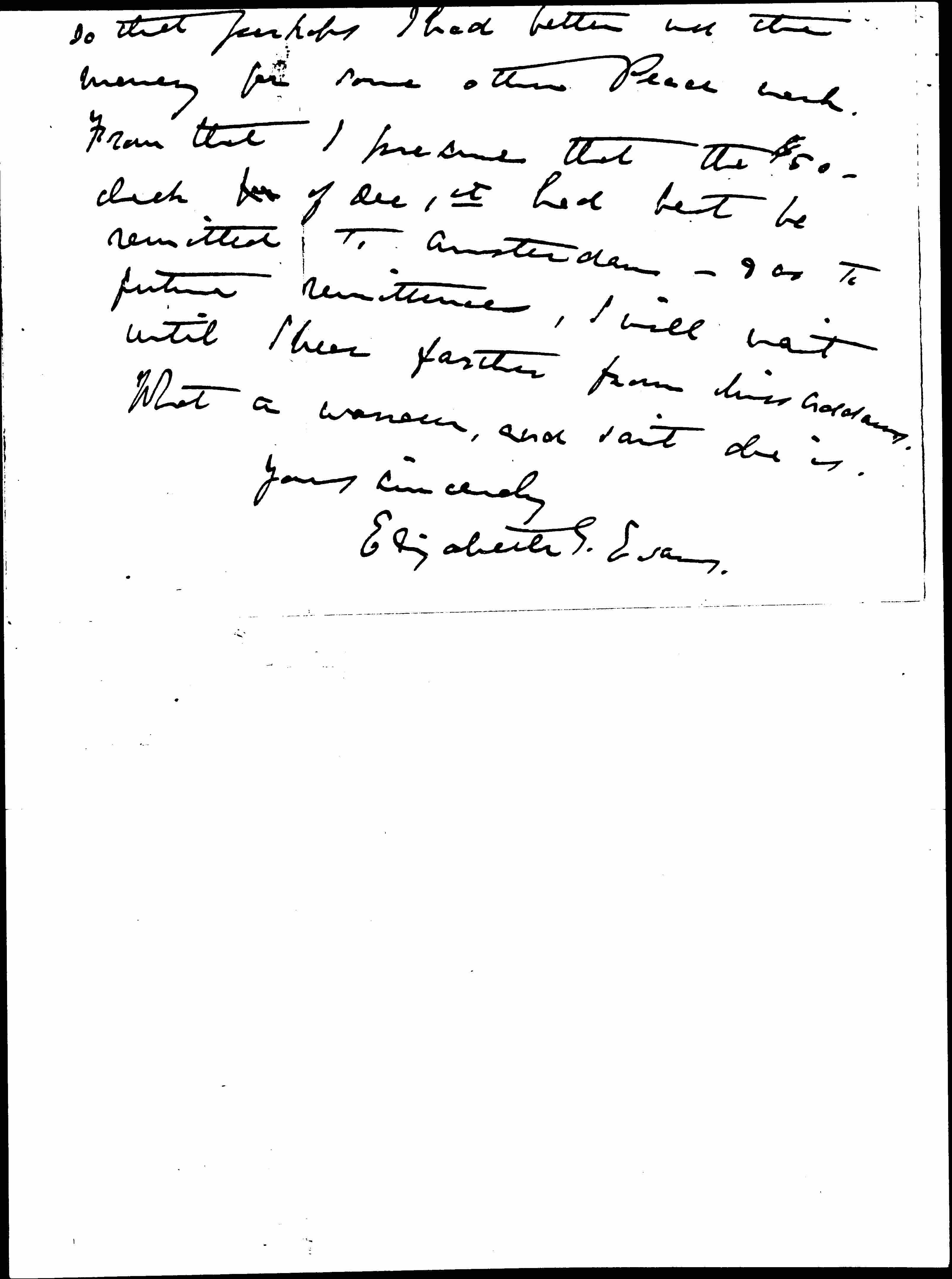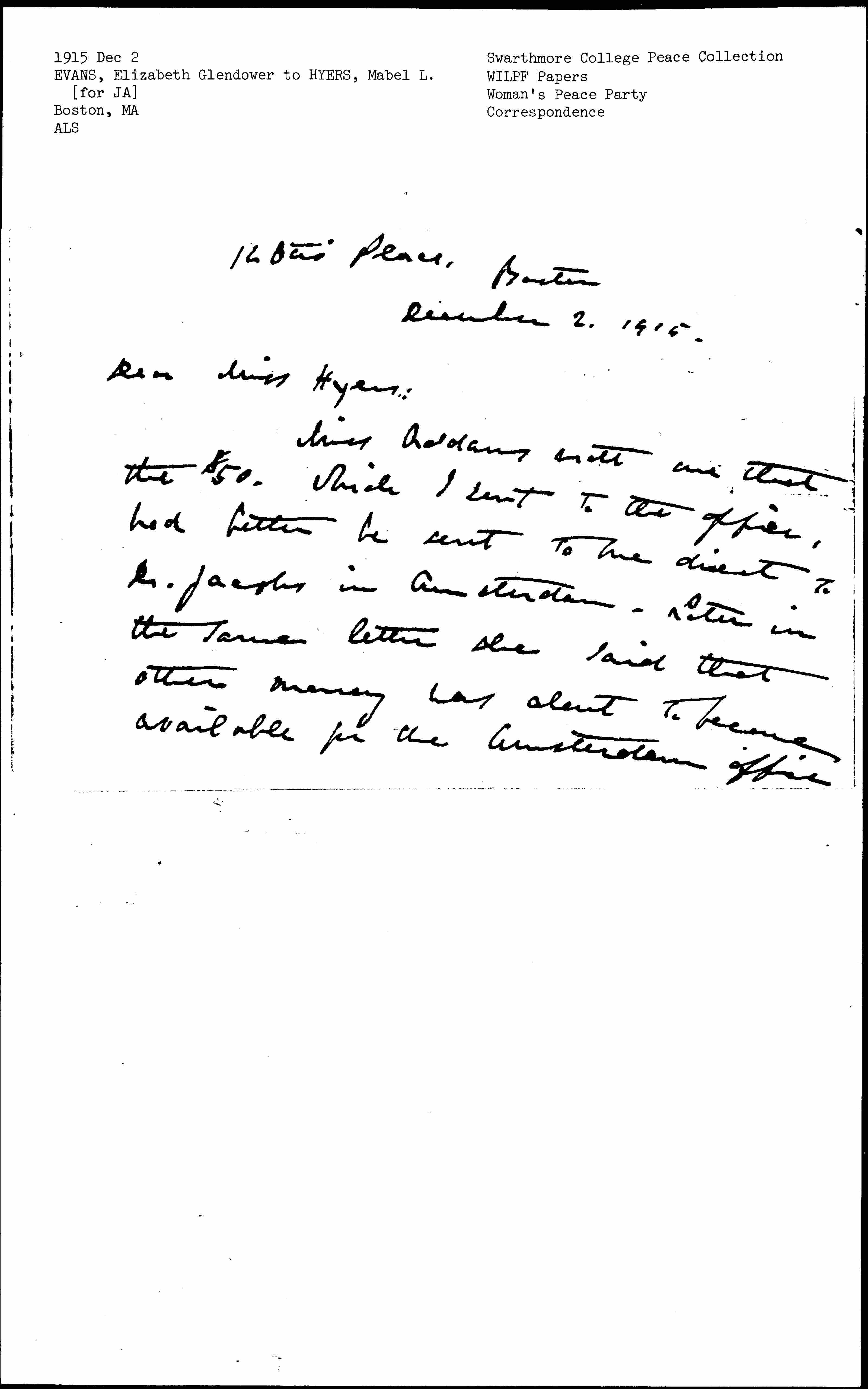 Miss Addams wrote me that the $50. which I sent to the office, had better be sent to me direct to Dr. Jacobs in Amsterdam. Later in the same letter she said that other money was about to become available for the Amsterdam office [page 2] so that perhaps I had better use the money for some other Peace work. From that I presume that the $50. check for of Dec 1st had best be remitted to Amsterdam -- & as to further remittances, I will wait until I hear farther from Miss Addams. What a woman, and saint she is.