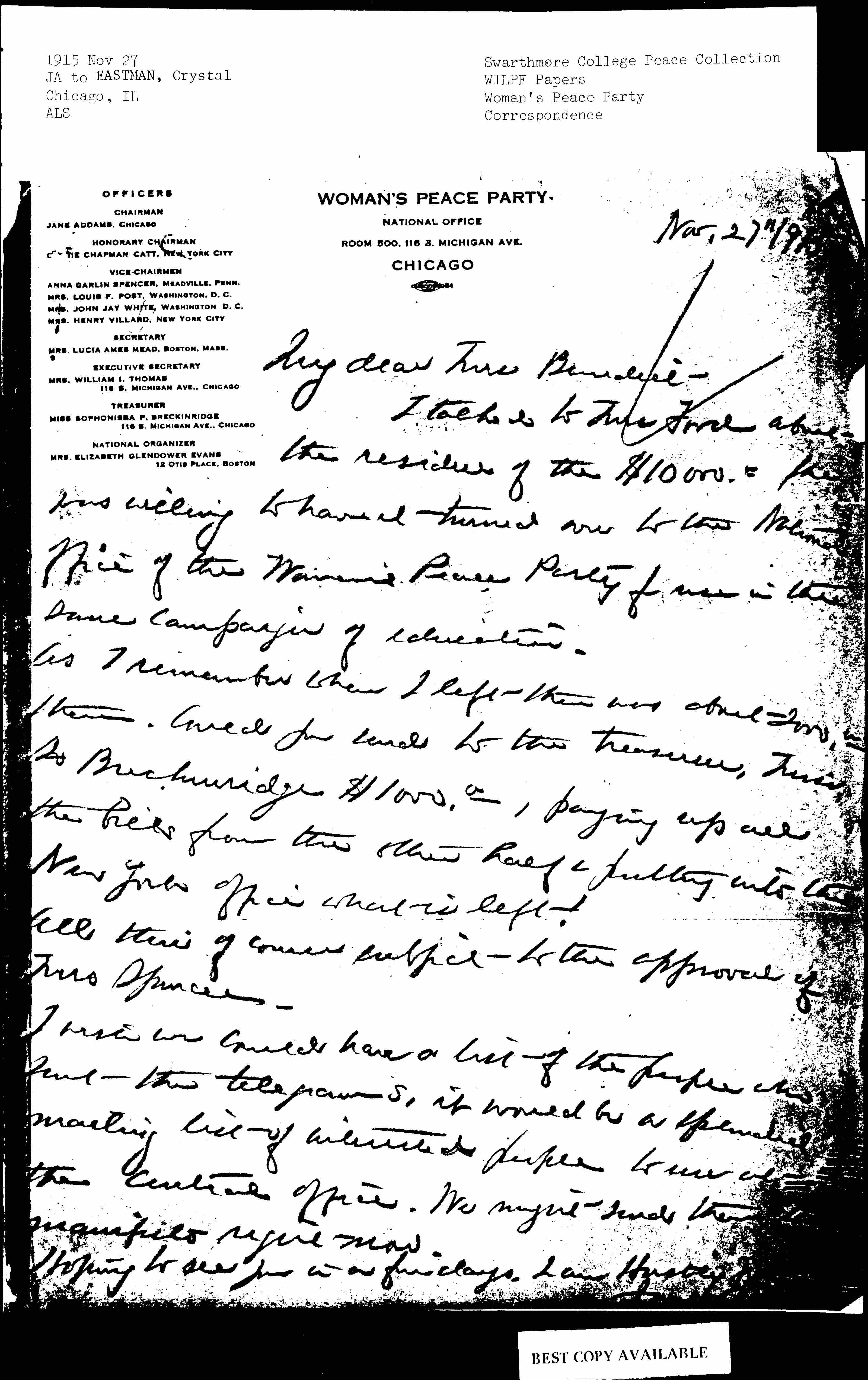I talked to Mrs Ford about the residue of the $10,000.00. She was willing to have it turned over to the National office of the Woman's Peace Party for use in the same campaign of education.