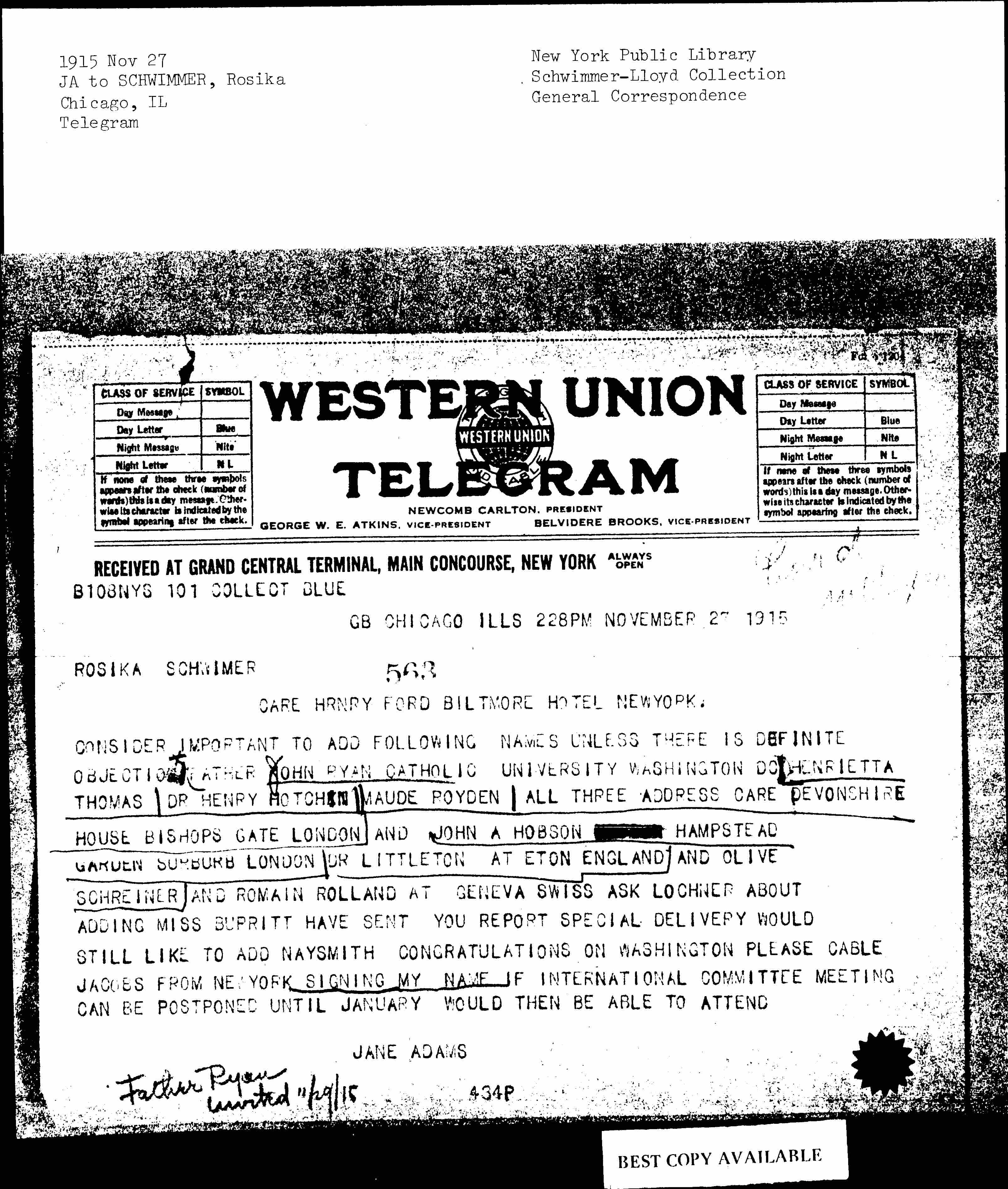 CONSIDER IMPORTANT TO ADD FOLLOWING NAMES UNLESS THERE IS DEFINITE OBJECTION <to> FATHER JOHN RYAN CATHOLIC UNIVERSITY WASHINGTON DC HENRIETTA THOMAS DR HENRY [HODGKIN] MAUDE ROYDEN ALL THREE ADDRESS CARE DEVONSHIRE HOUSE BISHOPS GATE LONDON AND JOHN A HOBSON HAMPSTEAD GARDEN SUBURB LONDON DR [LYTTELTON] AT ETON ENGLAND AND OLIVE SCHREINER AND ROMAIN ROLLAND AT GENEVA SWISS ASK LOCHNER ABOUT ADDING MISS BURRITT HAVE SENT YOU REPORT SPECIAL DELIVERY WOULD STILL LIKE TO ADD [NASMYTH] CONGRATULATIONS ON WASHINGTON PLEASE CABLE JACOBS FROM NEW YORK SIGNING MY NAME IF INTERNATIONAL COMMITTEE MEETING CAN BE POSTPONED UNTIL JANUARY WOULD THEN BE ABLE TO ATTEND