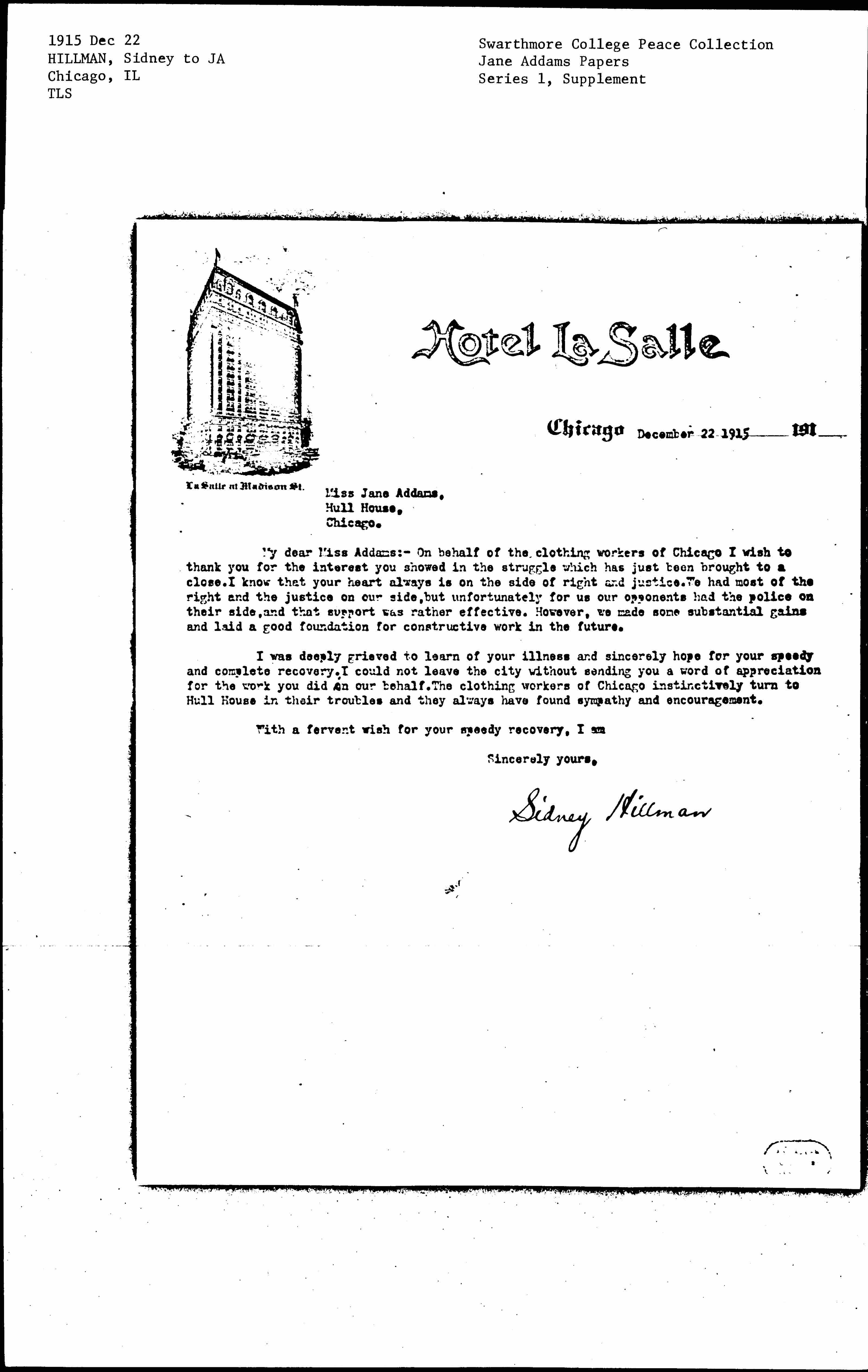 I was deeply grieved to learn of your illness and sincerely hope for your speedy and complete recovery. I could not leave the city without sending you a word of appreciation for the work you did on our behalf. The clothing workers of Chicago instinctively turn to Hull House in their troubles and they always have found sympathy and encouragement.