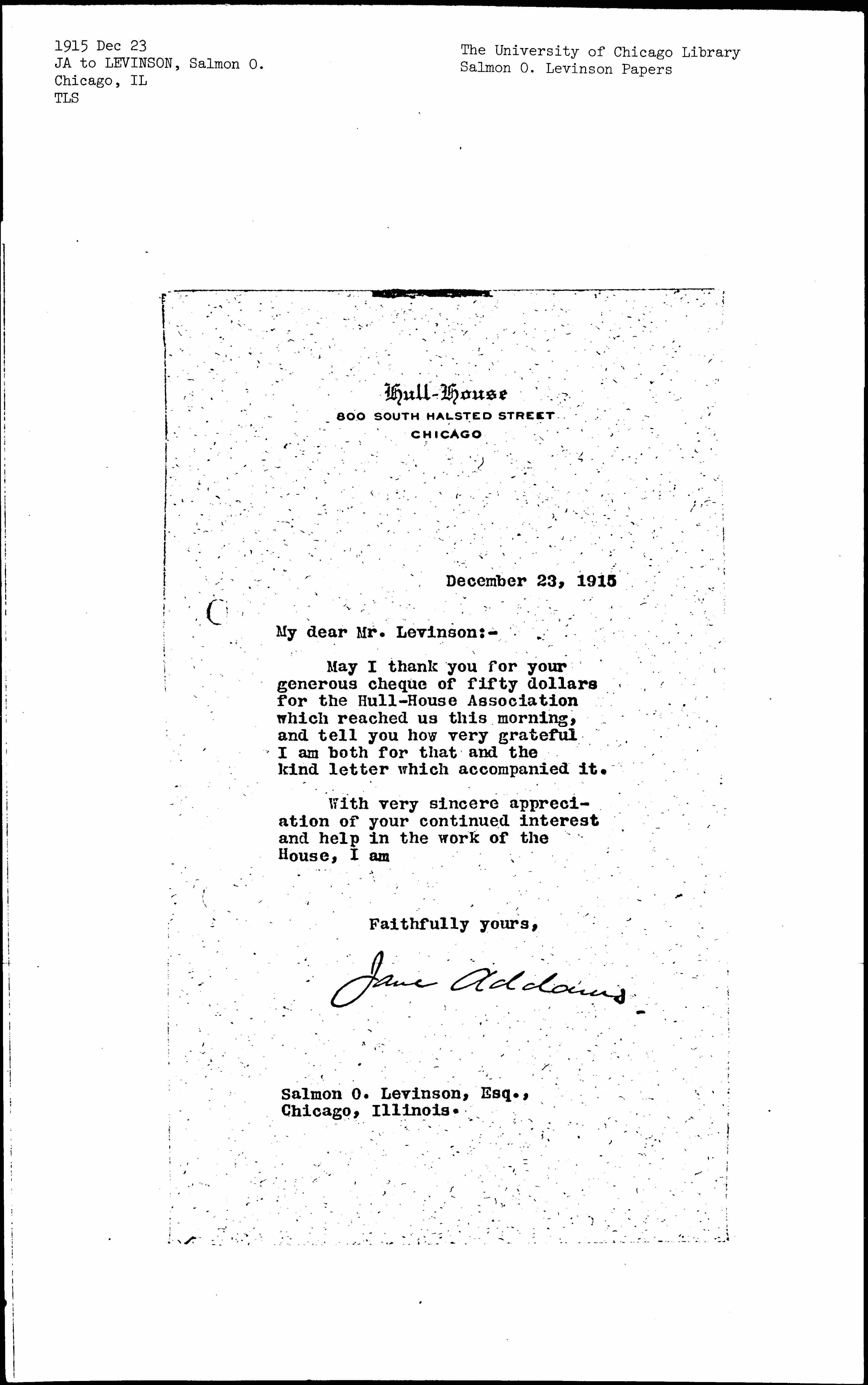 May I thank you for your generous [check] of fifty dollars for the Hull-House Association which reached us this morning, and tell you how very grateful I am both for that and the kind letter which accompanied it.