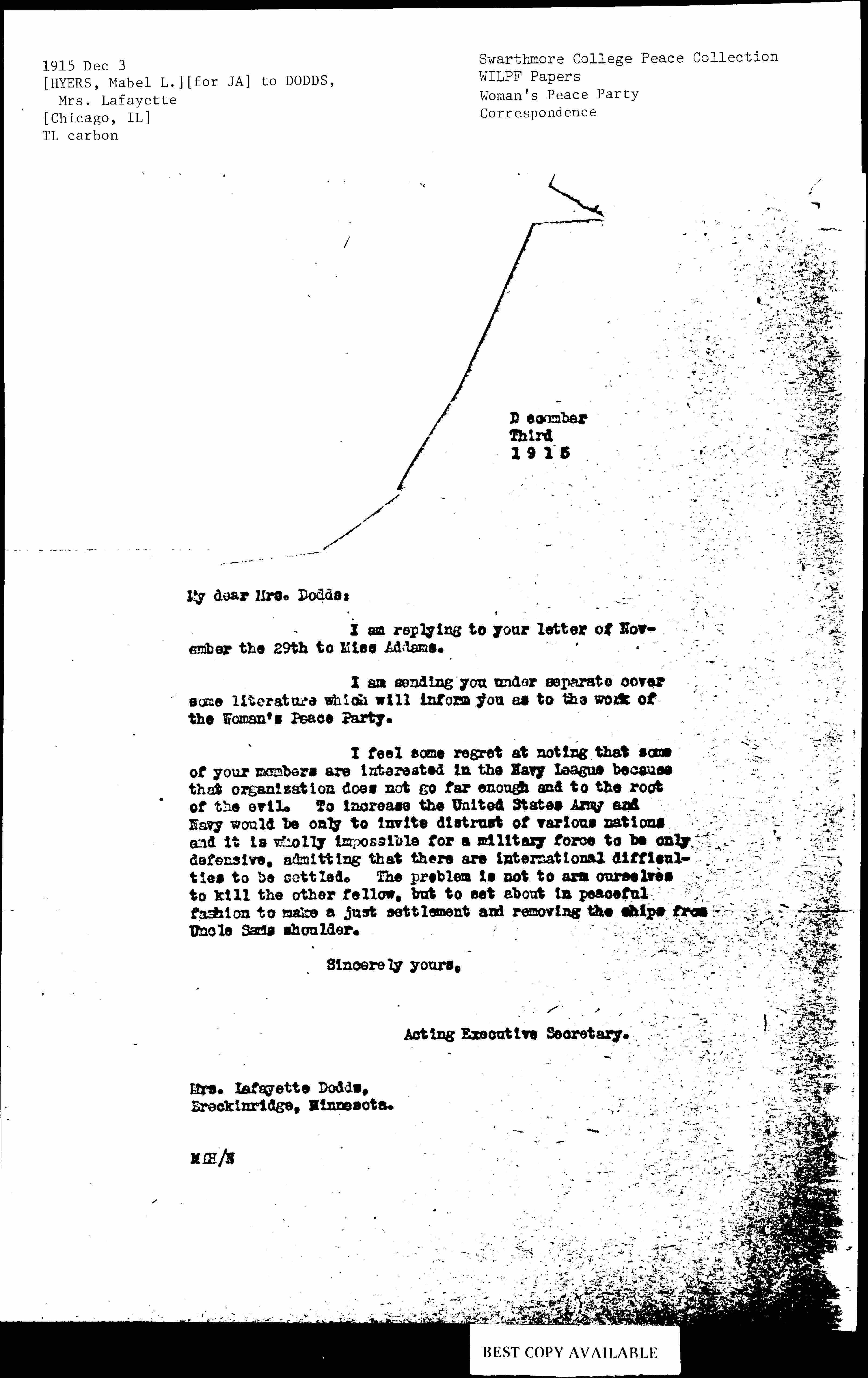 I feel some regret at noting that some of your members are interested in the Navy League because that organization does not go far enough and to the root of the evil. To increase the United States Army and Navy would be only to invite distrust of various nations and it is wholly impossible for a military force to be only defensive, admitting that there are international difficulties to be settled. The problem is not to arm ourselves to kill the other fellow, but to set about in peaceful fashion to make a just settlement and removing the ships from Uncle Sam's shoulder.
