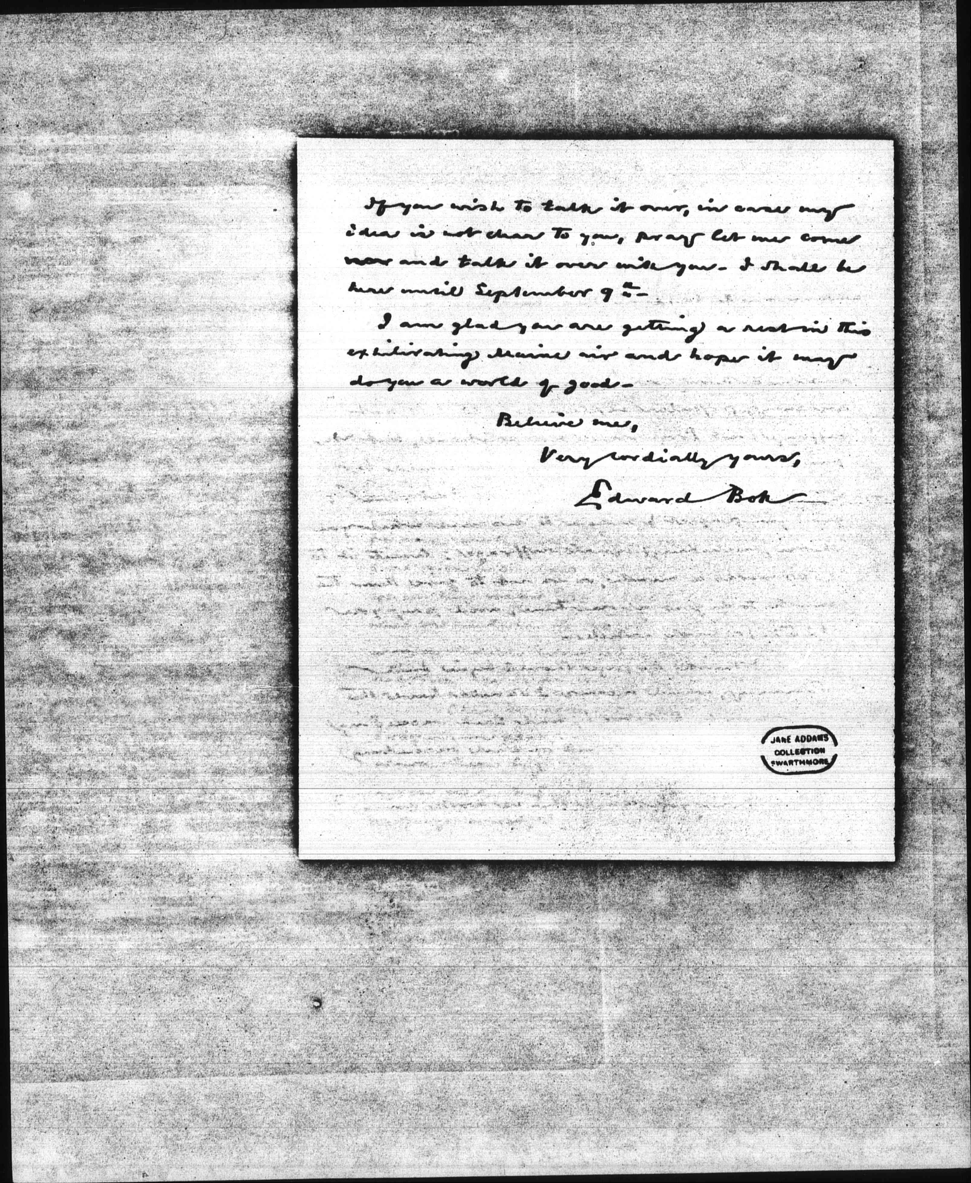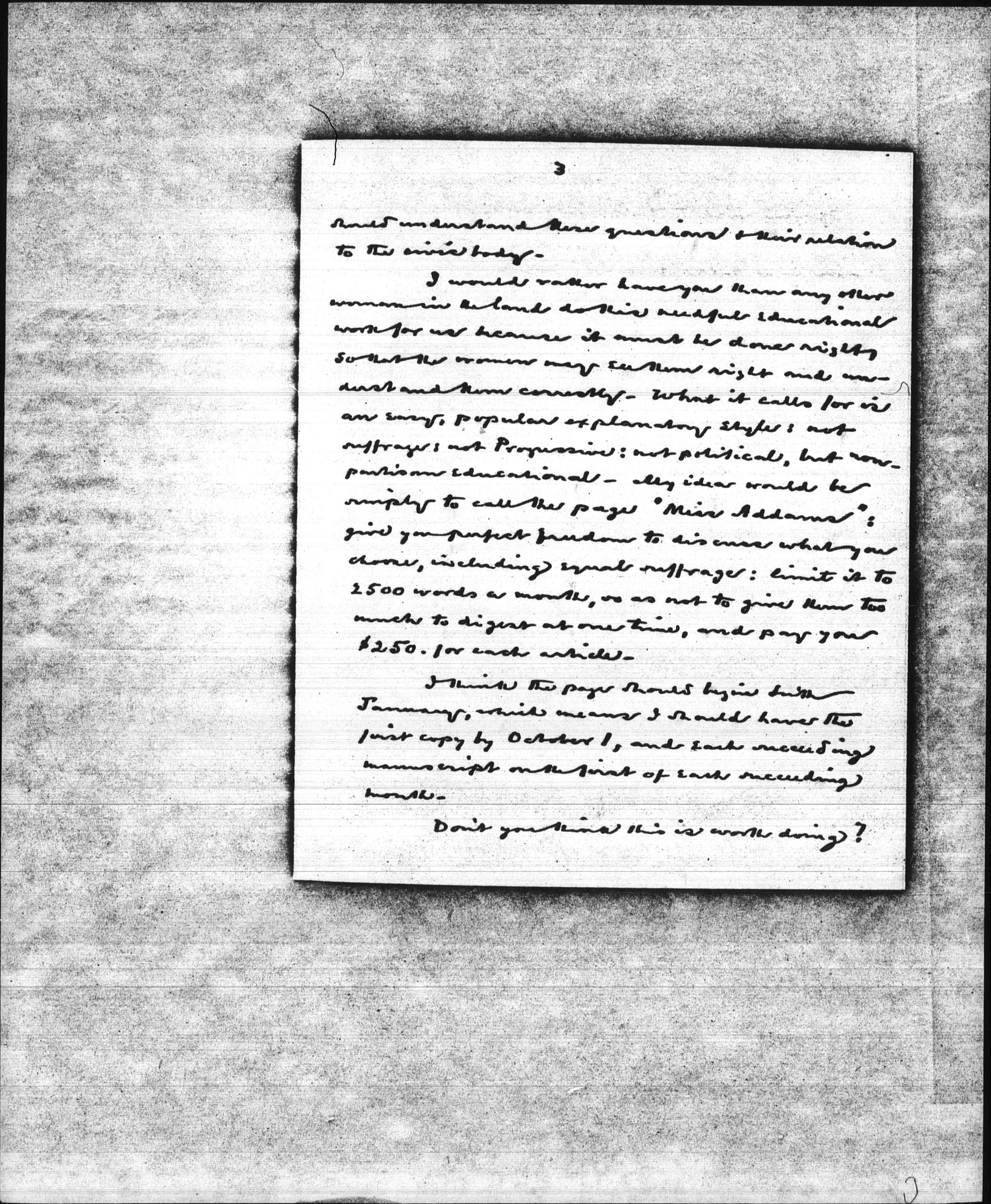 I would rather have you than any other woman in the land do this mindful Educational work for us because it must be done right so that the women may see them right and understand them correctly. What it calls for is an essay, popular explanatory style: not suffrage; not Progressive; not political, but non-partisan Educational. My idea would be simply to call the page "Miss Addams": give you perfect freedom to discuss what you choose, including equal suffrage: limit is to 2500 words a month, so as not to give them too much to digest at one time, and pay you $250. for each article.