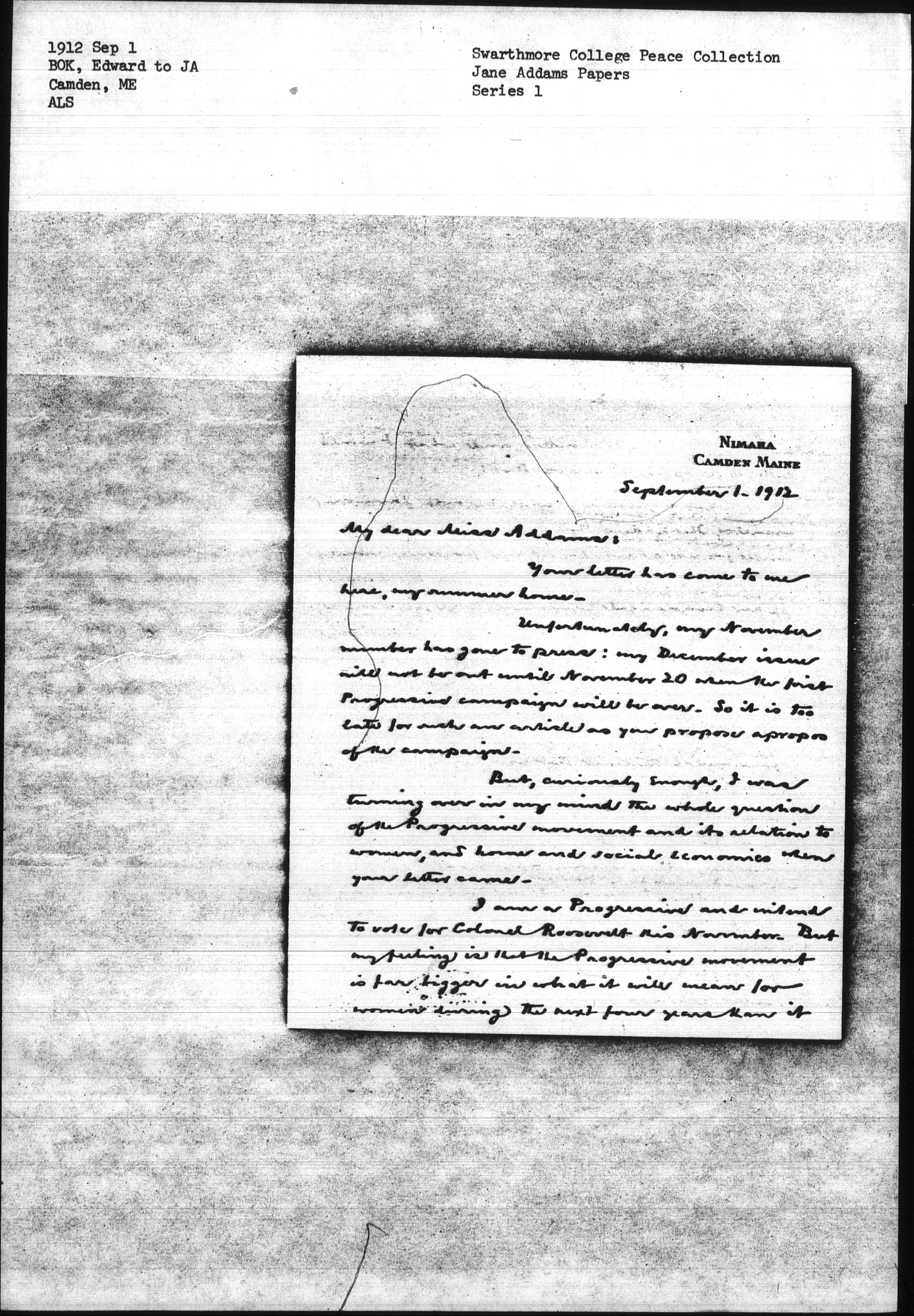 I am a Progressive and intend to vote for Colonel Roosevelt this November. But my feeling is that the Progressive movement is far bigger in what it will mean for women during the next four years than it [page 2] will in the next two months, and what I would like to propose to you is this: