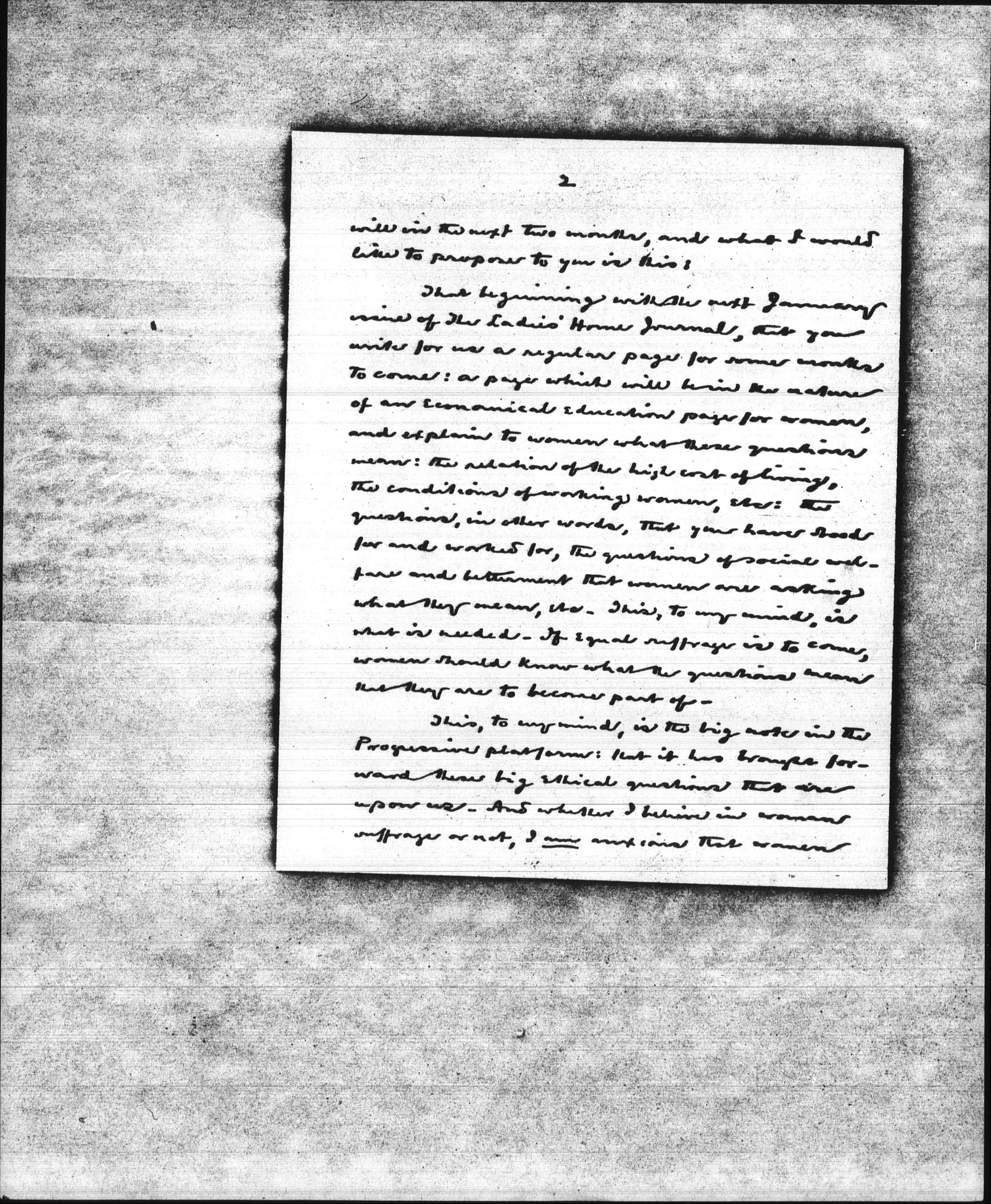 That beginning with the next January issue of The Ladies' Home Journal, that you write for us a regular page for some weeks to come: a page which will be in the nature of an Economical Education page for women, and explain to women what these questions mean: the relation of the high cost of living, the conditions of working women, etc: the questions, in other words, that you have stood for and worked for, the questions of social welfare and betterment that women are asking what they mean, etc. This, to my mind, is what is needed. If equal suffrage is to come, women should know what the questions mean that they are to become a part of.