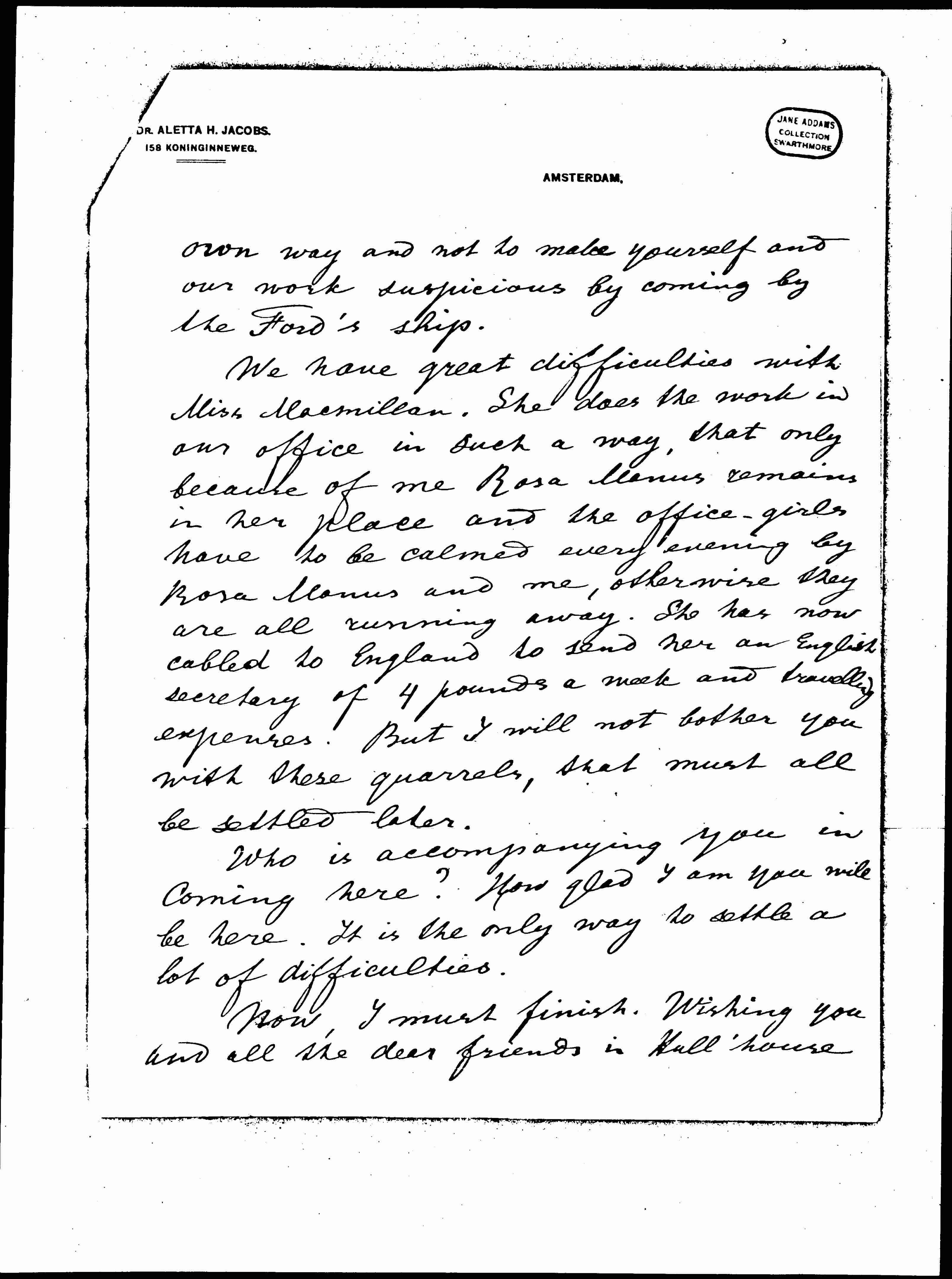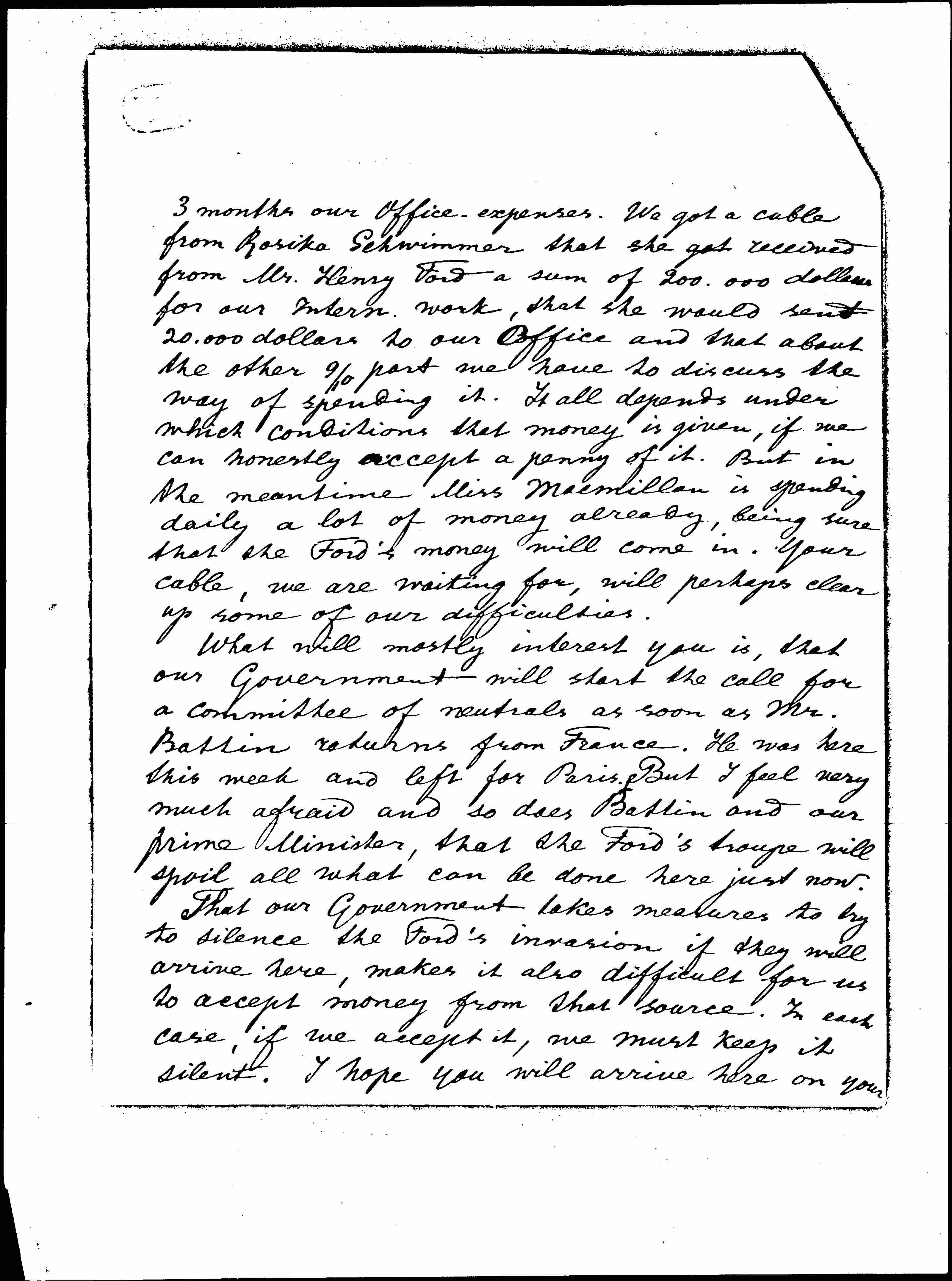 About the money. There is here now in cash, with all what had come lately through you and others in the U.S.A. 5400 guilders, and we have to pay to the printer for printing and exporting-expenses of the reports 4400 guilders. That are the round sums. So there is not even left enough money to pay for [page 2] 3 months our Office expenses. We got a cable from Rosika Schwimmer that she got received from Mr. Henry Ford a sum of 200,000 dollars for our Intern. work, that she would send 20,000 dollars to our Office and that about the other 9/10 part we have to discuss the way of spending it. It all depends under which conditions that money is given, if we can honestly accept a penny of it. But in the meantime Miss Macmillan is spending daily a lot of money already, being sure that the Ford's money will come in. Your cable, we are waiting for, will perhaps clear up some of our difficulties.