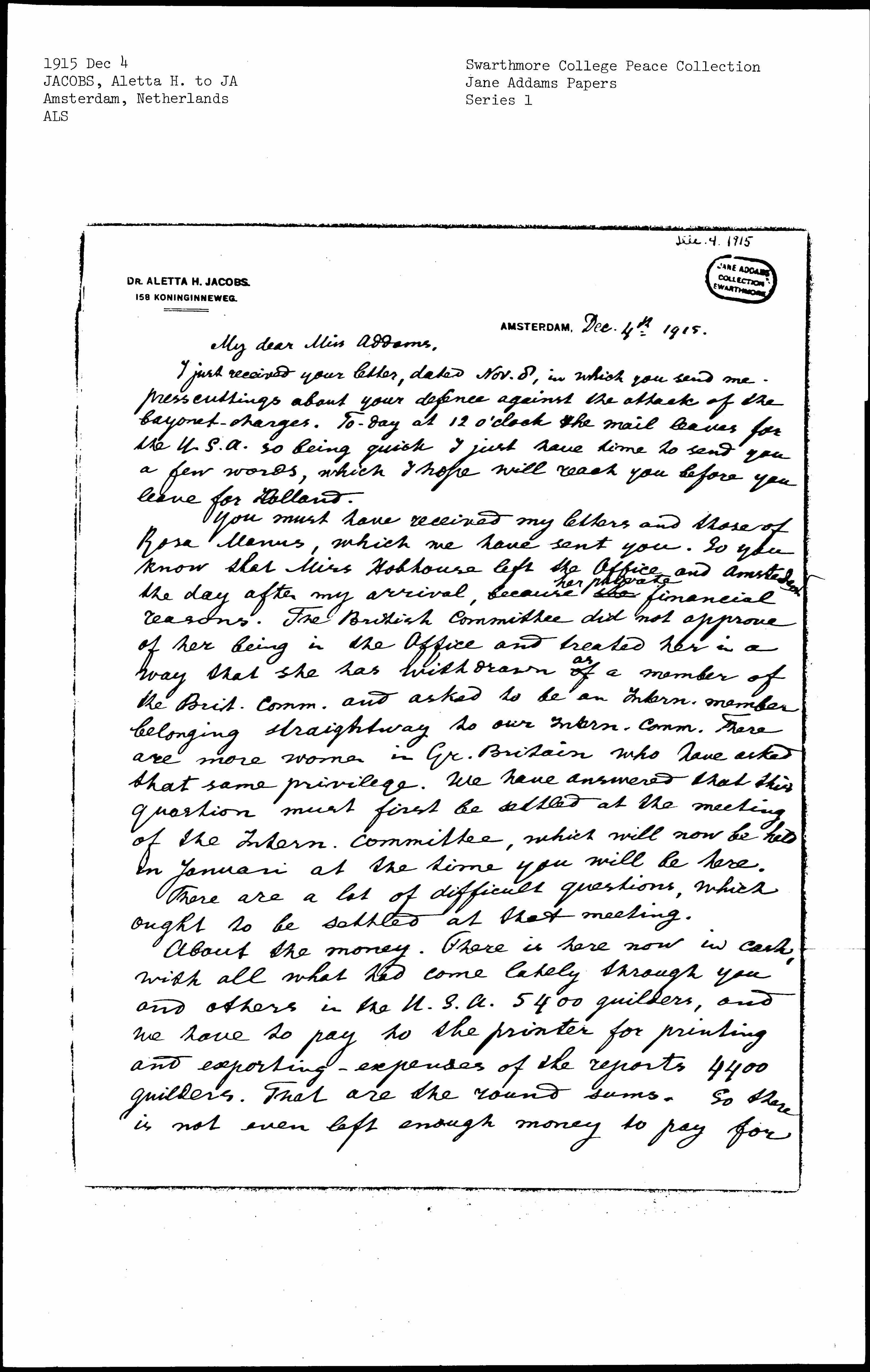 You must have received my letters and those of Rosa Manus, which we have sent you. So you know that Miss Hobhouse left the Office and Amsterdam the day after my arrival, because she <her private> financial reasons. The British Committee did not approve of her being in the Office and treated her in a way that she has withdrawn of <as> a member of the Brit. Comm. and asked to be an Intern. member belonging straightway to our Intern. Comm. There are more women in Gr. Britain who have asked that same privilege. We have answered that this question must first be settled at the meeting of the Intern. committee, which will now be held in [January] at the time you will be here.