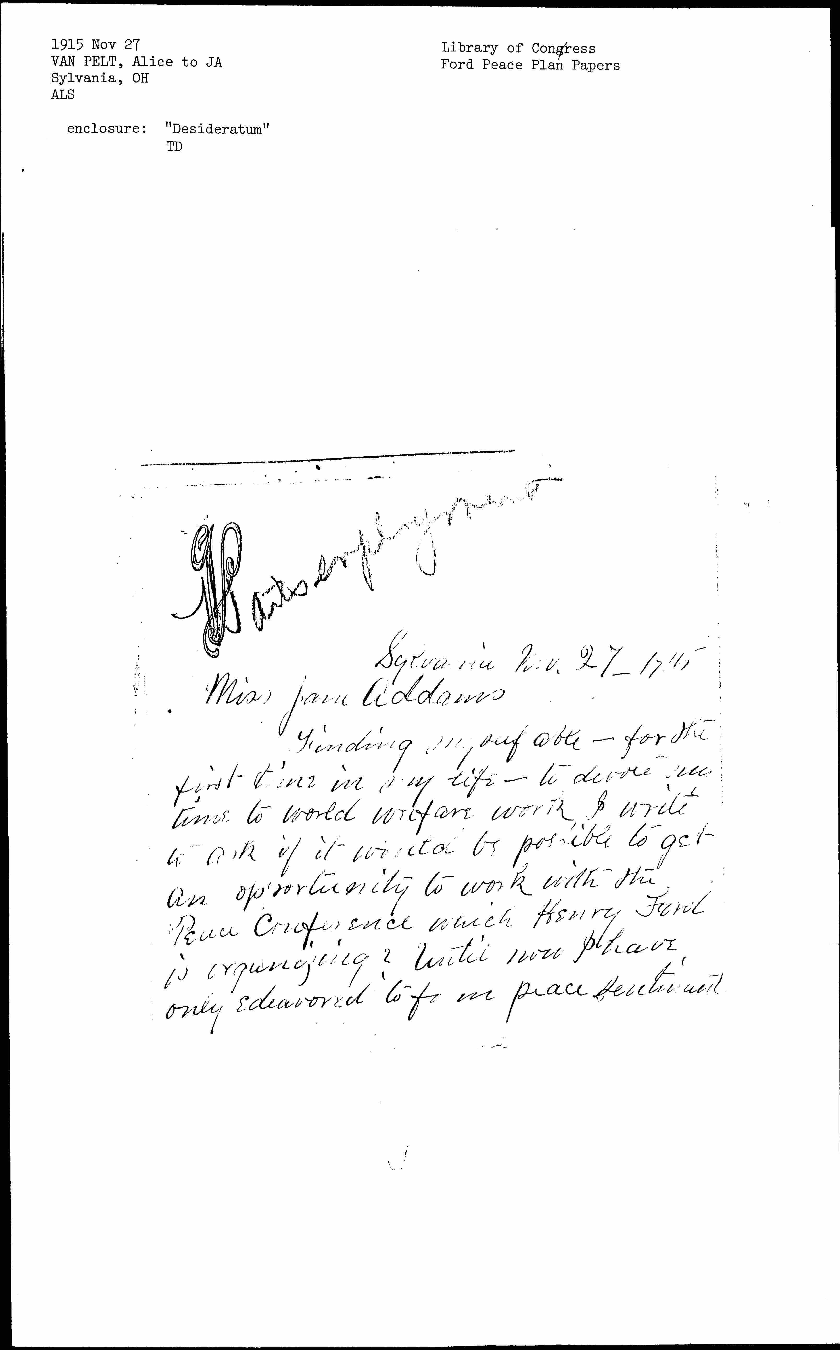 Finding myself able -- for the first time in my life -- to devote my time to world welfare work, I write to ask if it would be possible to get an opportunity to work with the Peace Conference which Henry Ford is organizing? Until now I have only [endeavored] to [form] peace sentiment [page 2] by papers before our Toledo Clubs, but much desire active service in these days of stress.