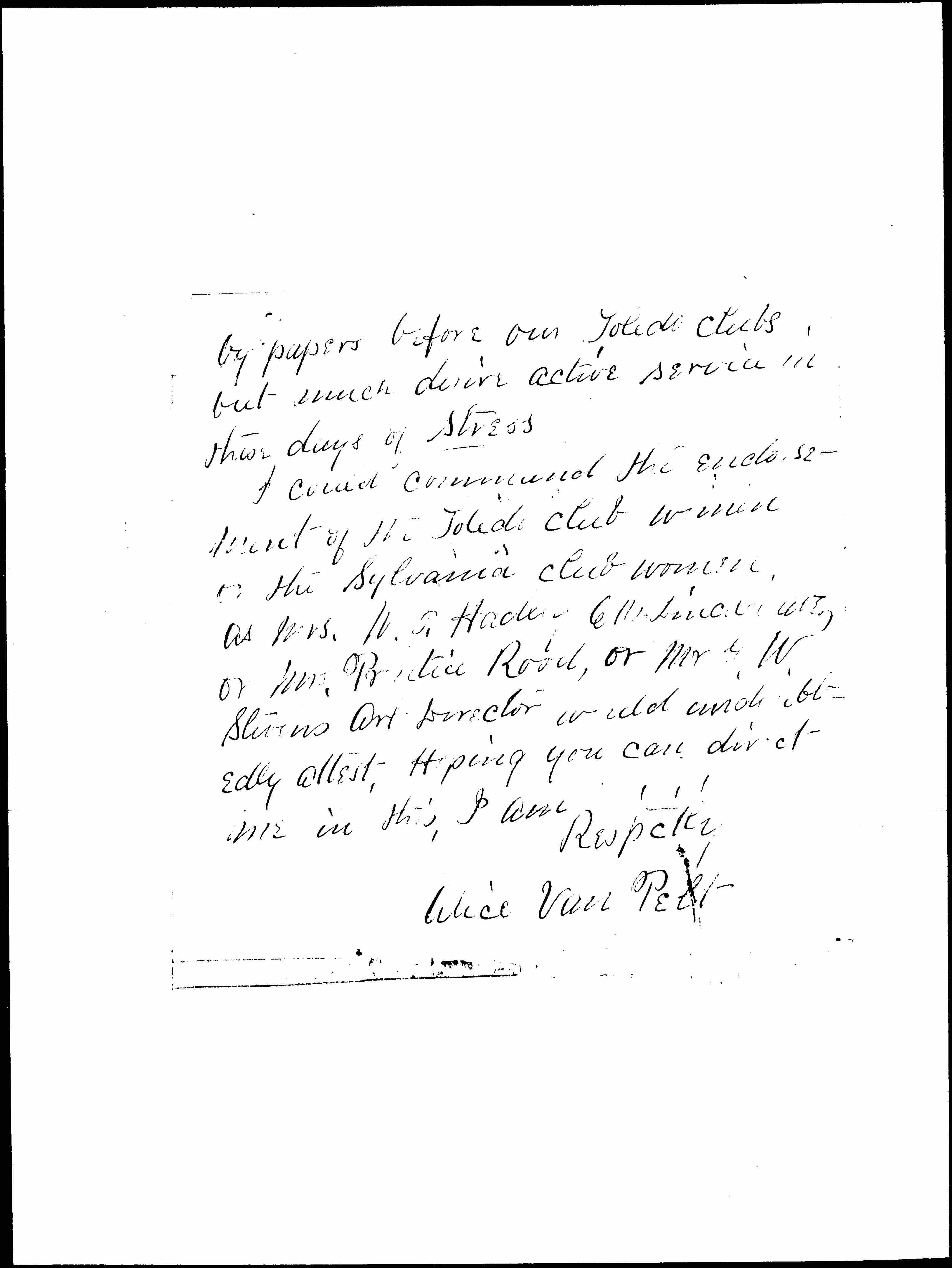 I could command the endorsement of the Toledo Club women or the Sylvania Club women, as Mrs. W. J. Hadley, [E M Sinclair atty?] or Mrs. Prentice Rood, or Mr. G. W. Stevens Art Director would undoubtedly attest. Hoping you can direct me in this, I am