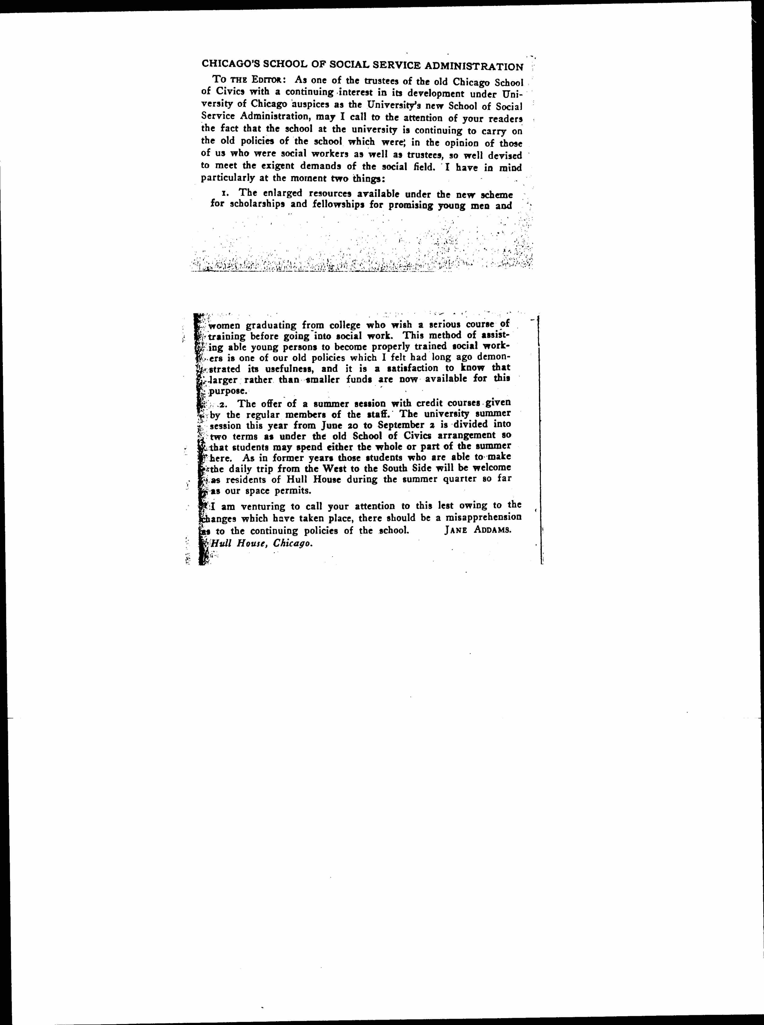 TO THE EDITOR: As one of the trustees of the old Chicago School of Civics with a continuing interest in its development under University of Chicago auspices as the University's new School of Social Service Administration, may I call to the attention of your readers the fact that the school at the university is continuing to carry on the old policies of the school which were; in the opinion of those of us who were social workers as well as trustees, so well devised to meet the exigent demands of the social field. I have in mind particularly at the moment two things: