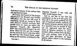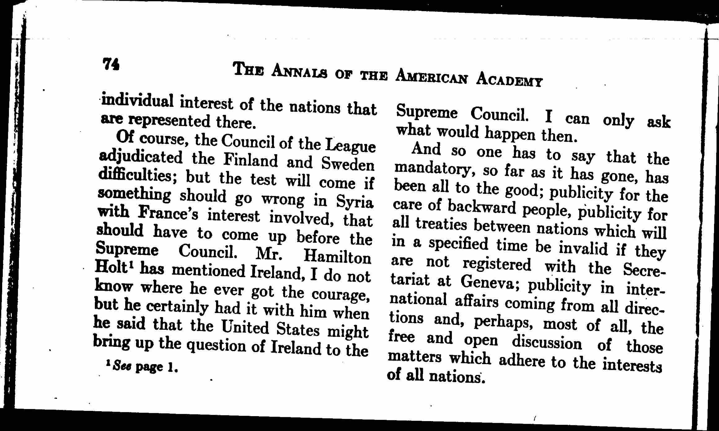Of course, the Council of the League adjudicated the Finland and Sweden difficulties; but the test will come if something should go wrong in Syria with France's interest involved, that should have to come up before the Supreme Council. Mr. Hamilton Holt[1] has mentioned Ireland, I do not know where he every got the courage, but he certainly had it with him when he said that the United States might bring up the question of Ireland to the Supreme Council. I can only ask what would happen then.
